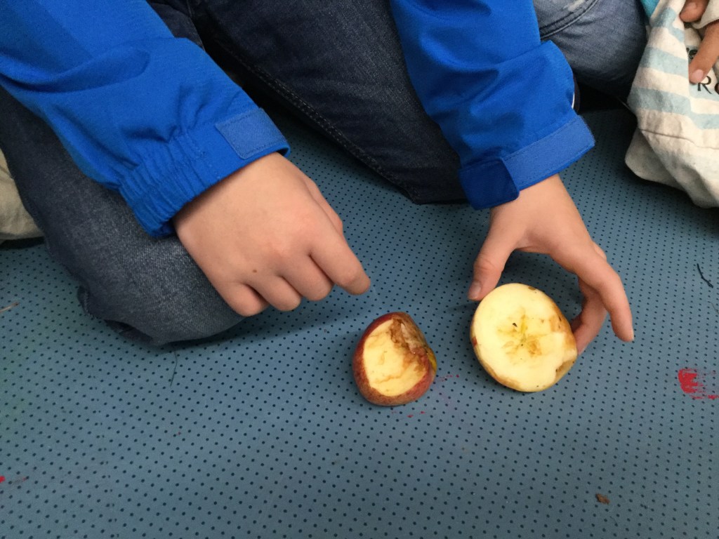 Wir haben glatte, raue, große, kleine, rote und grüne Äpfel angeschaut.