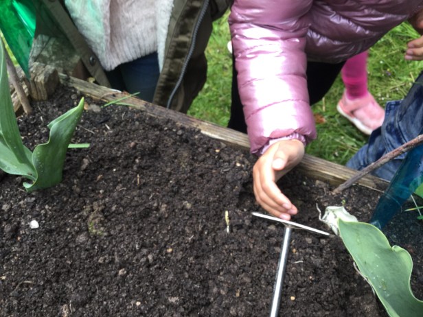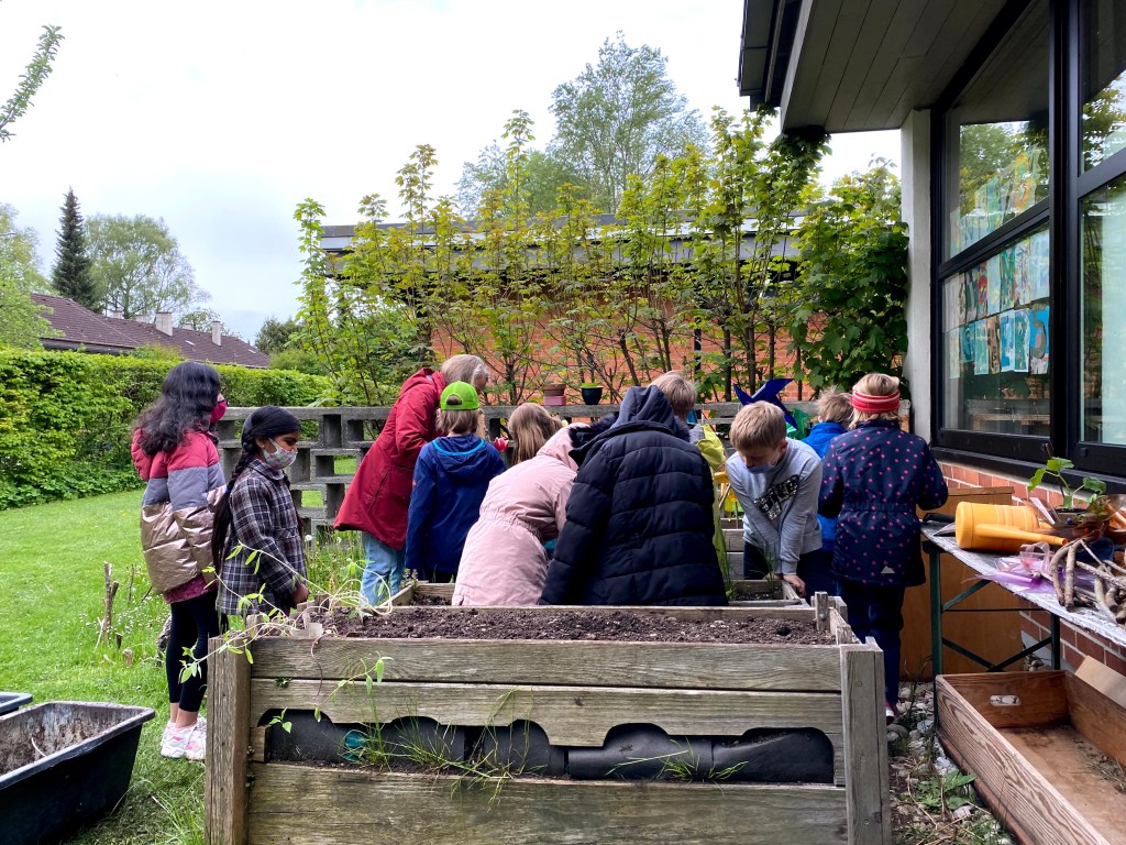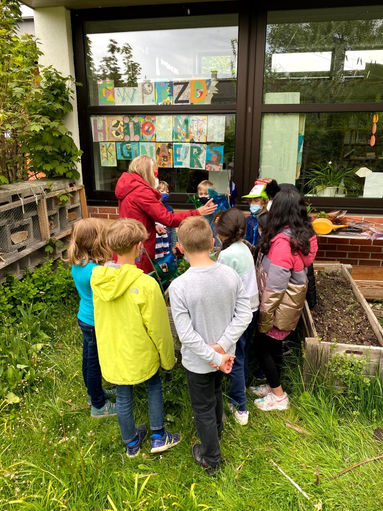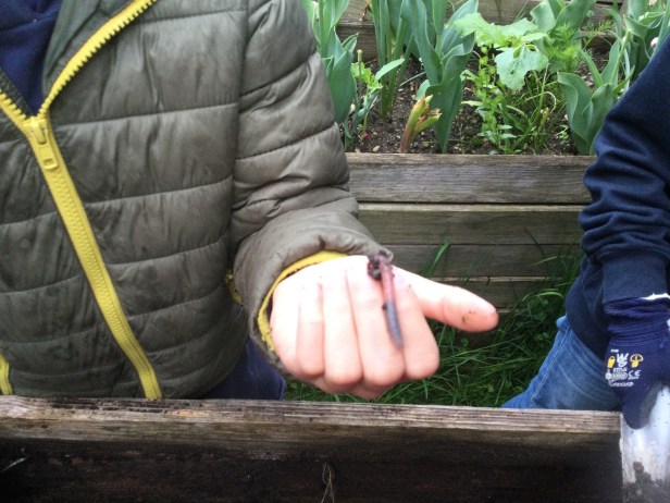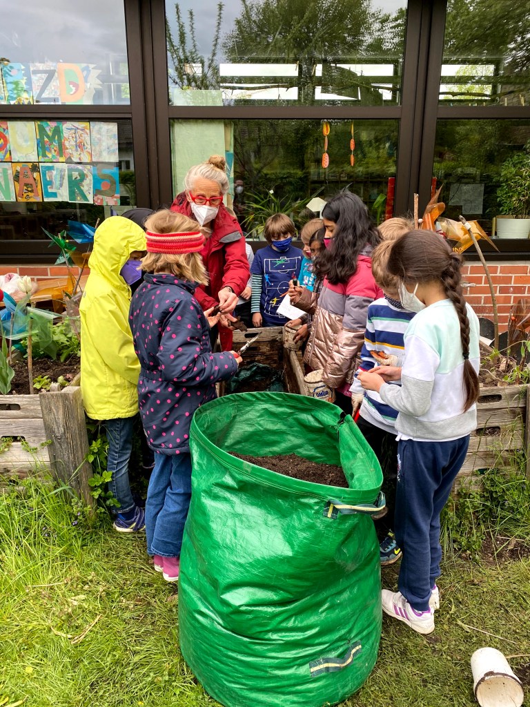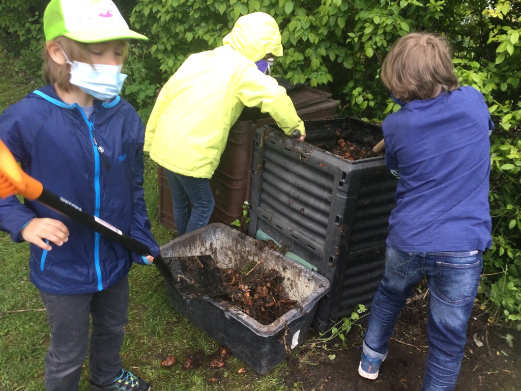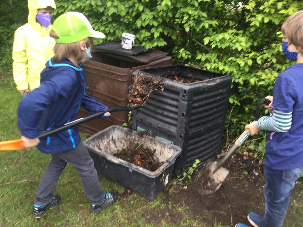Maxi Die super Gartenarbeit Meine Aufgabe war den Kompost aus der Tonne zu holen. Sahar und Friedrich Ich habe die verblühten Tulpen ausgerissen. Wir haben die Zwiebeln von der Blume getrennt. Die Zwiebeln heben wir auf für nächstes Jahr. Clara Ich musste ein Loch graben um den Baum zu pflanzen. Mein Papa ist gekommen um zu helfen. Ben Im Garten war meine Aufgabe die ganze Erde aus dem Hochbeet weg zu graben. Danach haben wir Holz rein getan um es zu lüften. Zahra Wir haben die Erde in eine große Plastiktüte geschaufelt. Charlotte Wir haben ein Experiment gemacht: Wir haben eine Schüssel voll Kompost genommen und gezählt wie viele Tiere wir finden. Kilian Ich habe entdeckt, dass 40 Regenwürmer in einer Schüssel voll Erde waren. Beim Arbeiten merkte ich, dass das sehr anstrengend ist. Maxi Es waren viele Regenwürmer, ein Tausendfüßler, vier Kellerasseln,eine Schnecke und eine Larve. Das war eine ganz tolle Arbeit. Friedrich Besonders interessant fand ich wie viele Tiere in einer vollen Schüssel Erde sind. Ich entdeckte, dass es auch weiße, rote oder gelbe Minitausendfüßler gibt. Die fühlten sich an, wie wenn dich jemand leicht kitzelt. Ich dachte: „Wie geht es anderen Kindern in anderen Ländern, wenn sie den ganzen Tag ohne Pause arbeiten müssen.“ Lennard Meine Arbeit war die Stöcke zu zerkleinern und ins Hochbeet zu tun. Ich habe einen Hundertfüßler auf meiner Hand gehabt. Er war sehr schnell. Lias Wir haben alle Erde, die Stöcke, den Kompost und die Erde wieder ins Beet getan, wie bei einer Lasagne. Diksha Mit meinem Rechen hat Frau Hänel die Erde gelockert und glatt gemacht, aber dann hat es angefangen zu regnen. Wir hatten viel Spaß im Garten zu arbeiten.