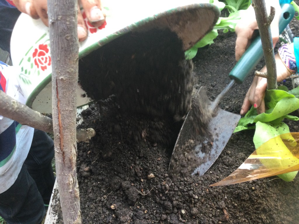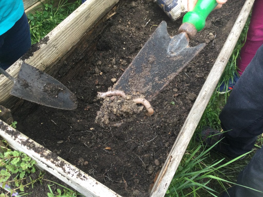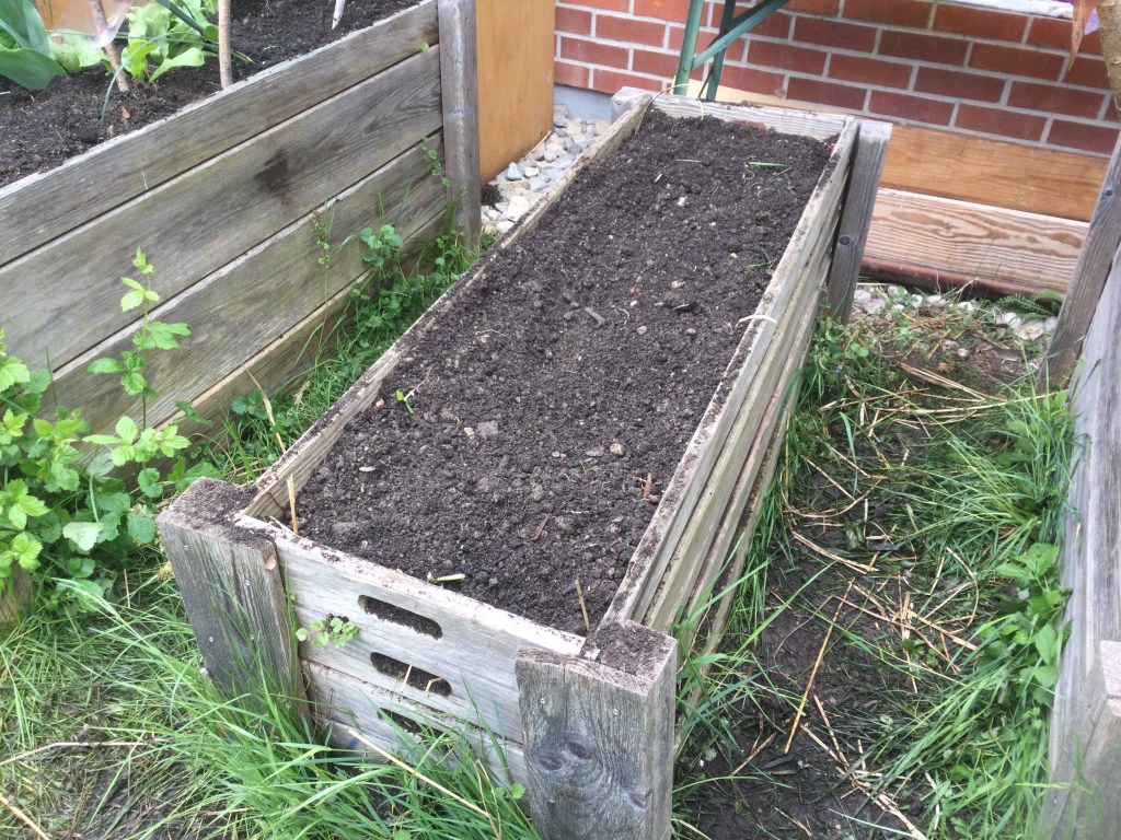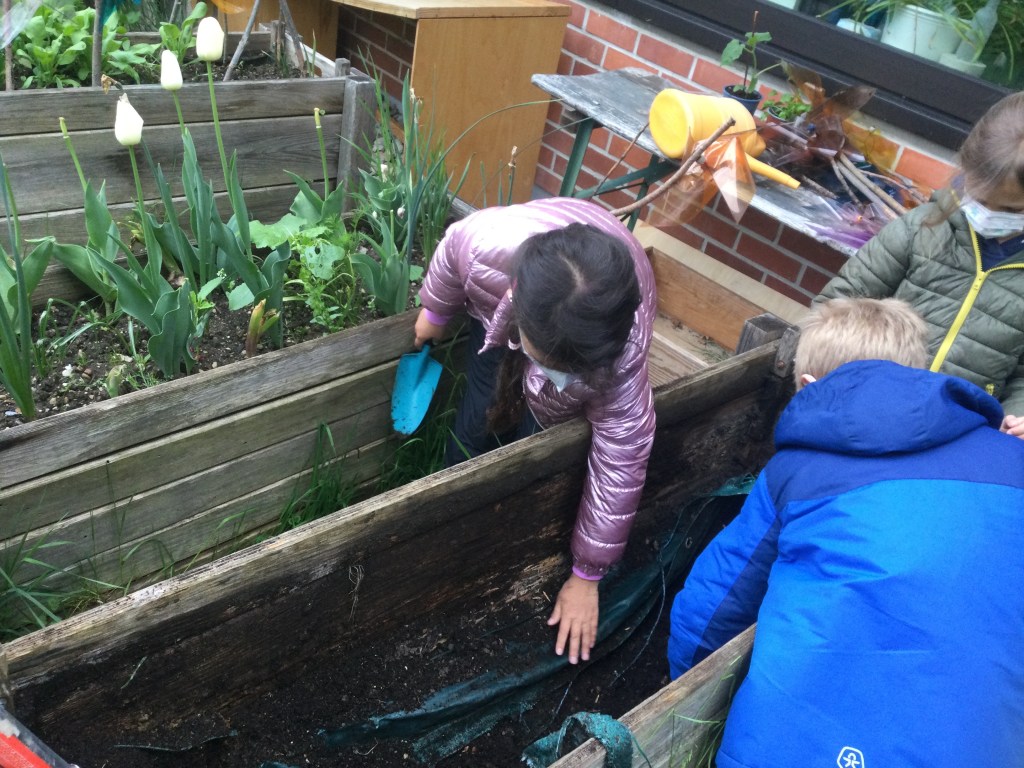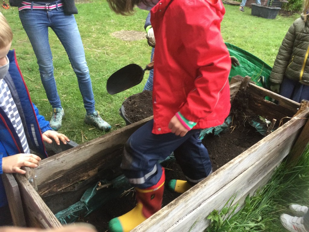 Wir haben die Erde aus dem Hochbeet geschaufelt.