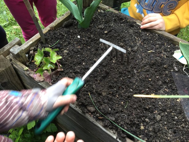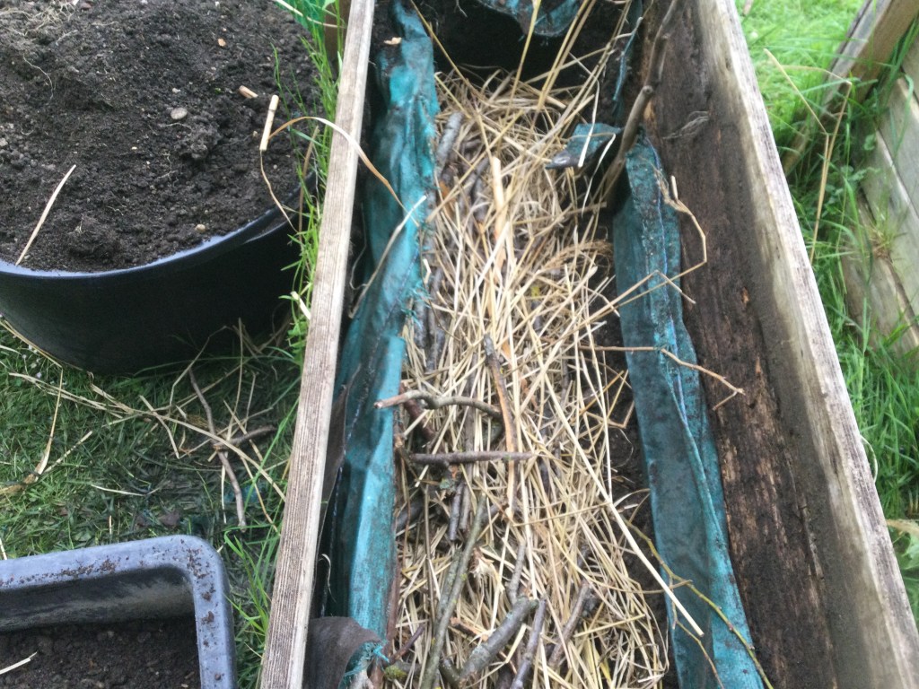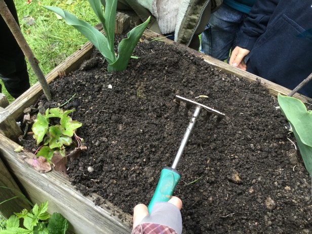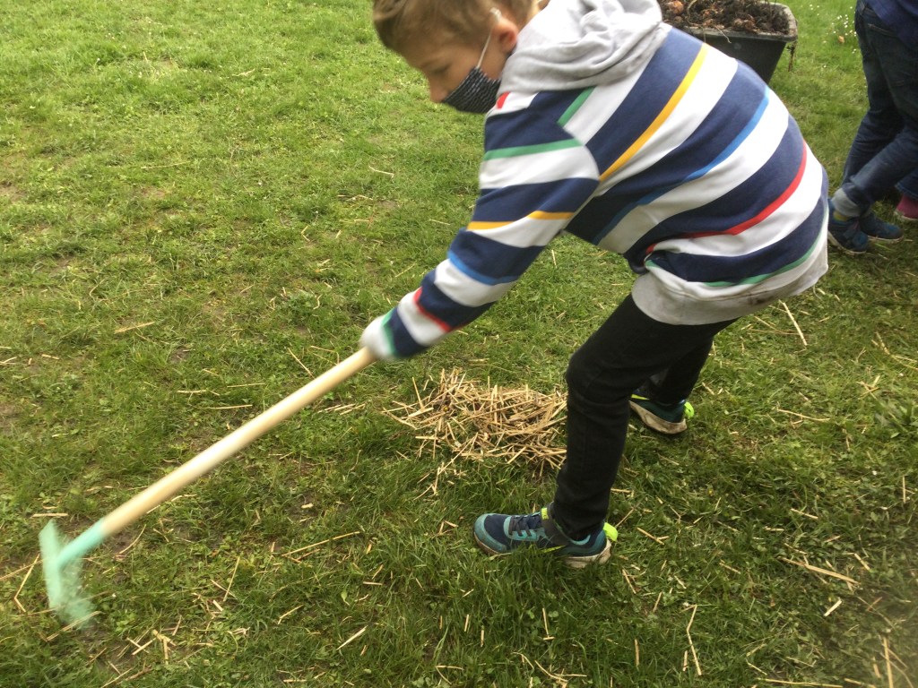 Wir schaufeln die Erde aus dem Hochbeet. Mit einer Schere haben die Stöcke zerkleinert. Mit einem Rechen habe ich das Stroh zusammengerecht. Am Schluss haben wir die Erde und die Stöcke in das Hochbeet gefüllt. Dazu kam auch noch Kompost!