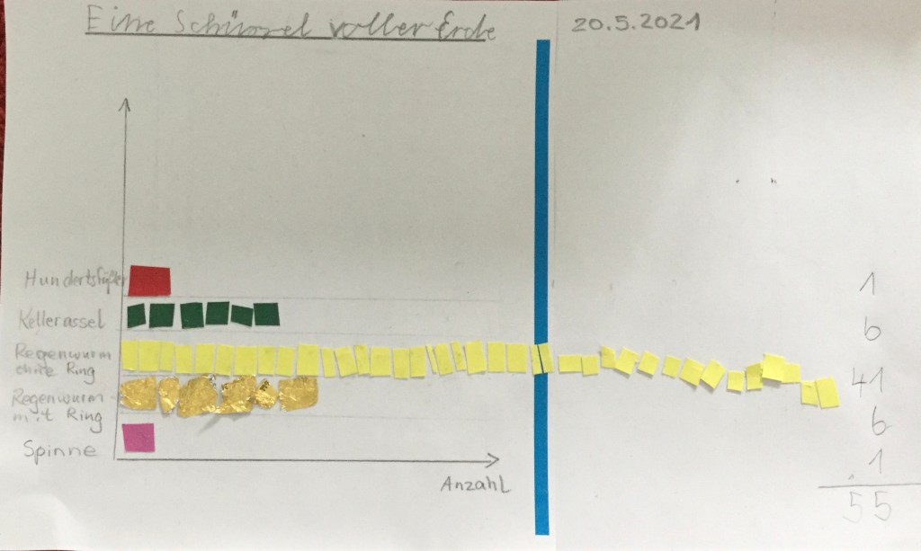 Wir haben aus den Kompost eine Schale Erde geholt. Dann haben wir die Tiere gezählt.
