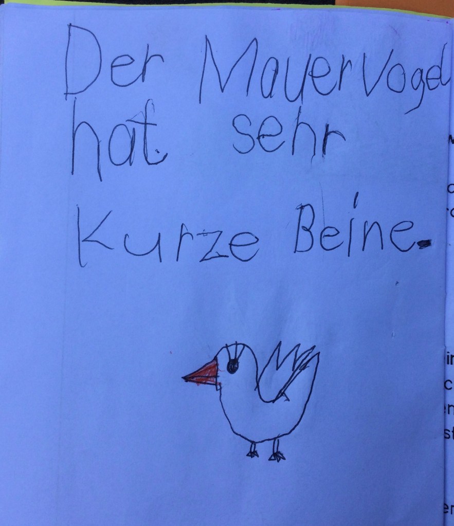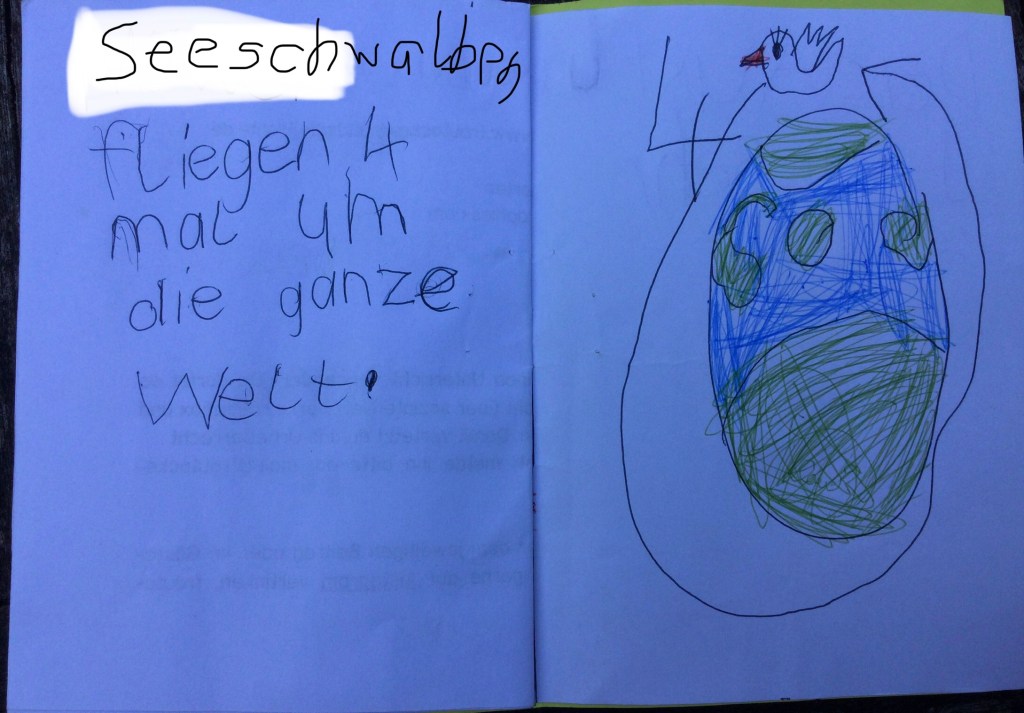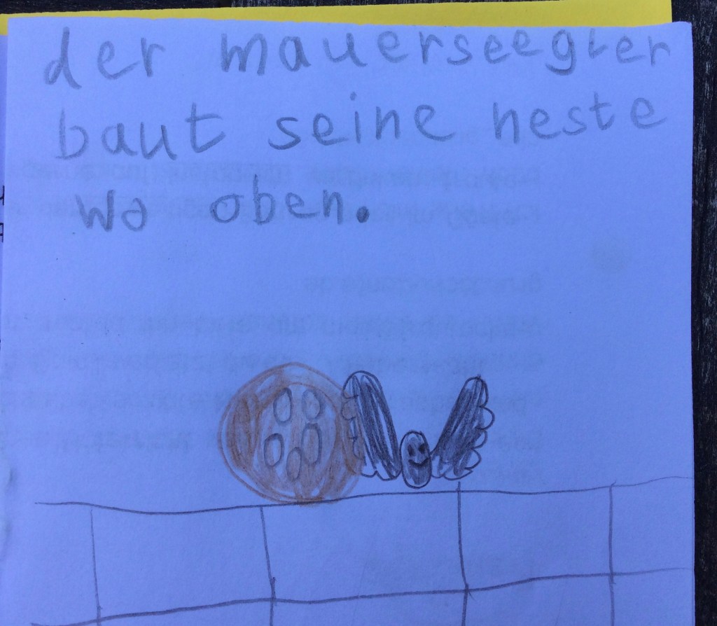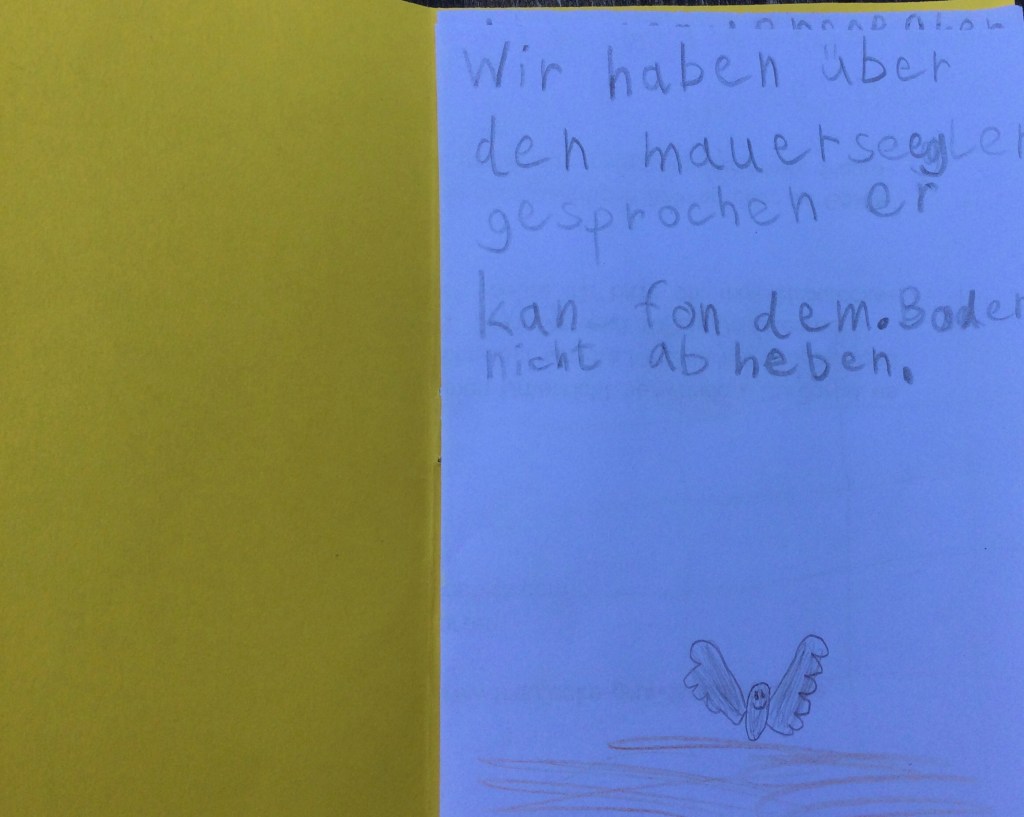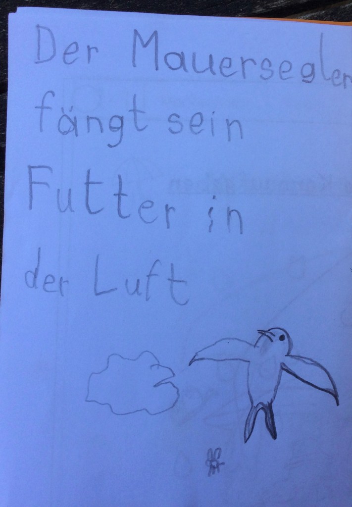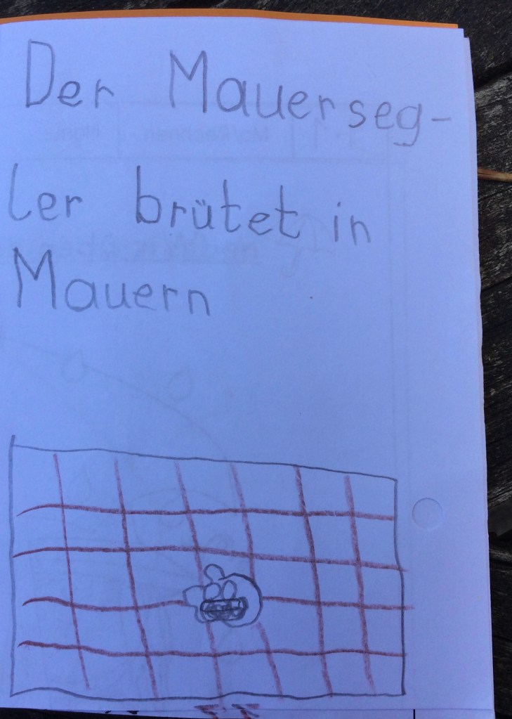 - Da hat der Opa von Ida uns was über den Mauersegler erzählt: Er fliegt immer. Außerdem hat Opa von der Ida erzählt, dass der Mauersegler nur mit einem Auge schläft.