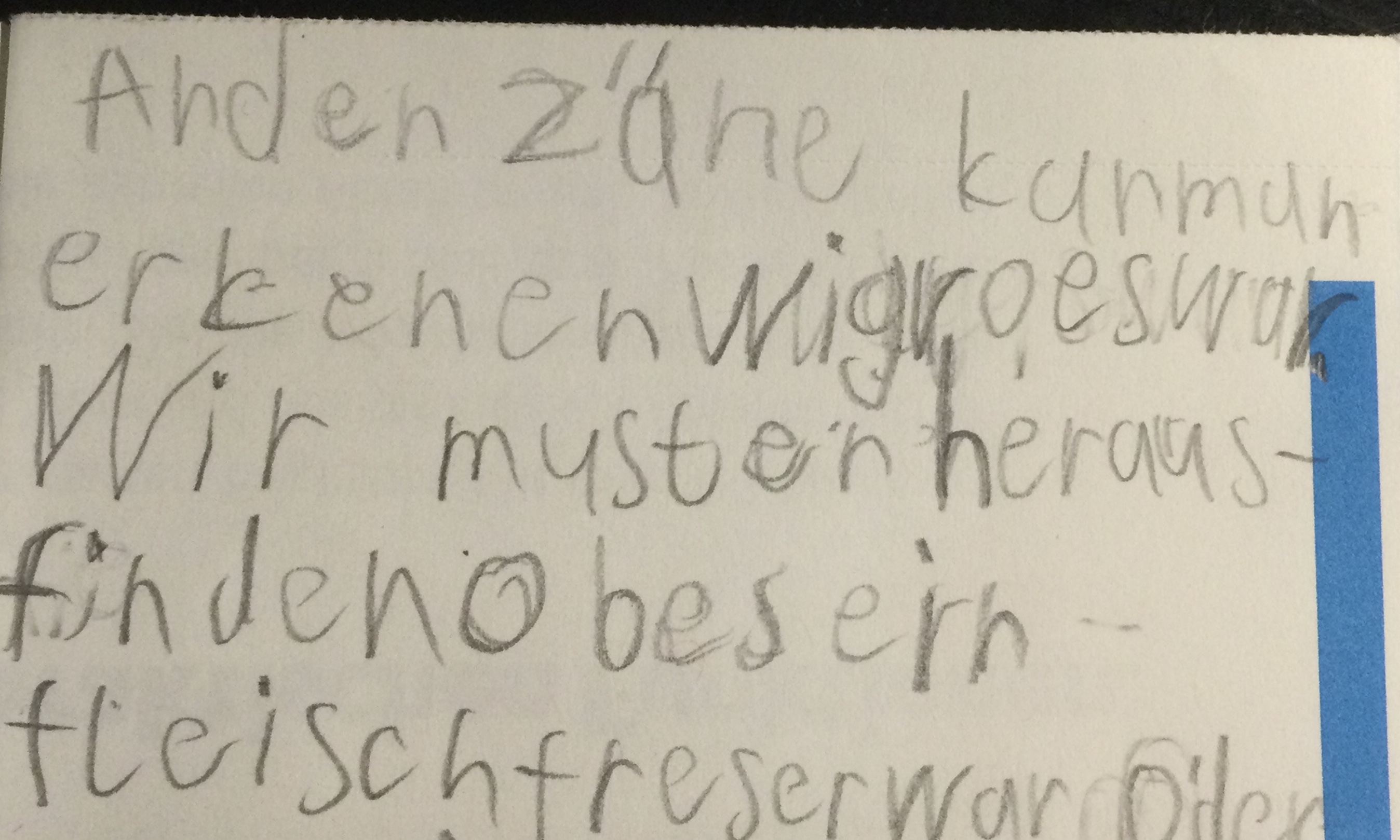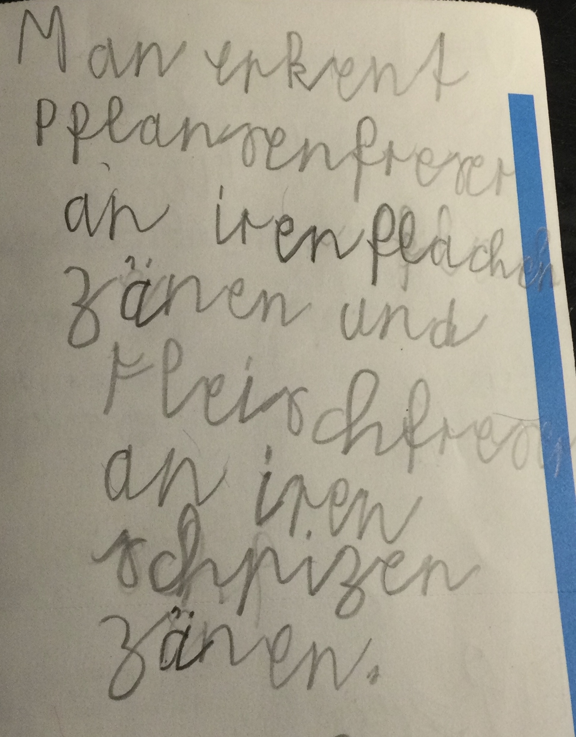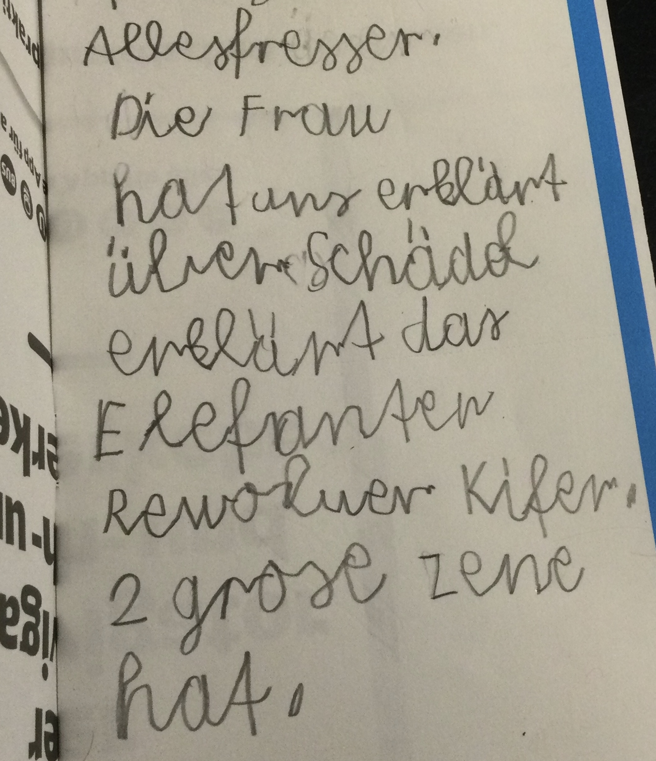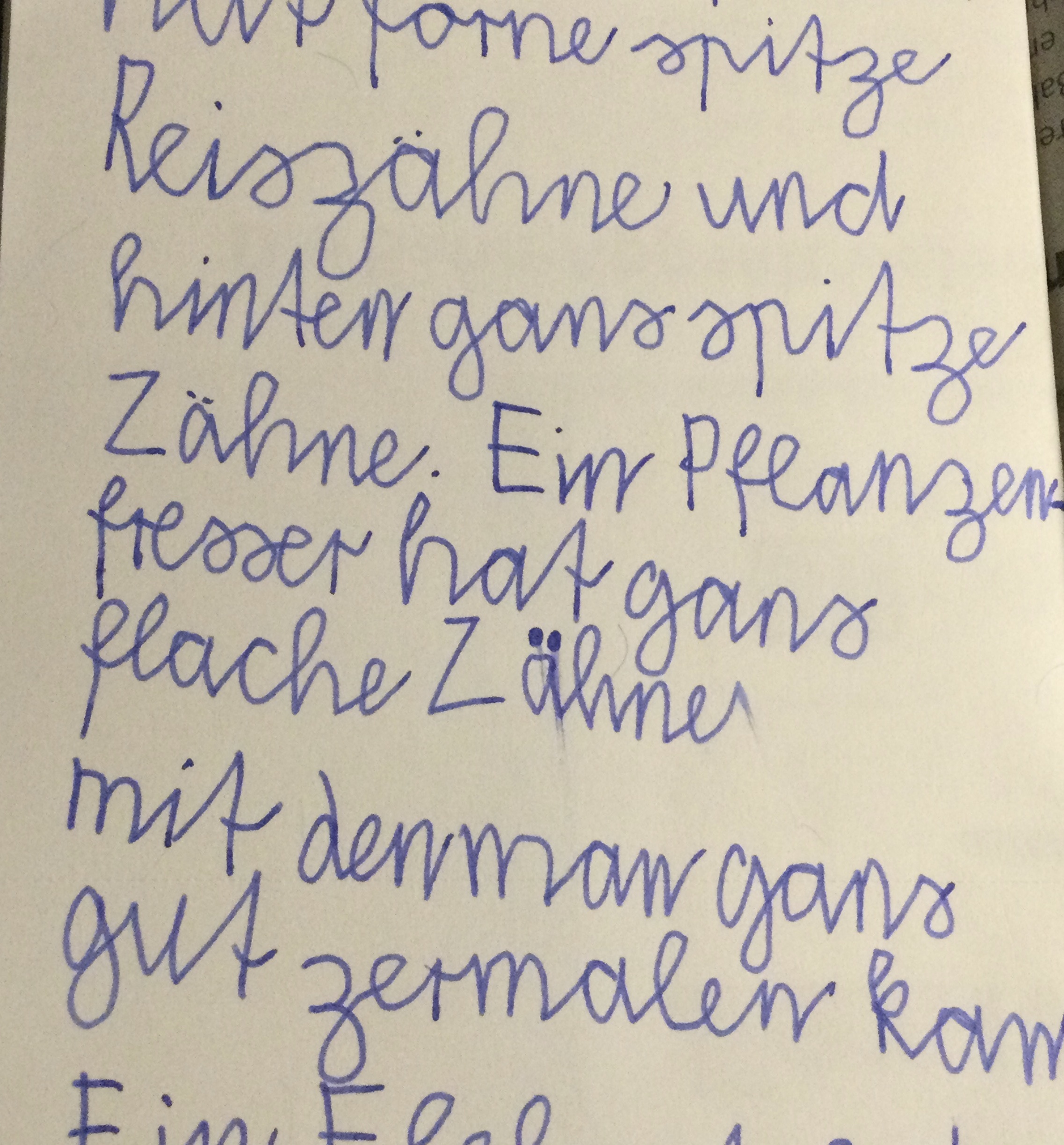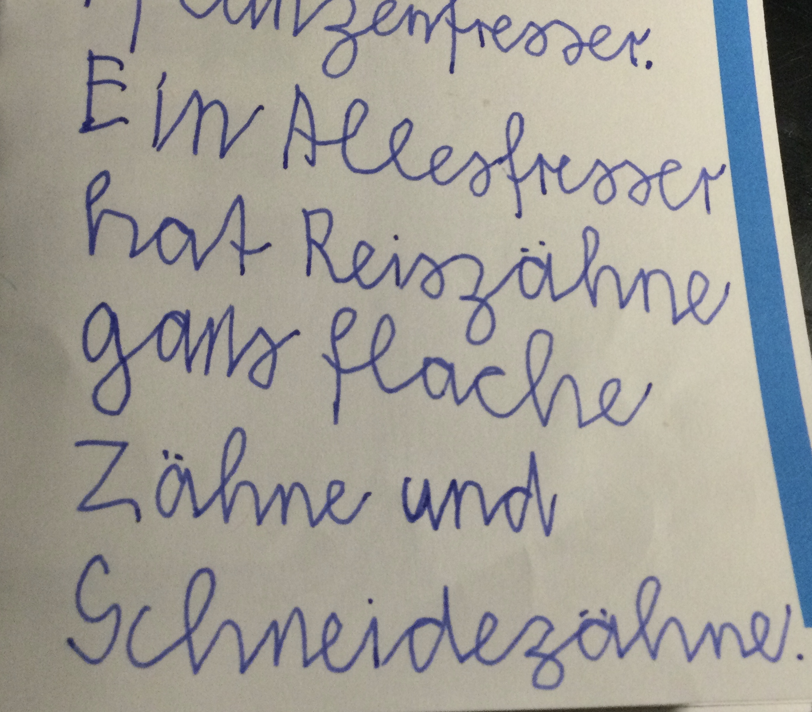 Wir haben uns zuerst die Eckzähne angeschaut und haben herausgefunden, dass es ein Fleischfresser ist. Dann haben wir die Backenzähne angeschaut, dann war es klar es ist ein Allesfresser.