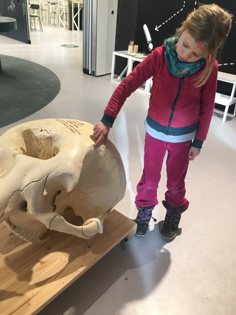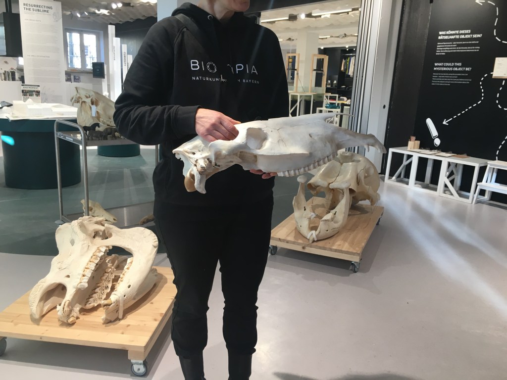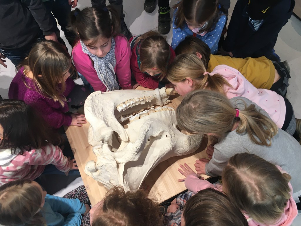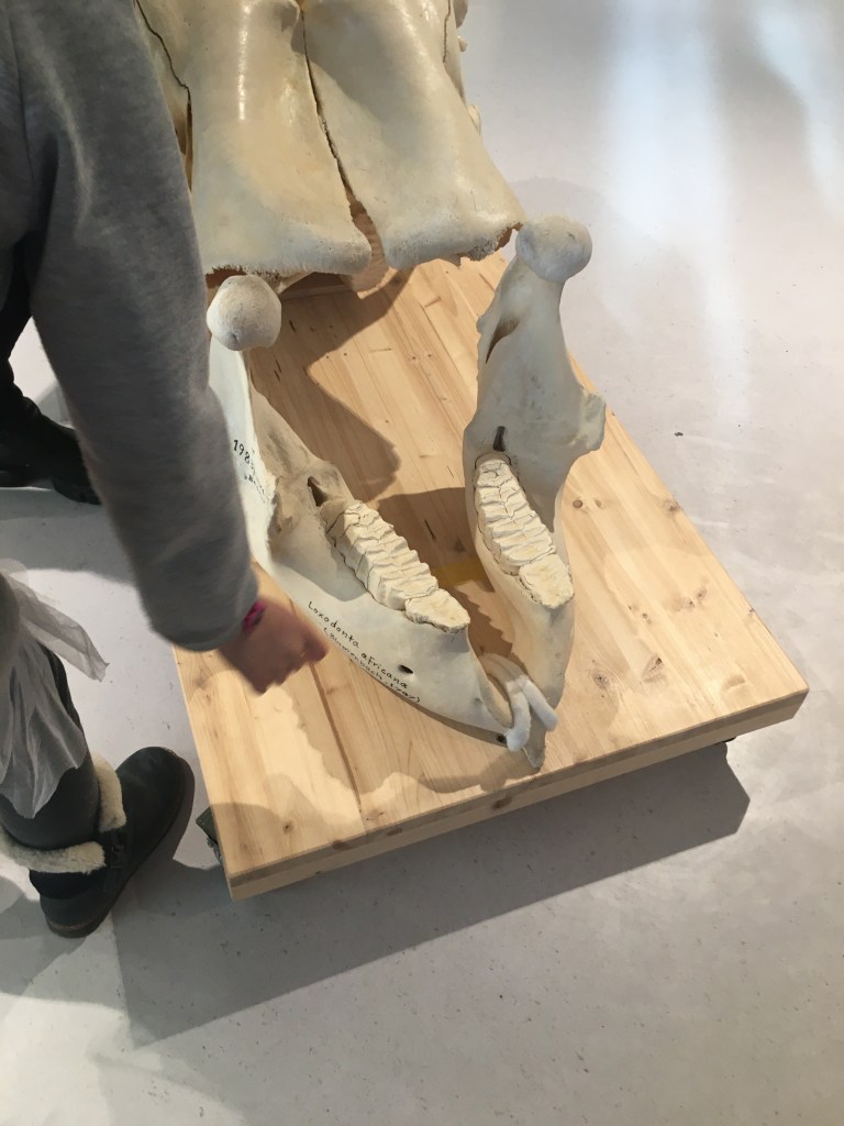 Hier konnten wir eine Blume riechen, die schon lange ausgestorben ist.Die Frau hat uns erklärt, dass Kiefer viel verraten. Das ist der Schädel eines Pferdes Pflanzenfresser haben die Augen seitlich. Der Elefantenschädel ist schon über 200 Jahre alt. Er lebte bis 1791 in Afrika. Es war ein Männchen.Der Elefant hat ein Revolver Gebiss .Wir haben erfahren, dass der Elefant an der Seite Muskeln hat, die die Ohren bewegen.