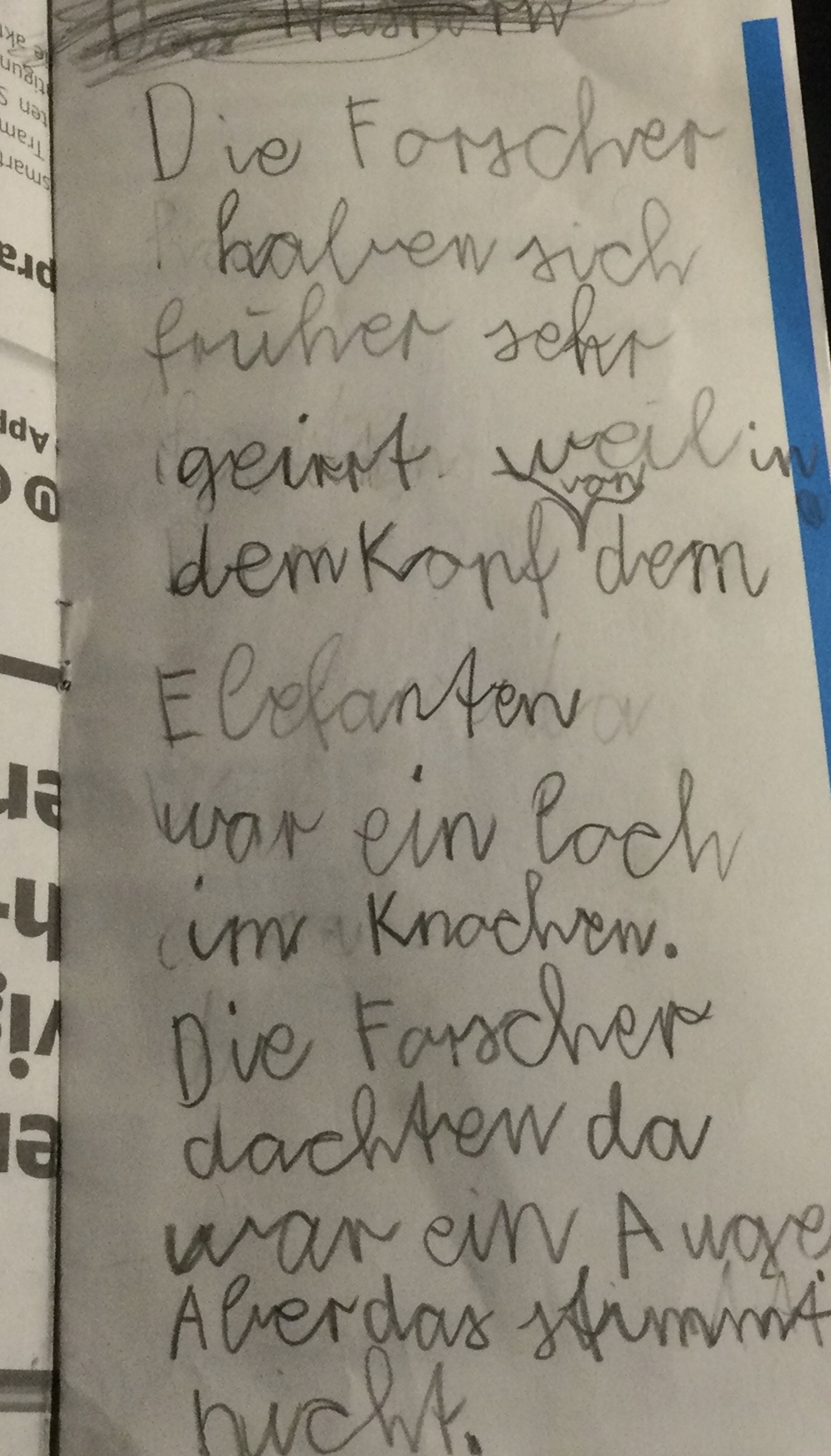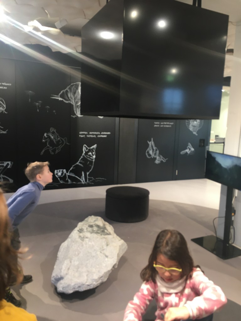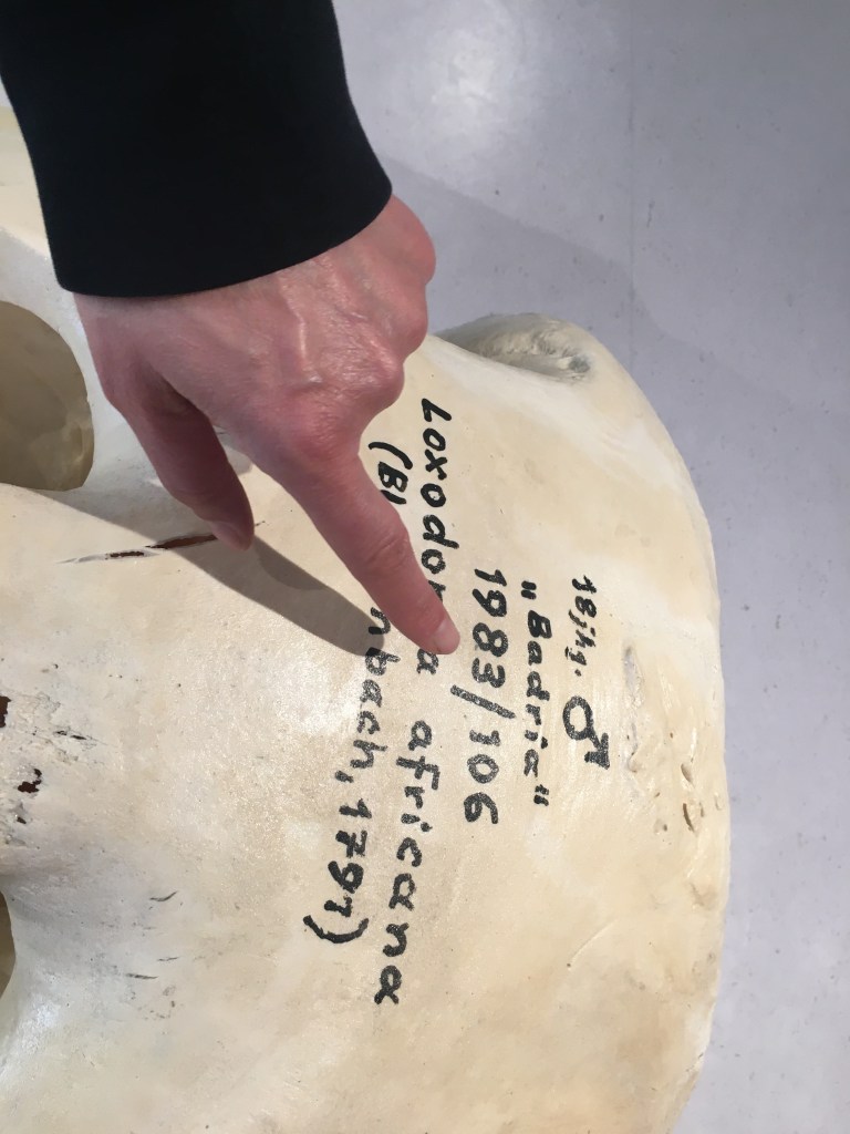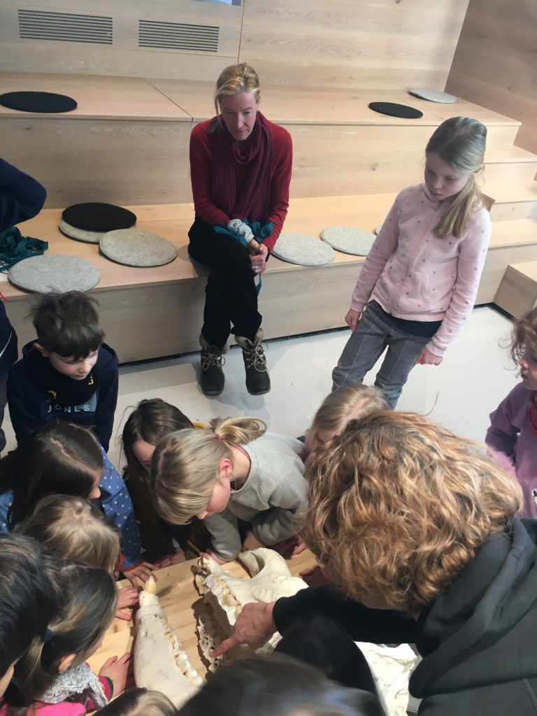 Hier konnten wir eine Blume riechen, die schon lange ausgestorben ist.Die Frau hat uns erklärt, dass Kiefer viel verraten. Das ist der Schädel eines Pferdes Pflanzenfresser haben die Augen seitlich. Der Elefantenschädel ist schon über 200 Jahre alt. Er lebte bis 1791 in Afrika. Es war ein Männchen.Der Elefant hat ein Revolver Gebiss .Wir haben erfahren, dass der Elefant an der Seite Muskeln hat, die die Ohren bewegen.