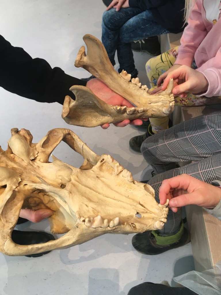 Wir haben die Zähne genau angeschaut und uns überlegt wie groß der Schädel ist. Welches Tier könnte es also sein?