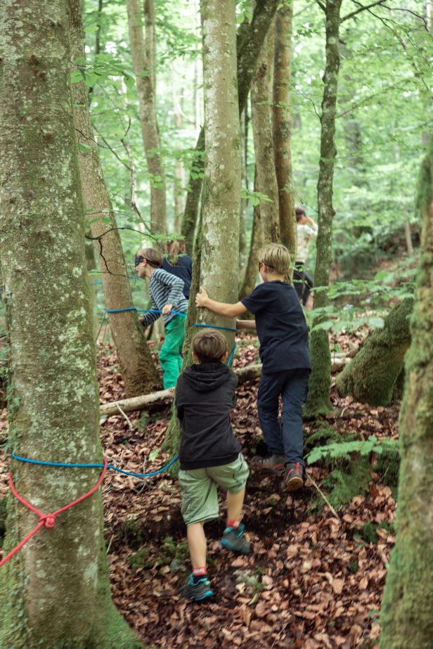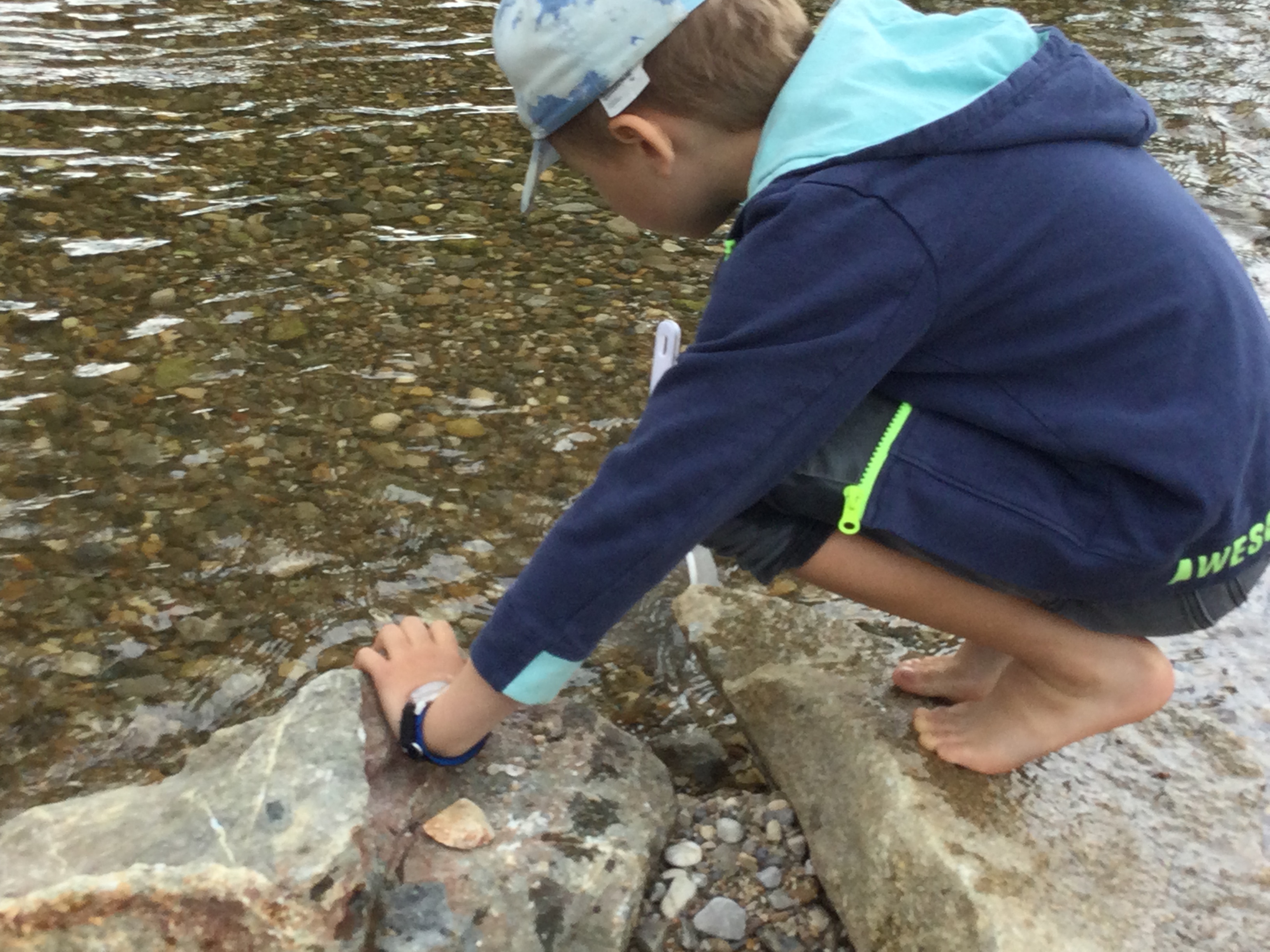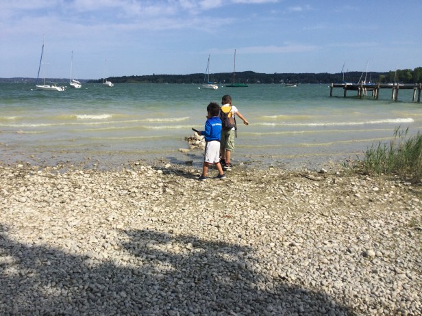 Der Würmgletscher hat die Steine vor sich her geschoben und auch an den Seiten aufgetürmt. Unten ist der Steinstaub übrig geblieben. Der Lehm lässt das Wasser nicht versickern. Deshalb können wir im See schwimmen. Zum Wald mussten wir viele Stufen hochsteigen.