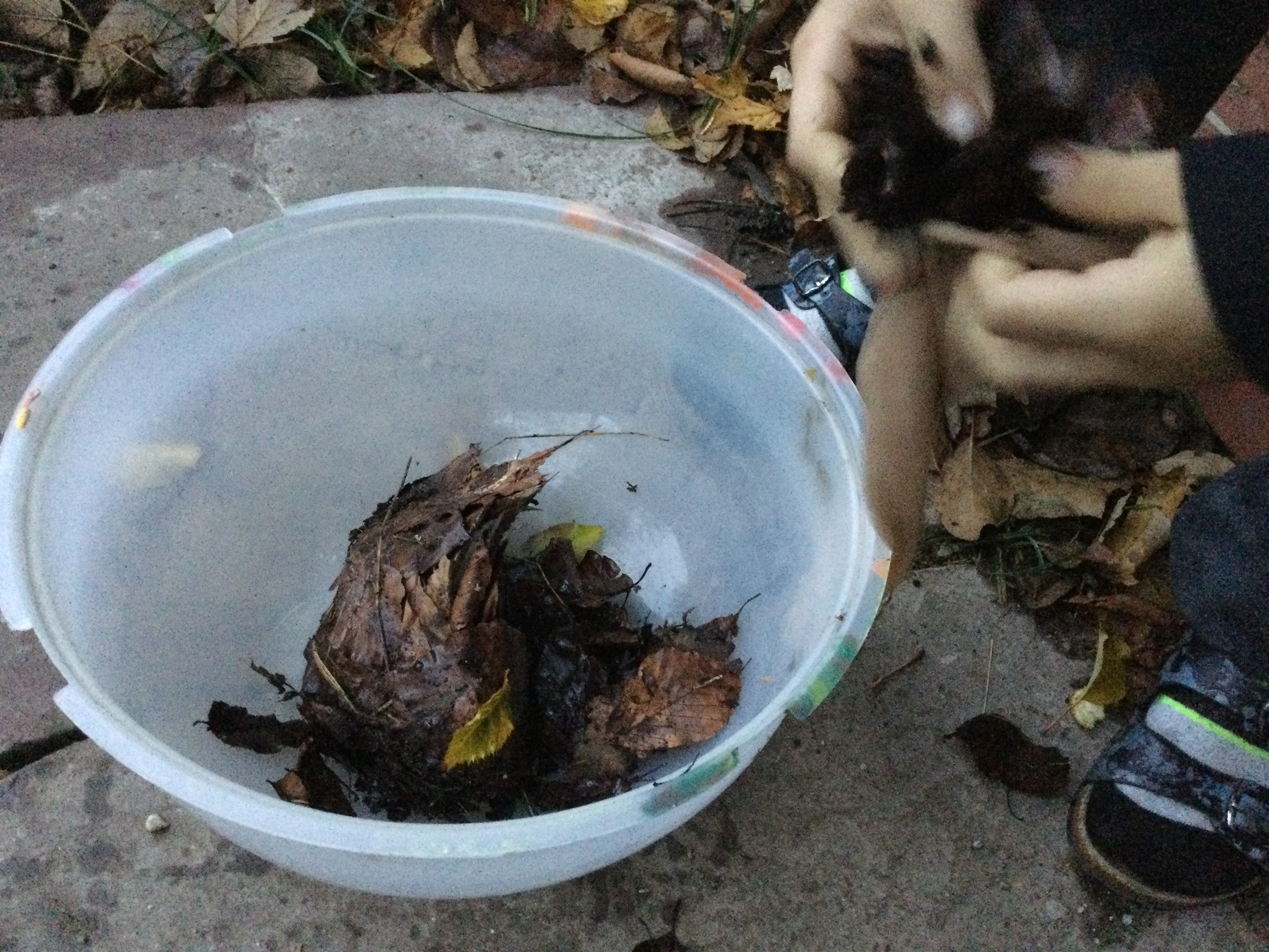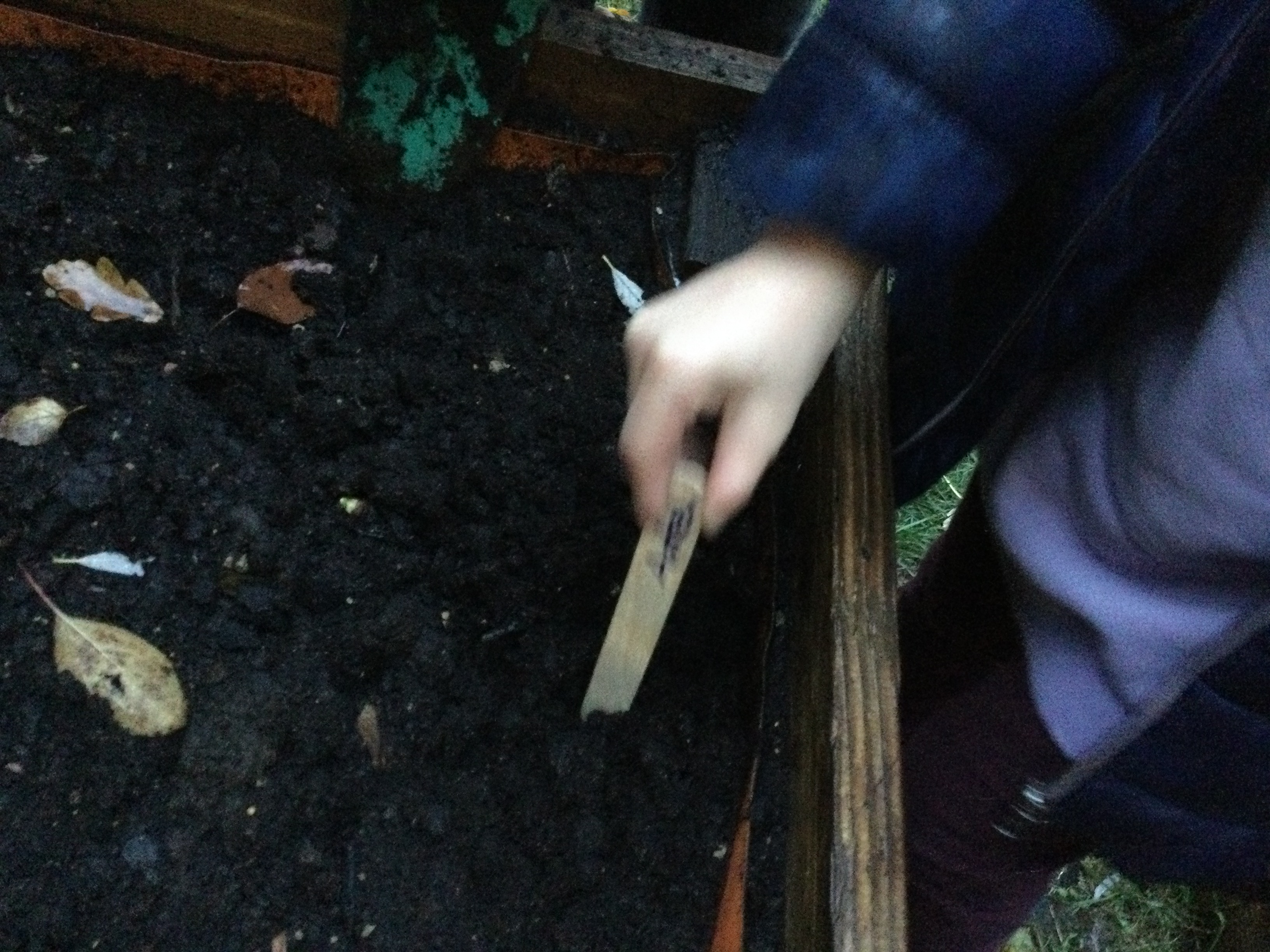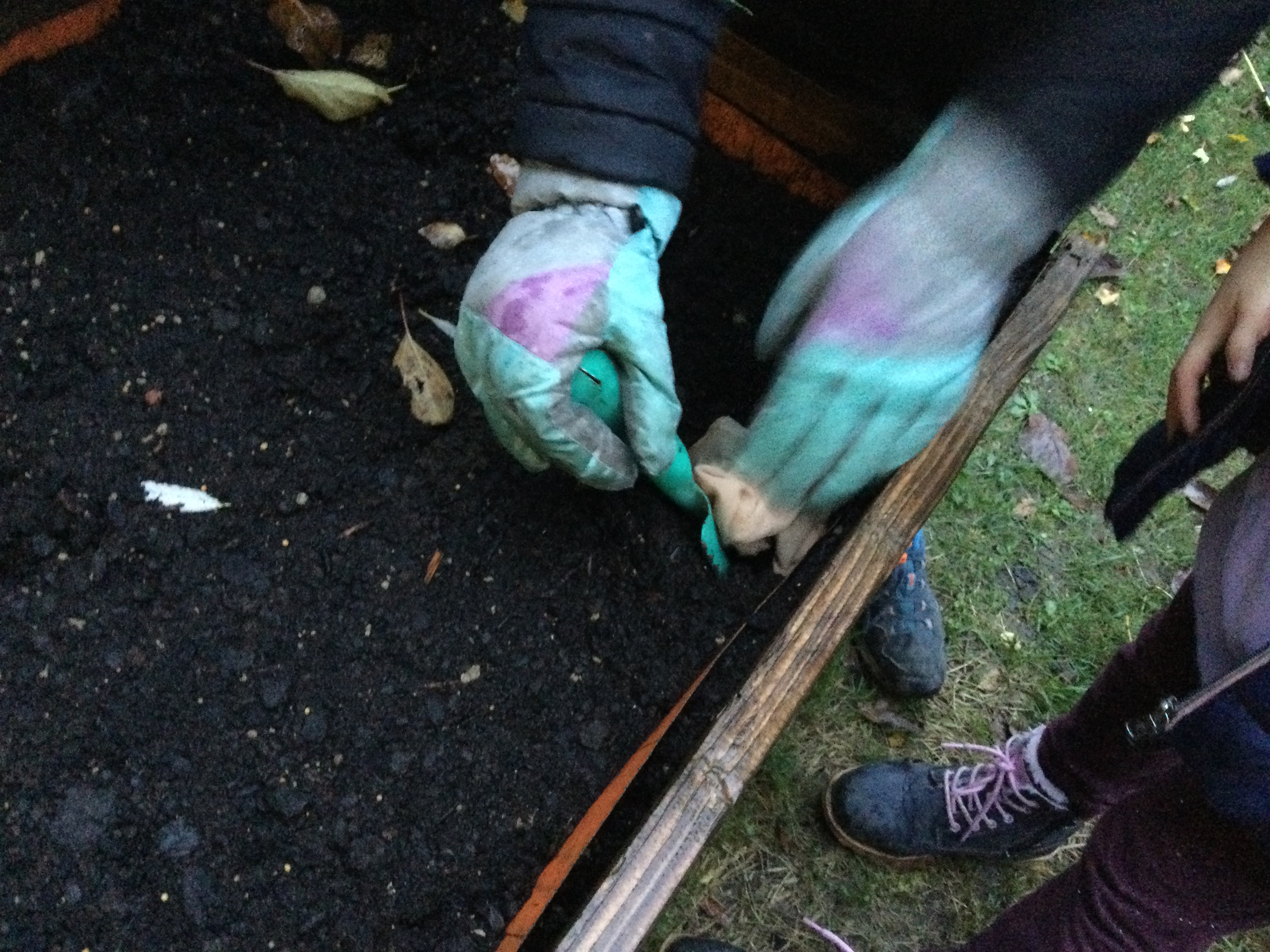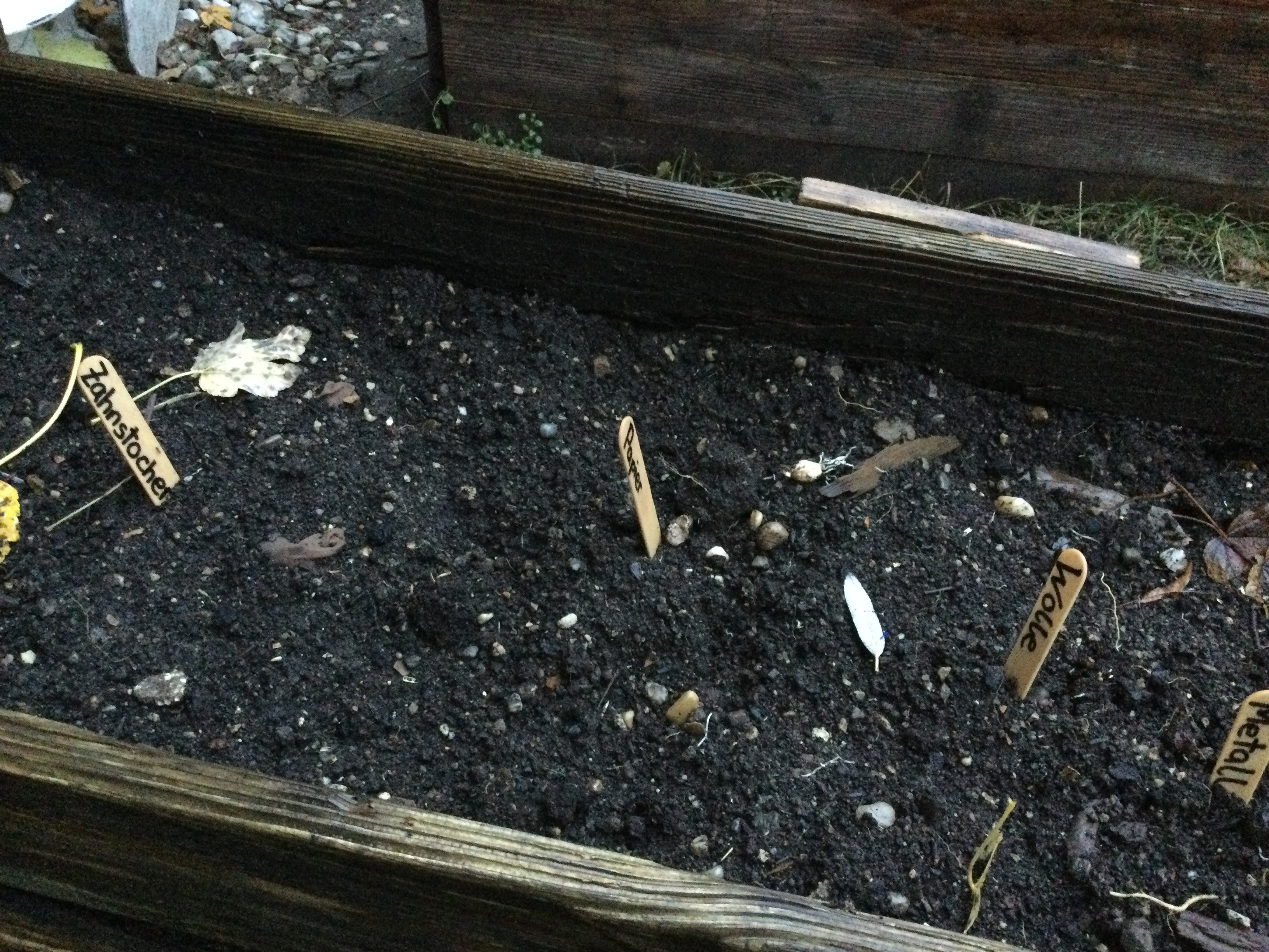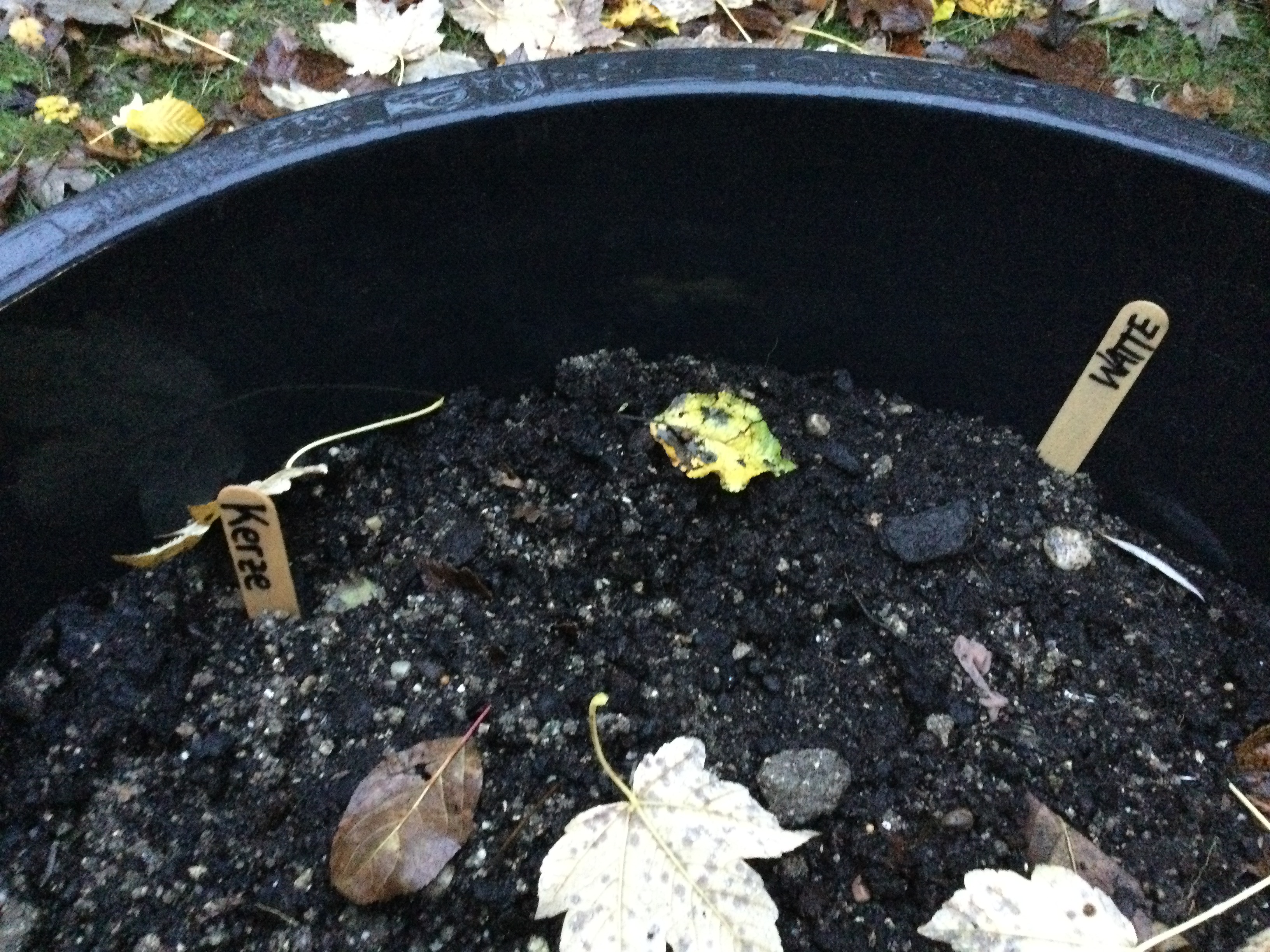 Wir wollen wissen: Was passiert mit Stoffen in der Erde. Wir graben verschiedene Sachen in Seidenstrümpfen ein. Ein Strumpf mit Kompost, ein Strumpf nur mit Erde gefüllt.