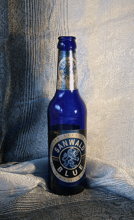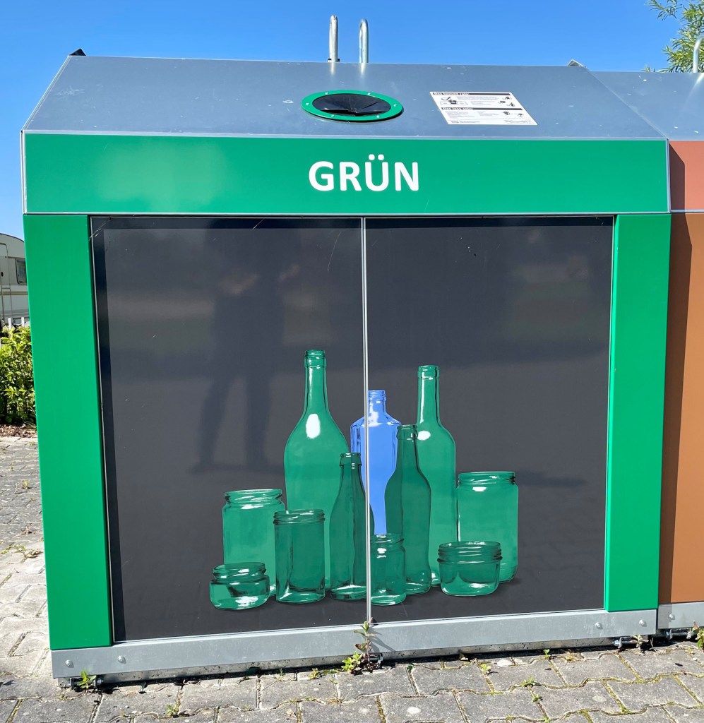 Bei Grünglas fällt die blaue oder rote Flasche nicht auf. Weißglas oder Braunglas würde sie zu sehr verunreinigen.
