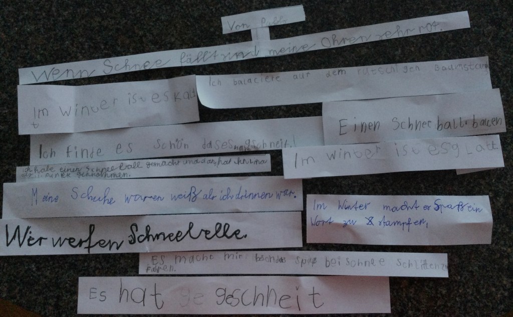 Wir haben einen Schneeengel gemacht. Wir haben im Schnee gespielt. Schlittenfahren ist toll.