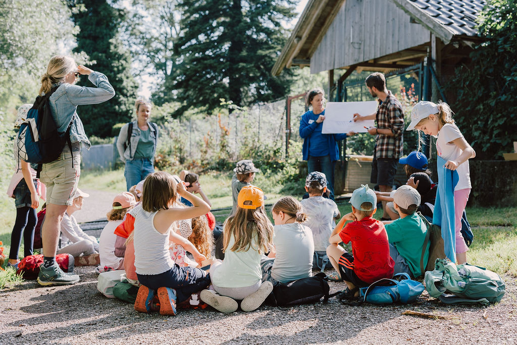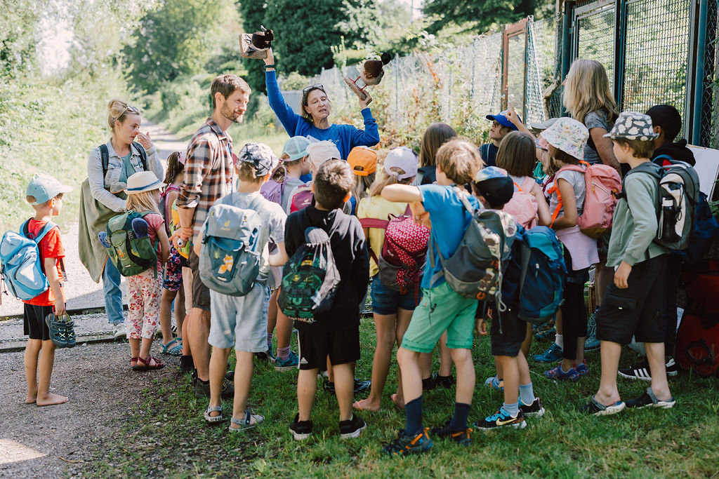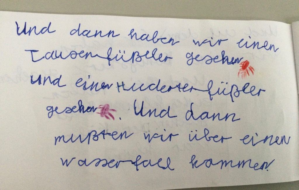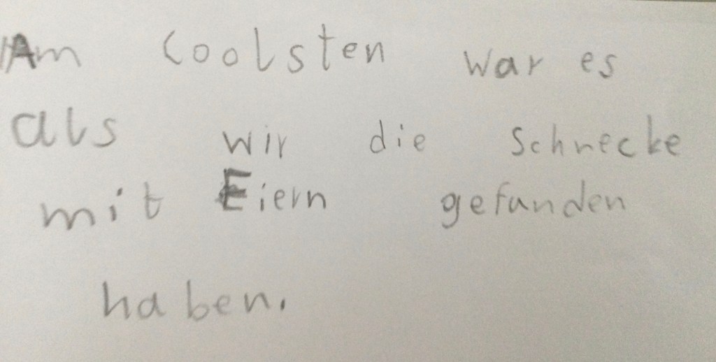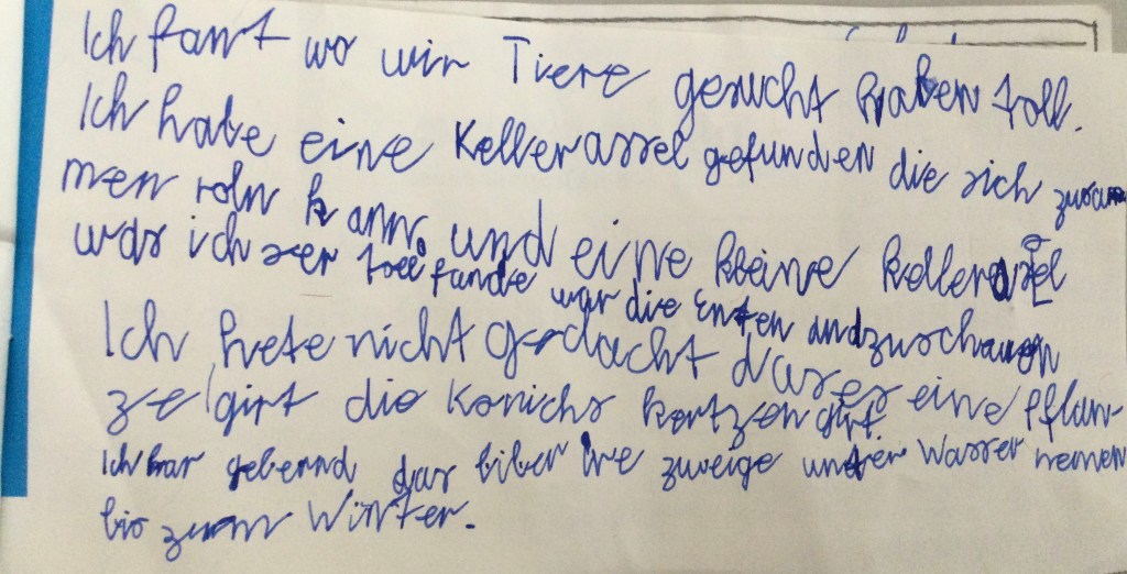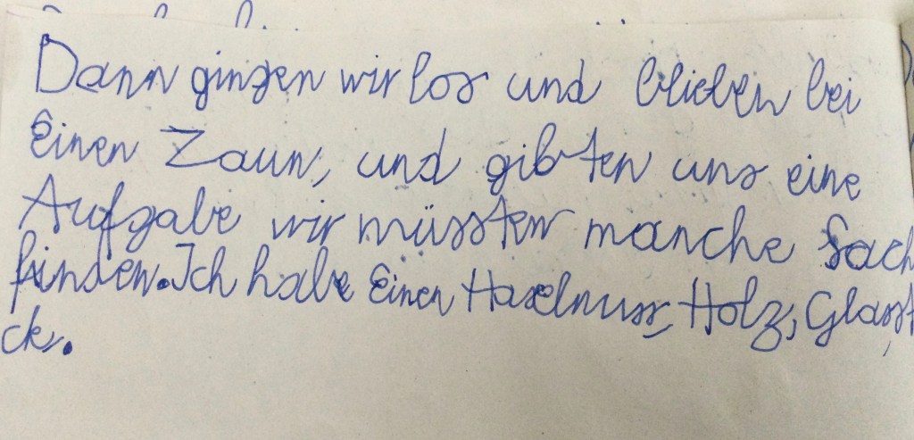 Wir haben die Geräusche gezählt .Jeder von uns hat ein anderes Geräusch gehörtVogelzwitschern, Eichhörnchen, Fußgänger, Autos, Wasser, Wind, Mücken