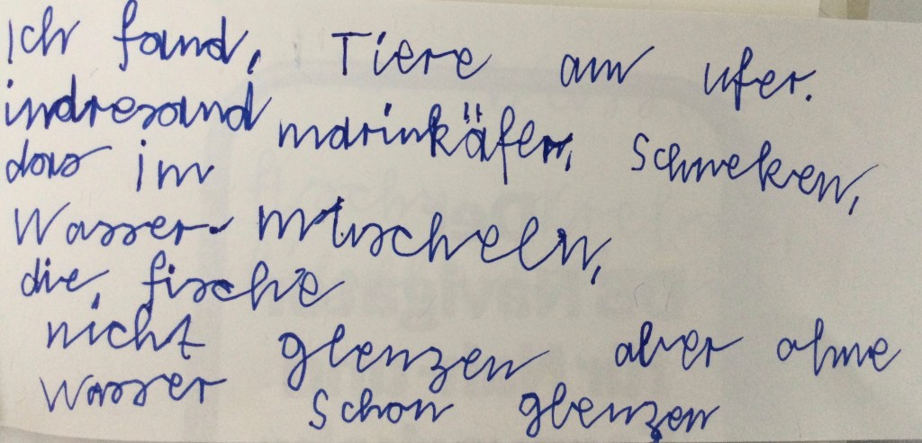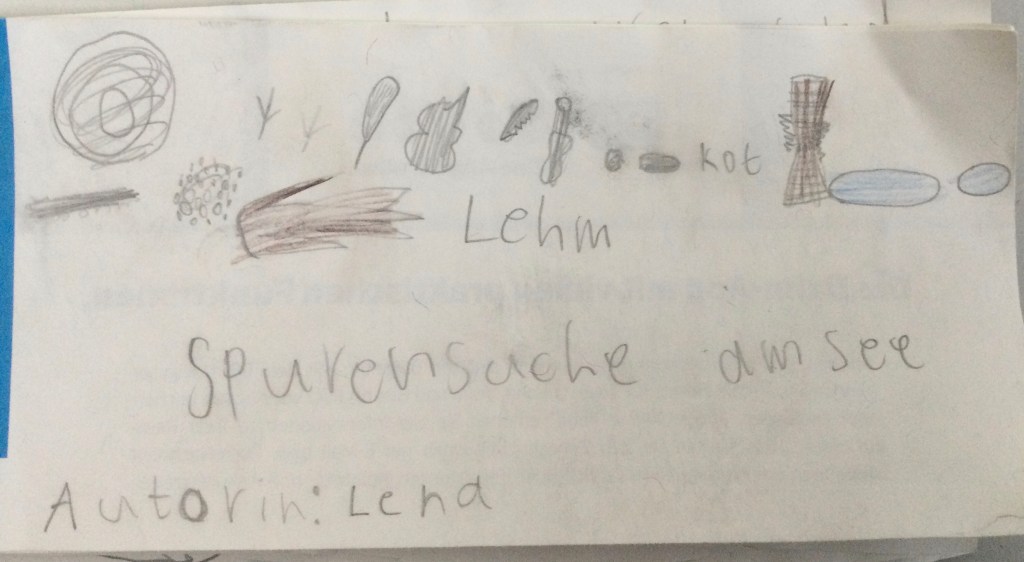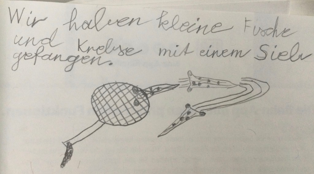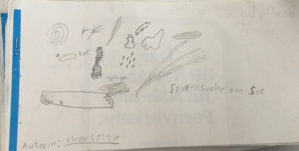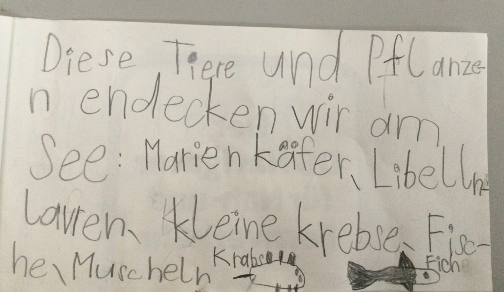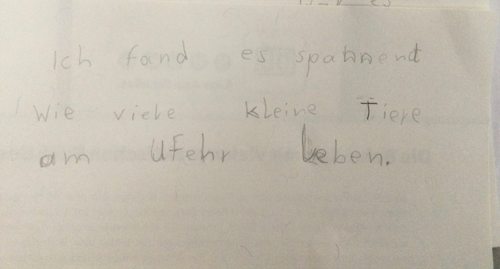 Jeder hat berichtet was er gefunden hat.Wir haben eine Schnecke gefunden mit einem Ei,Wir haben Muscheln gefunden Schnecken, Muscheln und eine FederDas sind die Spuren von der Überschwemmung: Stein von einem Haus, Ziegel ,FederDie Schnecke mit EiEin winziger FischGallen an einem BlattHier haben wir Eierschalen gefunden.Kleine Krebse waren an den Schalen.Wir haben eine Spur vom Hochwasser gefunden. Die Wellen haben am Ufer des Ammersees Stücke und Steine aus dem Weg abgebrochen.Das war eine Spur von einem Vogel.Das war eine Haselnuss. Sie hatte ein Loch und ist zerbrochen.Die Libelle kommen wie die Schmetterlinge aus einer Puppe. Sie legen Eier und sterben dann. Diese Libelle wäre ertrunken wenn wir sie nicht gerettet hätten.Ich habe einen toten Fisch gefangen. Den konnten wir dann genau anschauen.Wir haben tausende winzige Fische entdeckt. Die Wasserfledermaus frisst dies Fische.Im Wasser habe ich eine lebendige Libellenlarve herausgefischt.Auf dem überschwemmten Weg habe ich viele krebsartige und winzige Tiere gefunden. Am meisten habe ich mit dem Sieb im Gras entdeckt.Im flachen Überschwemmungsgebiet habe ich 6 Fische gefangen und wieder freigelassen.Auch am Ufer haben wir gesucht. Unter der Erde habe ich einen winzigen, dünnen, orangenen Wurm gefunden.