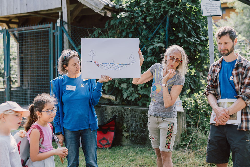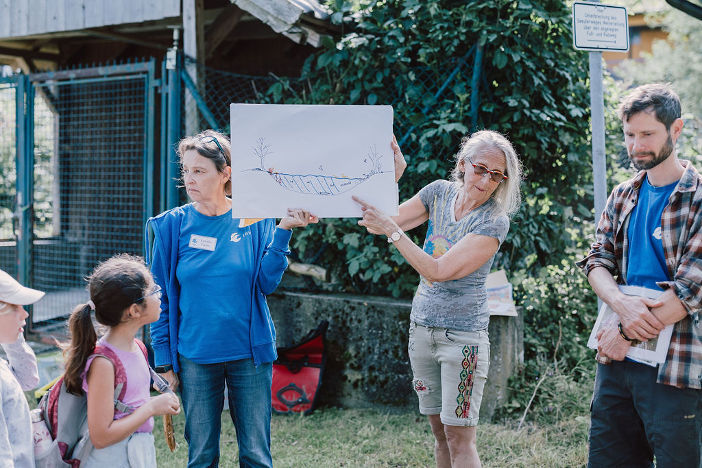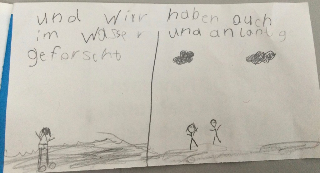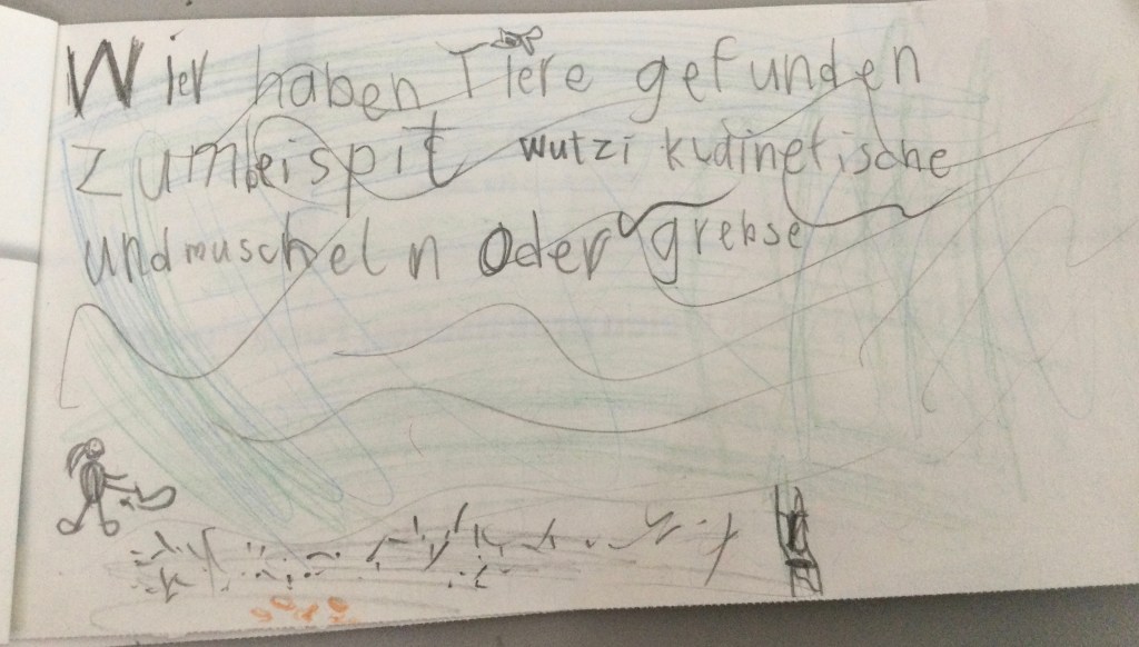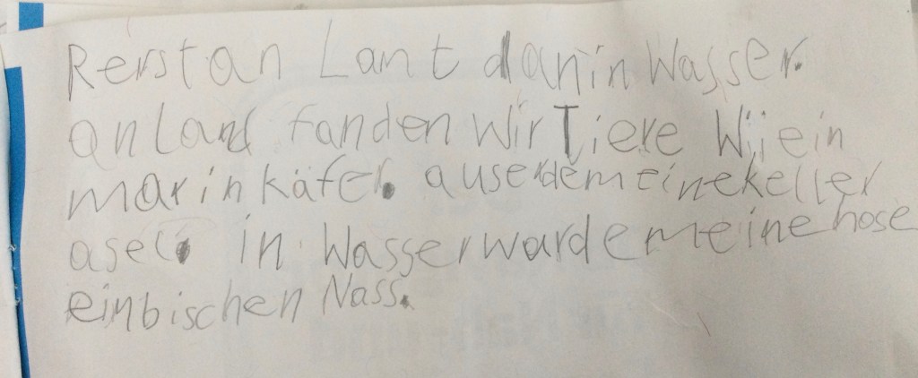 Jeder hat berichtet was er gefunden hat.Wir haben eine Schnecke gefunden mit einem Ei,Wir haben Muscheln gefunden Schnecken, Muscheln und eine FederDas sind die Spuren von der Überschwemmung: Stein von einem Haus, Ziegel ,FederDie Schnecke mit EiEin winziger FischGallen an einem BlattHier haben wir Eierschalen gefunden.Kleine Krebse waren an den Schalen.Wir haben eine Spur vom Hochwasser gefunden. Die Wellen haben am Ufer des Ammersees Stücke und Steine aus dem Weg abgebrochen.Das war eine Spur von einem Vogel.Das war eine Haselnuss. Sie hatte ein Loch und ist zerbrochen.Die Libelle kommen wie die Schmetterlinge aus einer Puppe. Sie legen Eier und sterben dann. Diese Libelle wäre ertrunken wenn wir sie nicht gerettet hätten.Ich habe einen toten Fisch gefangen. Den konnten wir dann genau anschauen.Wir haben tausende winzige Fische entdeckt. Die Wasserfledermaus frisst dies Fische.Im Wasser habe ich eine lebendige Libellenlarve herausgefischt.Auf dem überschwemmten Weg habe ich viele krebsartige und winzige Tiere gefunden. Am meisten habe ich mit dem Sieb im Gras entdeckt.Im flachen Überschwemmungsgebiet habe ich 6 Fische gefangen und wieder freigelassen.Auch am Ufer haben wir gesucht. Unter der Erde habe ich einen winzigen, dünnen, orangenen Wurm gefunden.