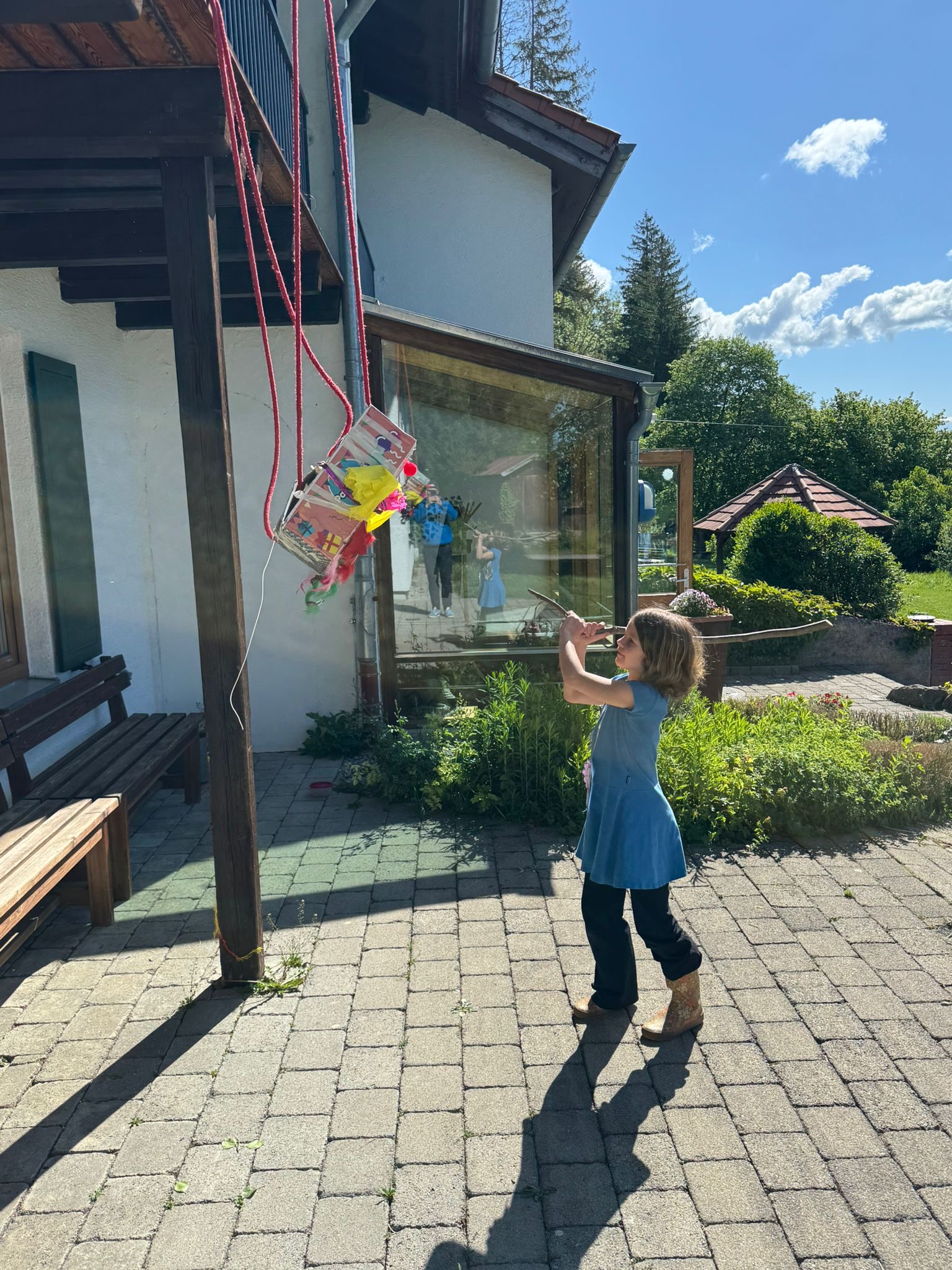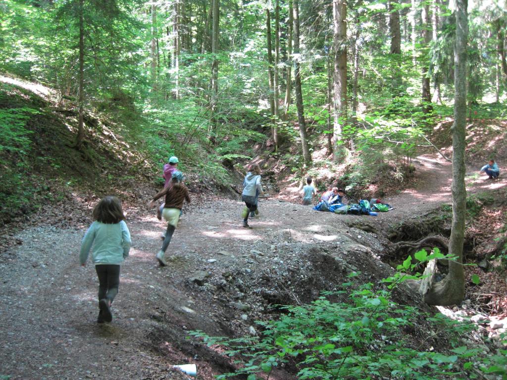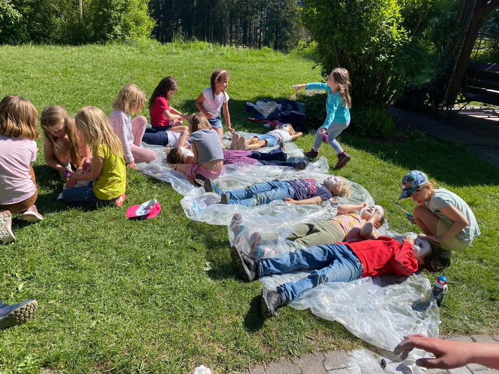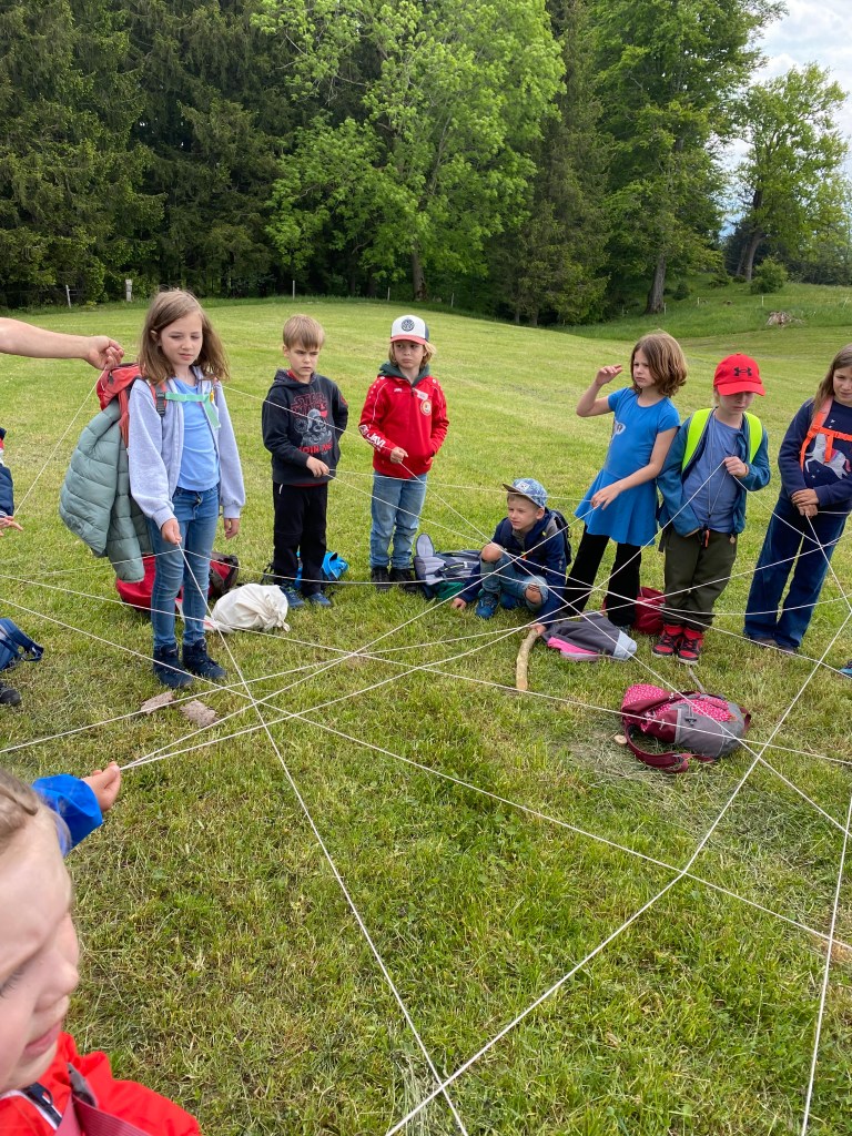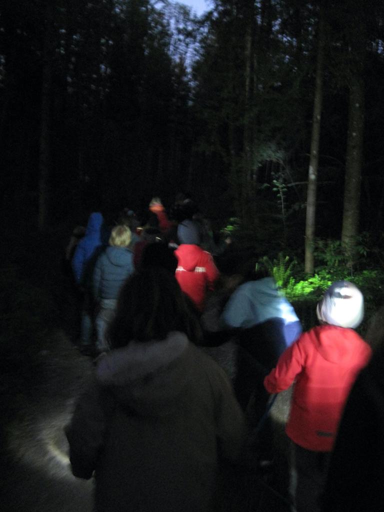 Wir haben uns im Garten angestellt. Jeder sollte sich an dem Seil festhalten. Dann sind wir in der Dämmerung in den Wald gegangen. Als es dunkel war, sind immer fünf Kinder einen Trampelpfad hochgelaufen. Wir mussten ohne Taschenlampe in den dunklen Wald laufen. Dabei haben wir manchmal etwas heulen gehört. Dann sind wir ein kleines Stück weiter gegangen und anschließend umgekehrt.