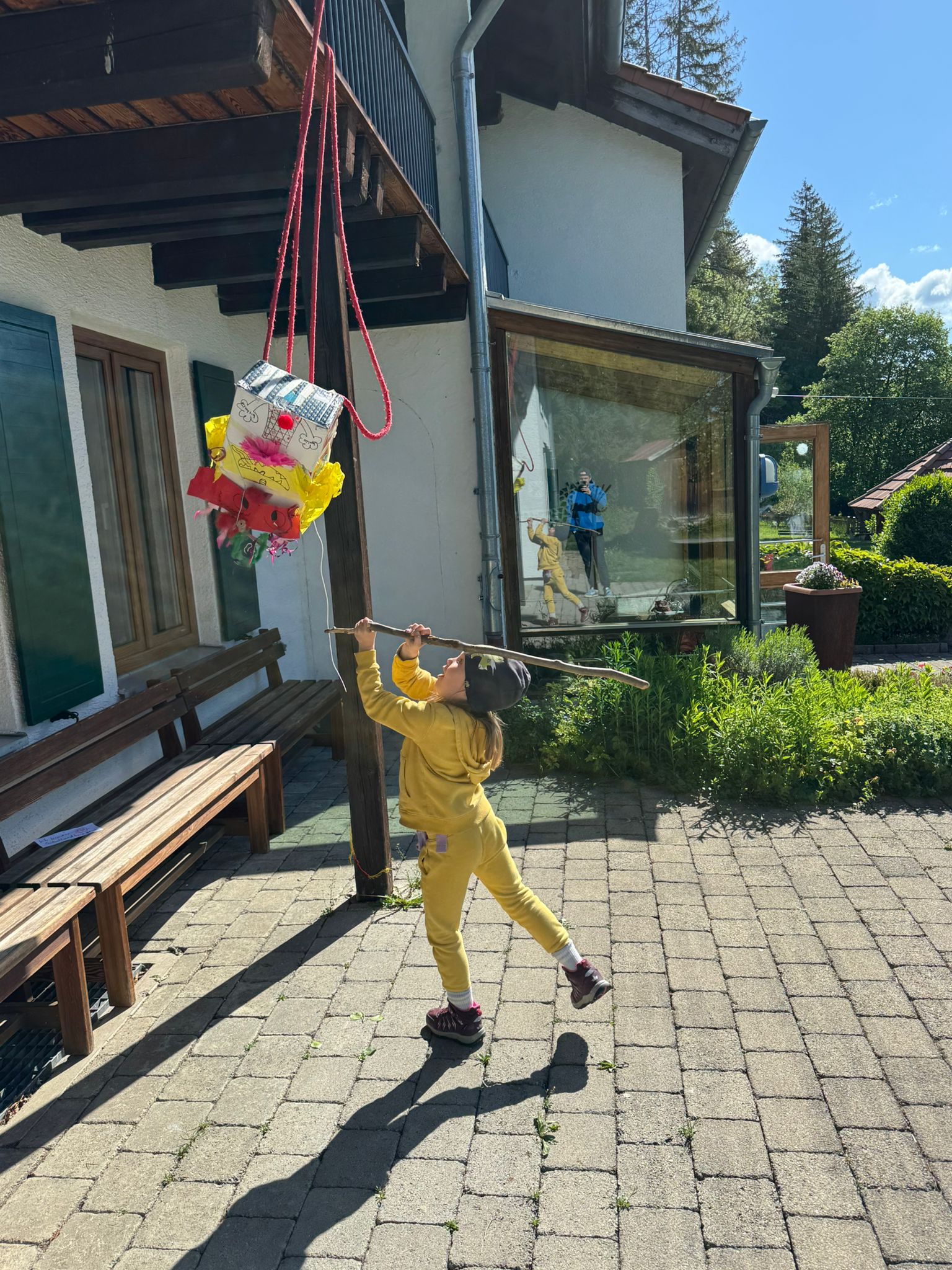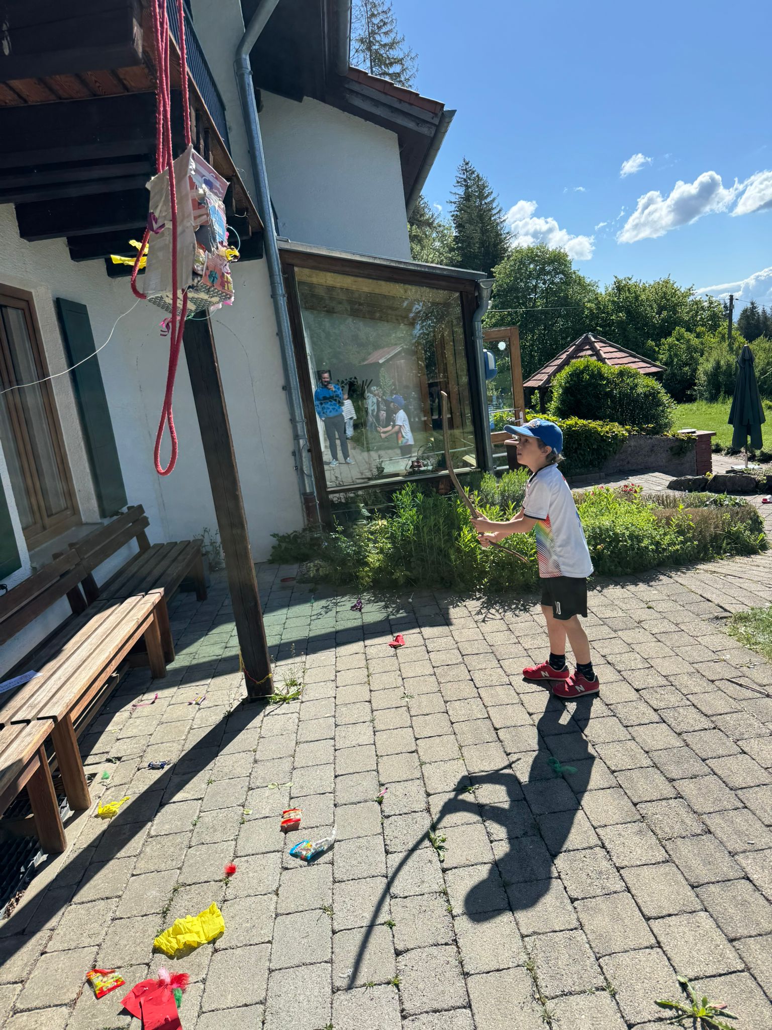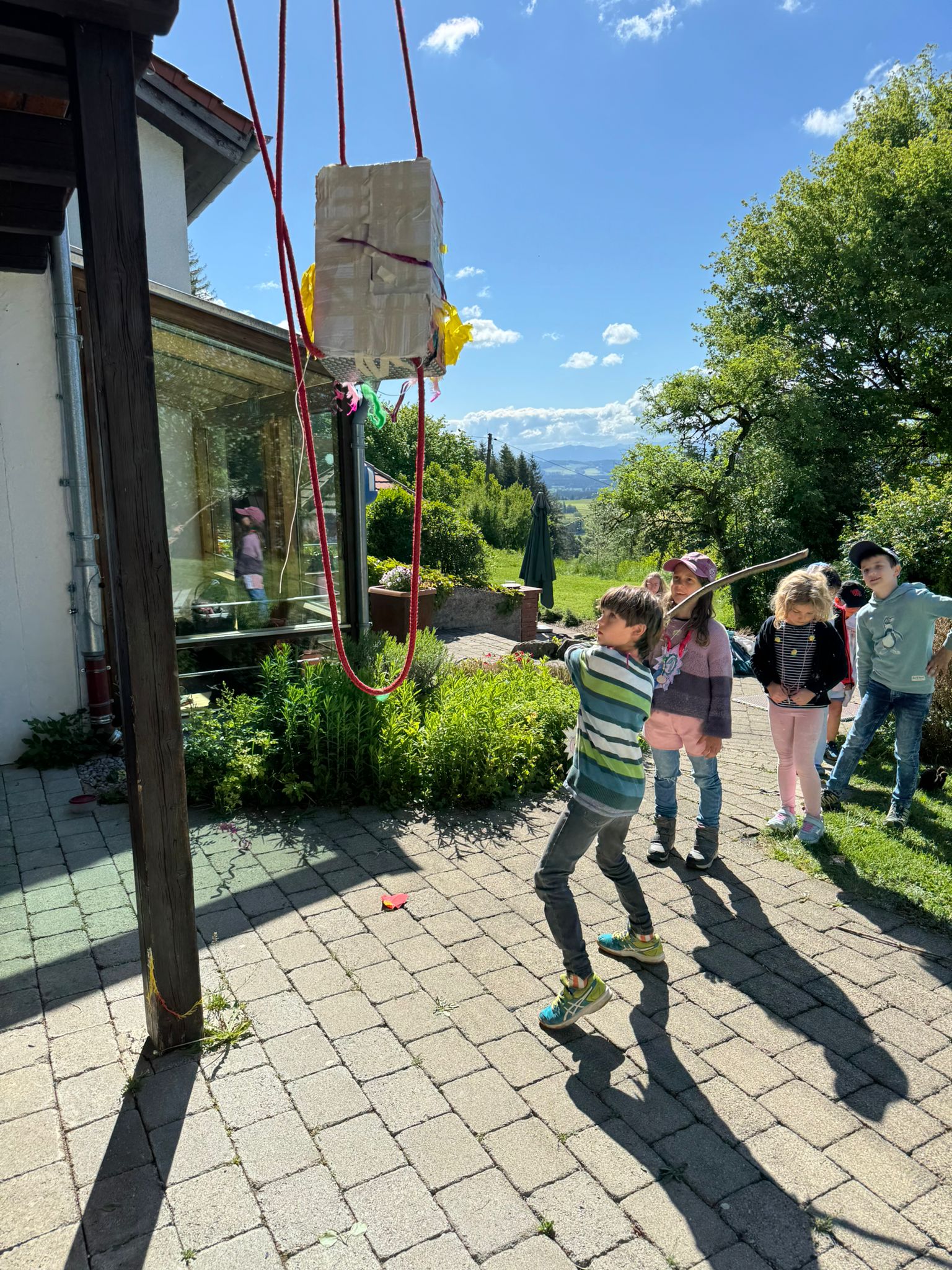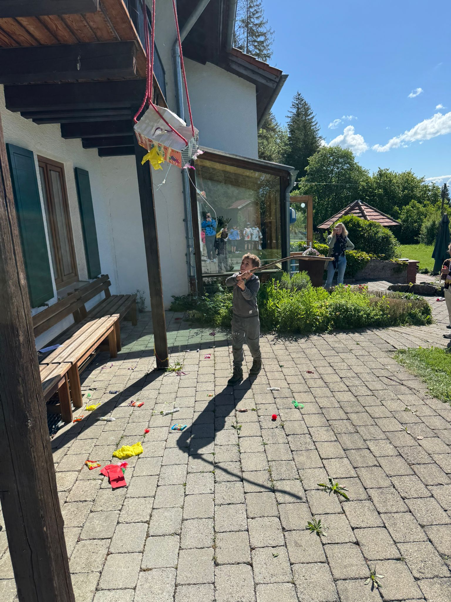 Wir haben uns im Garten angestellt. Jeder sollte sich an dem Seil festhalten. Dann sind wir in der Dämmerung in den Wald gegangen. Als es dunkel war, sind immer fünf Kinder einen Trampelpfad hochgelaufen. Wir mussten ohne Taschenlampe in den dunklen Wald laufen. Dabei haben wir manchmal etwas heulen gehört. Dann sind wir ein kleines Stück weiter gegangen und anschließend umgekehrt.