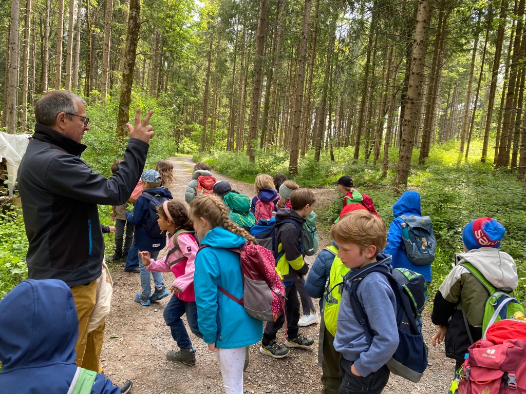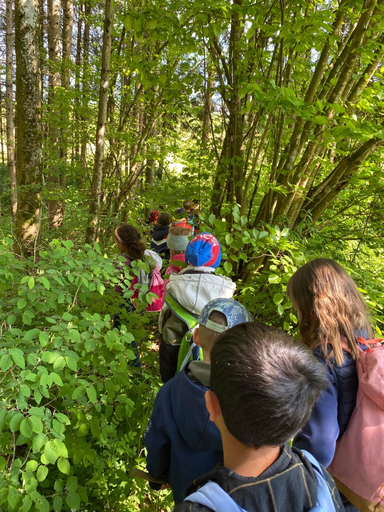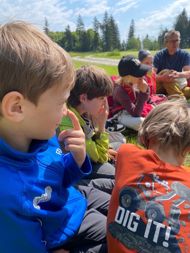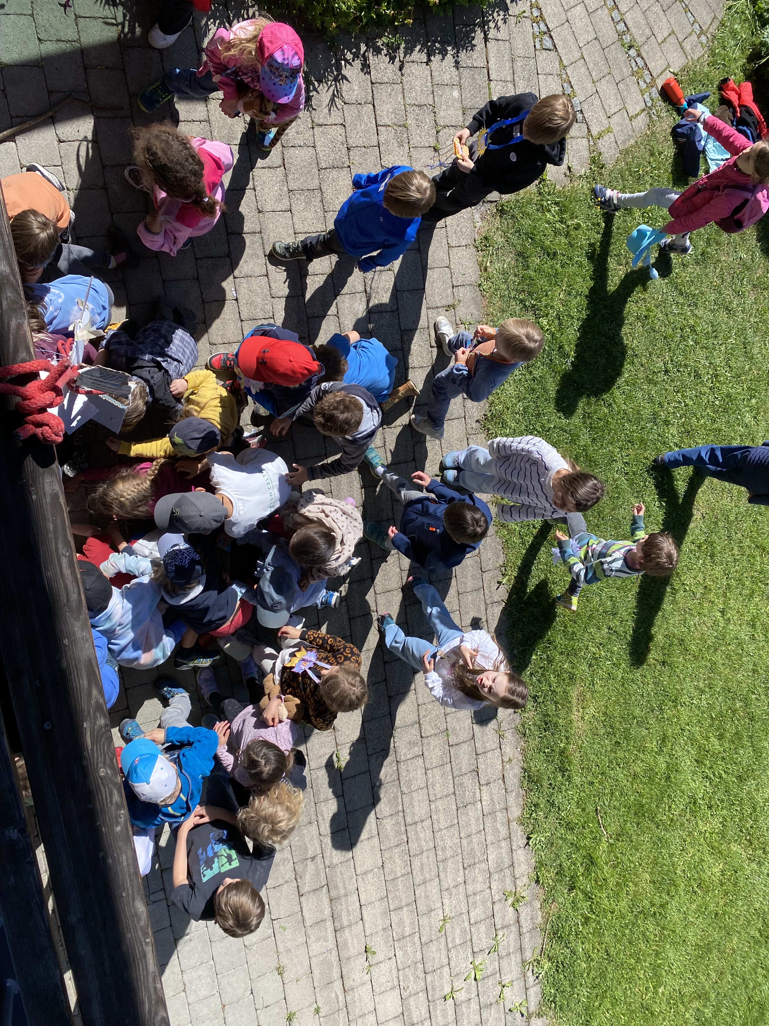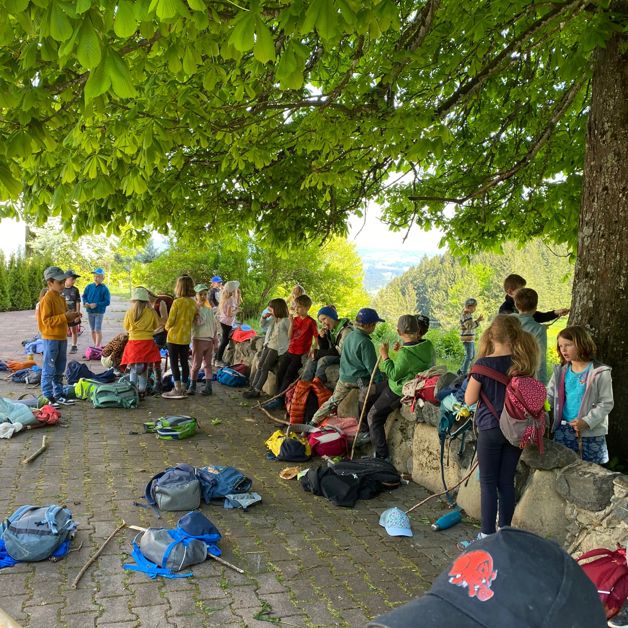 Wir sind mit dem Bus zu einem Parkplatz am Waldrand gefahren. Dort sind wir losgelaufen. Wir haben eine Straße überquert. Nach ungefähr 30 Minuten durften wir kurze Pause machen. Anschließend sind wir weitergelaufen erst einen kleinen Weg dann ging es rechts bergauf und man musste richtig über Wurzeln steigen. Als wir dann endlich oben angekommen waren, hat Frau Händel Müsli Riegel verteilt. Wir haben eine Geschichte nachgespielt, dann sind wir auf den Kirchturm geklettert. Dort gab es eine Terrasse und wir haben ein Foto gemacht.