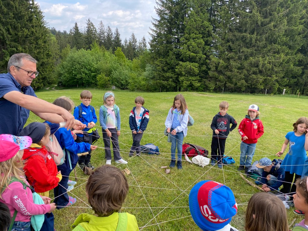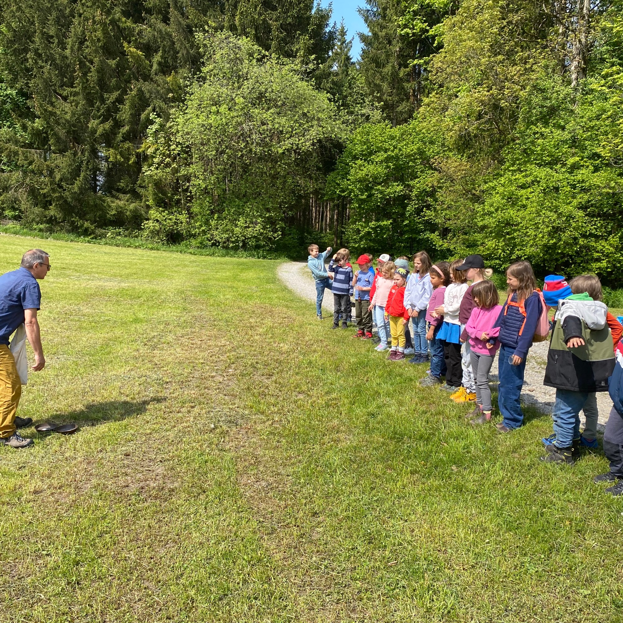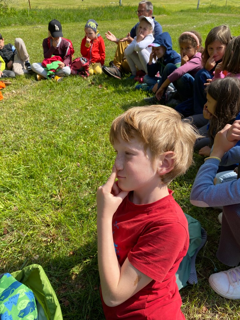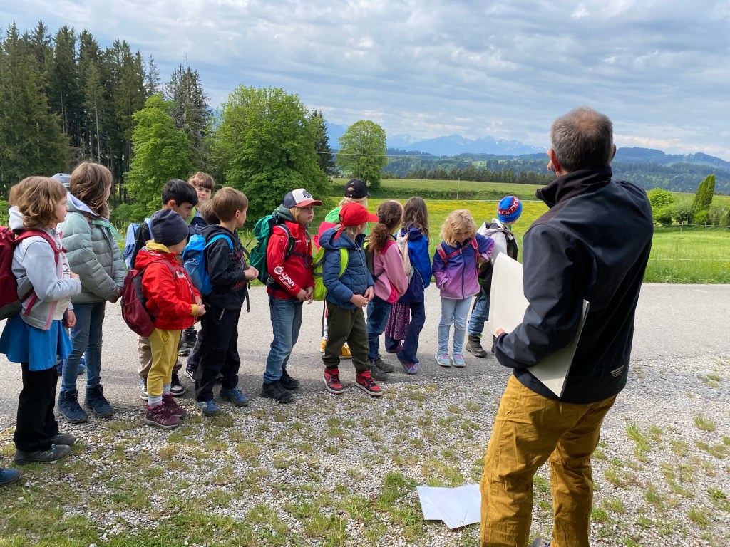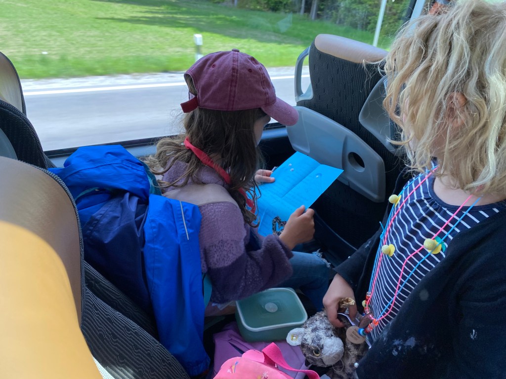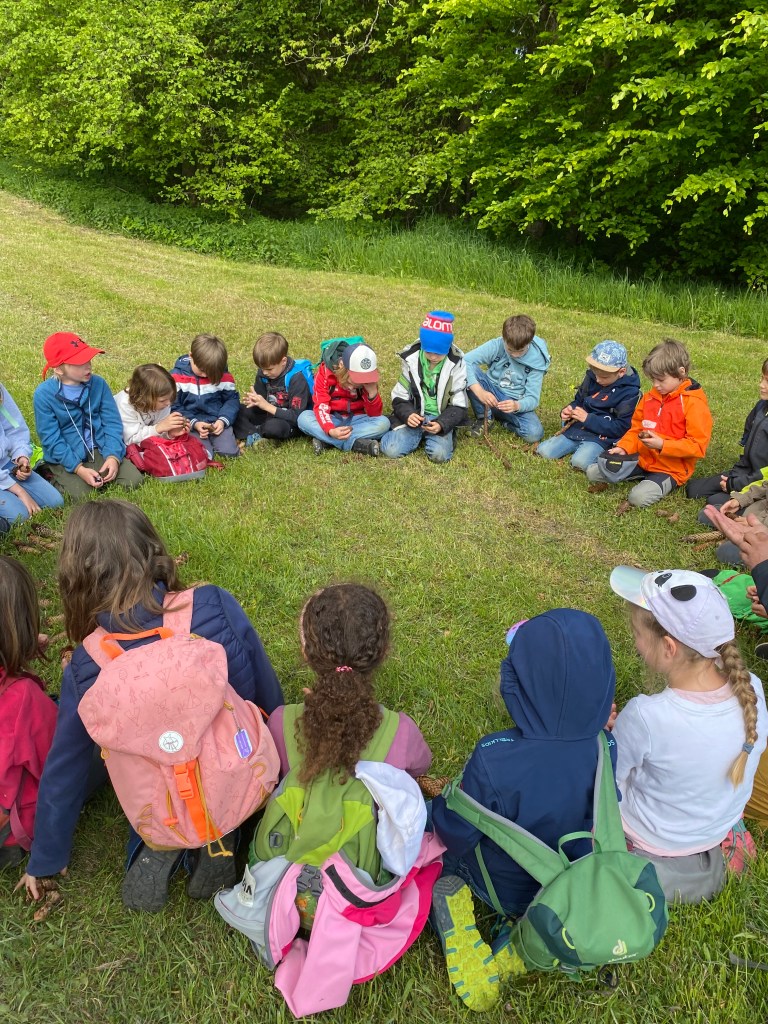 Wir sind mit dem Bus zu einem Parkplatz am Waldrand gefahren. Dort sind wir losgelaufen. Wir haben eine Straße überquert. Nach ungefähr 30 Minuten durften wir kurze Pause machen. Anschließend sind wir weitergelaufen erst einen kleinen Weg dann ging es rechts bergauf und man musste richtig über Wurzeln steigen. Als wir dann endlich oben angekommen waren, hat Frau Händel Müsli Riegel verteilt. Wir haben eine Geschichte nachgespielt, dann sind wir auf den Kirchturm geklettert. Dort gab es eine Terrasse und wir haben ein Foto gemacht.