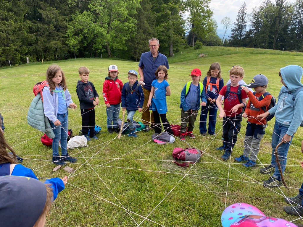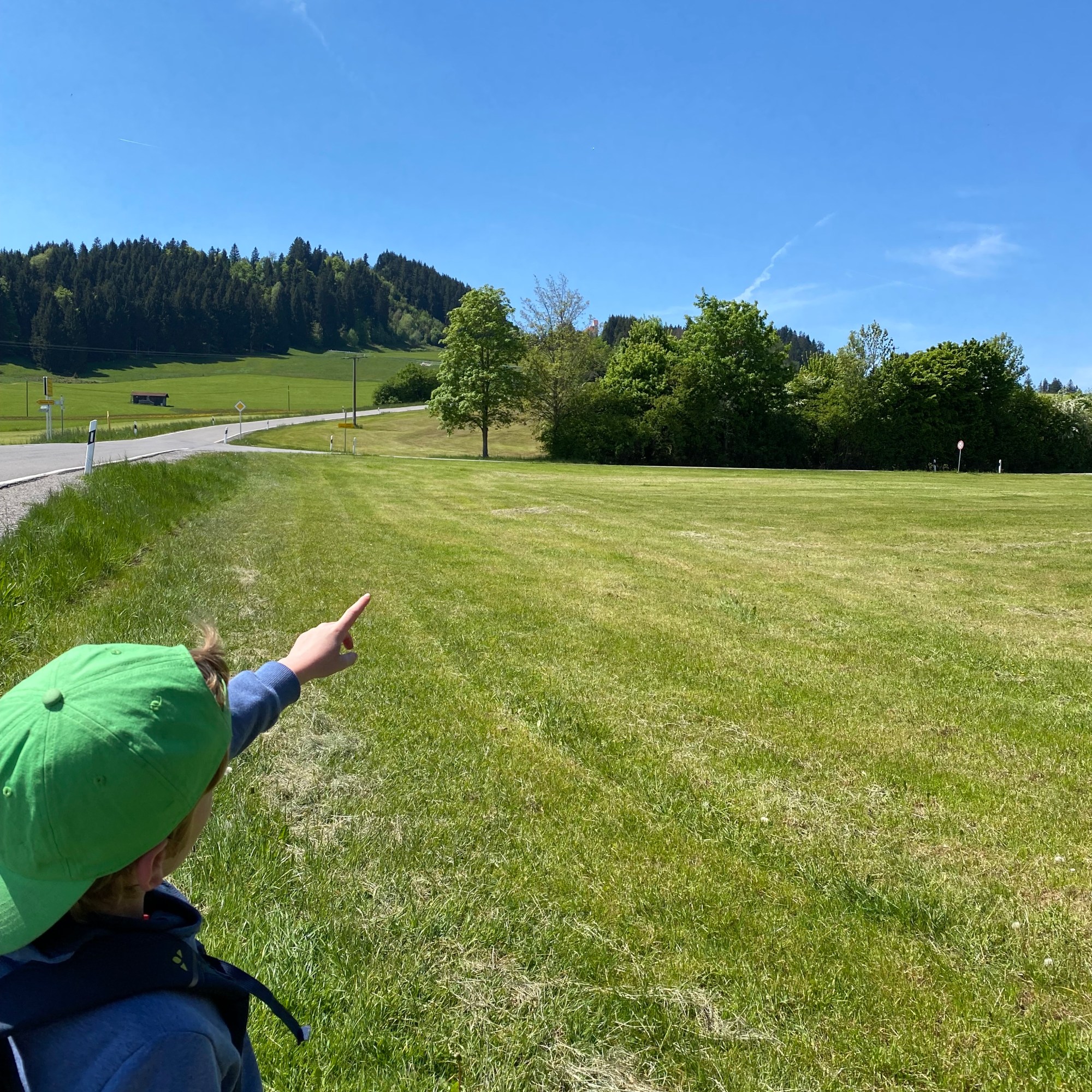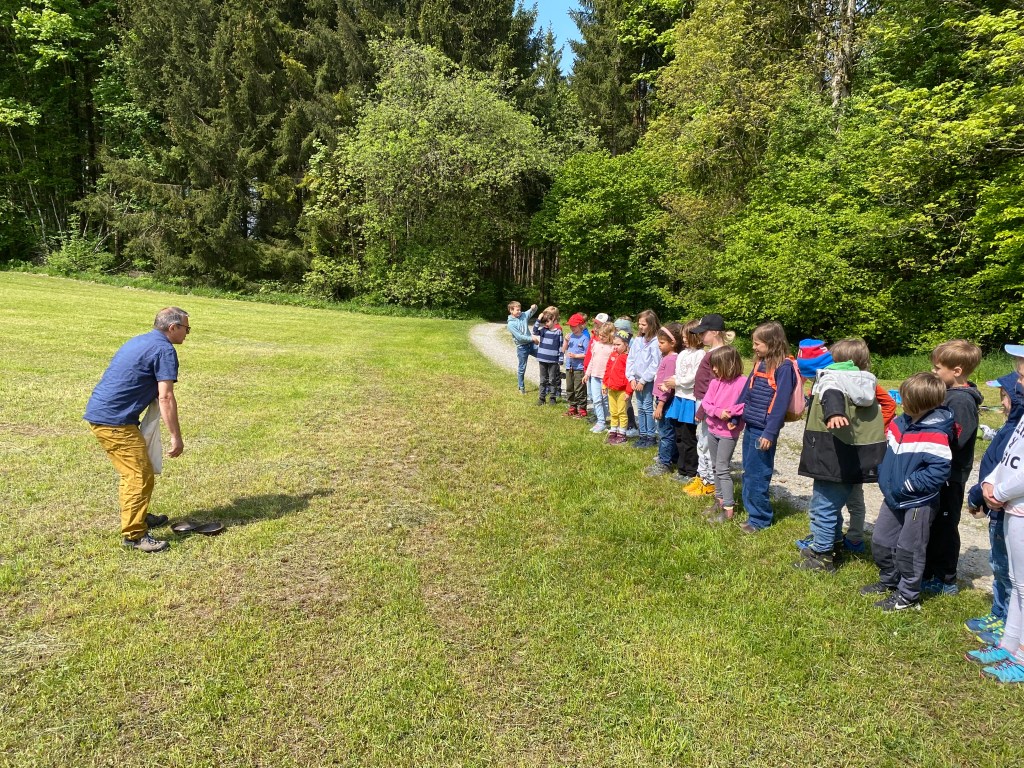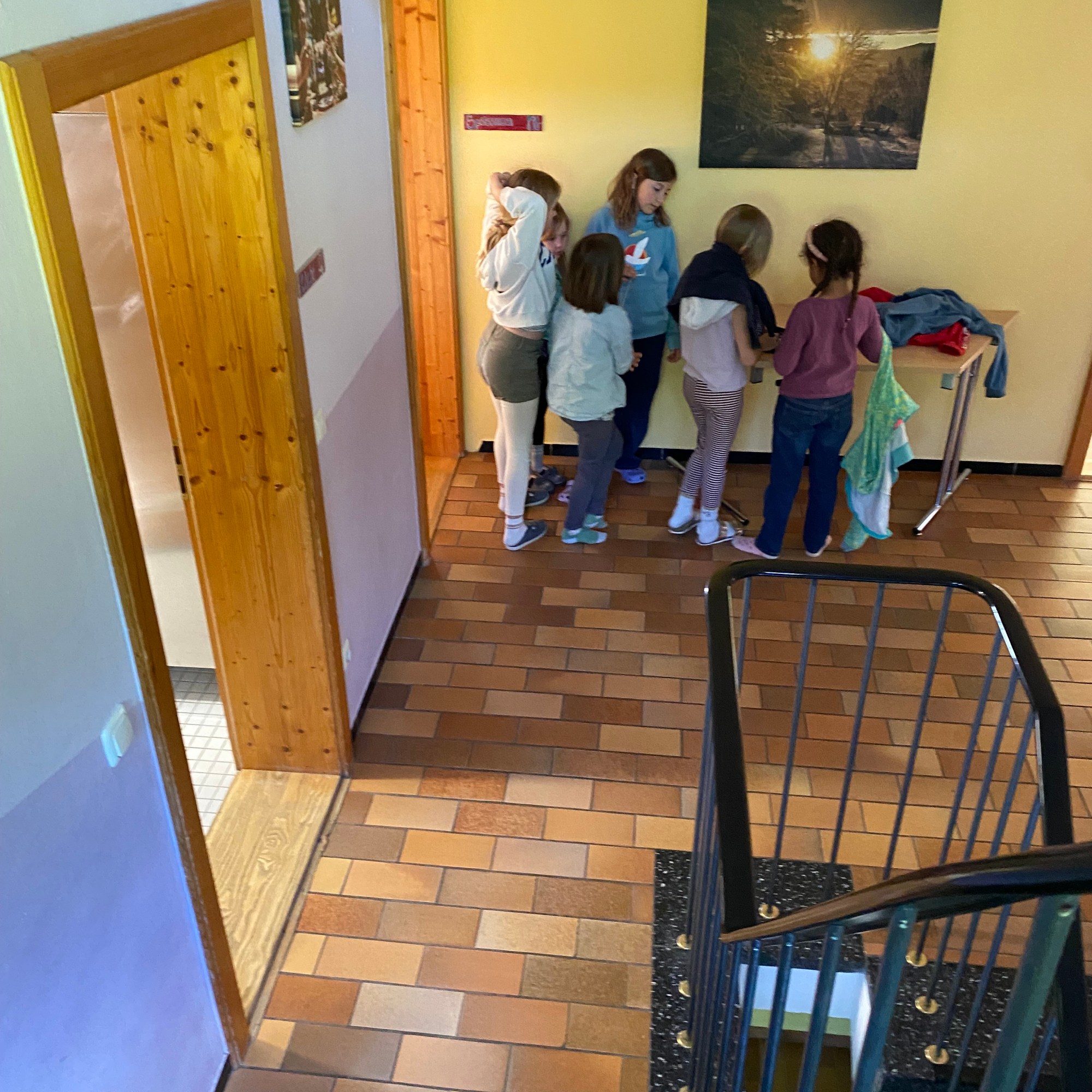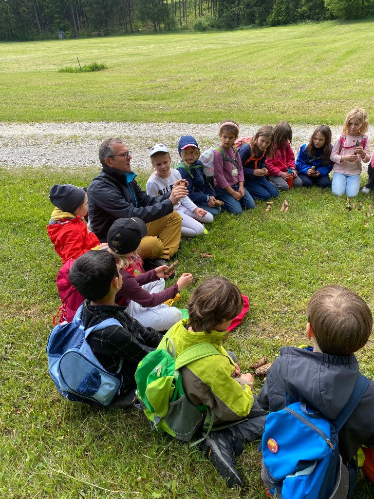 Wir sind mit dem Bus zu einem Parkplatz am Waldrand gefahren. Dort sind wir losgelaufen. Wir haben eine Straße überquert. Nach ungefähr 30 Minuten durften wir kurze Pause machen. Anschließend sind wir weitergelaufen erst einen kleinen Weg dann ging es rechts bergauf und man musste richtig über Wurzeln steigen. Als wir dann endlich oben angekommen waren, hat Frau Händel Müsli Riegel verteilt. Wir haben eine Geschichte nachgespielt, dann sind wir auf den Kirchturm geklettert. Dort gab es eine Terrasse und wir haben ein Foto gemacht.