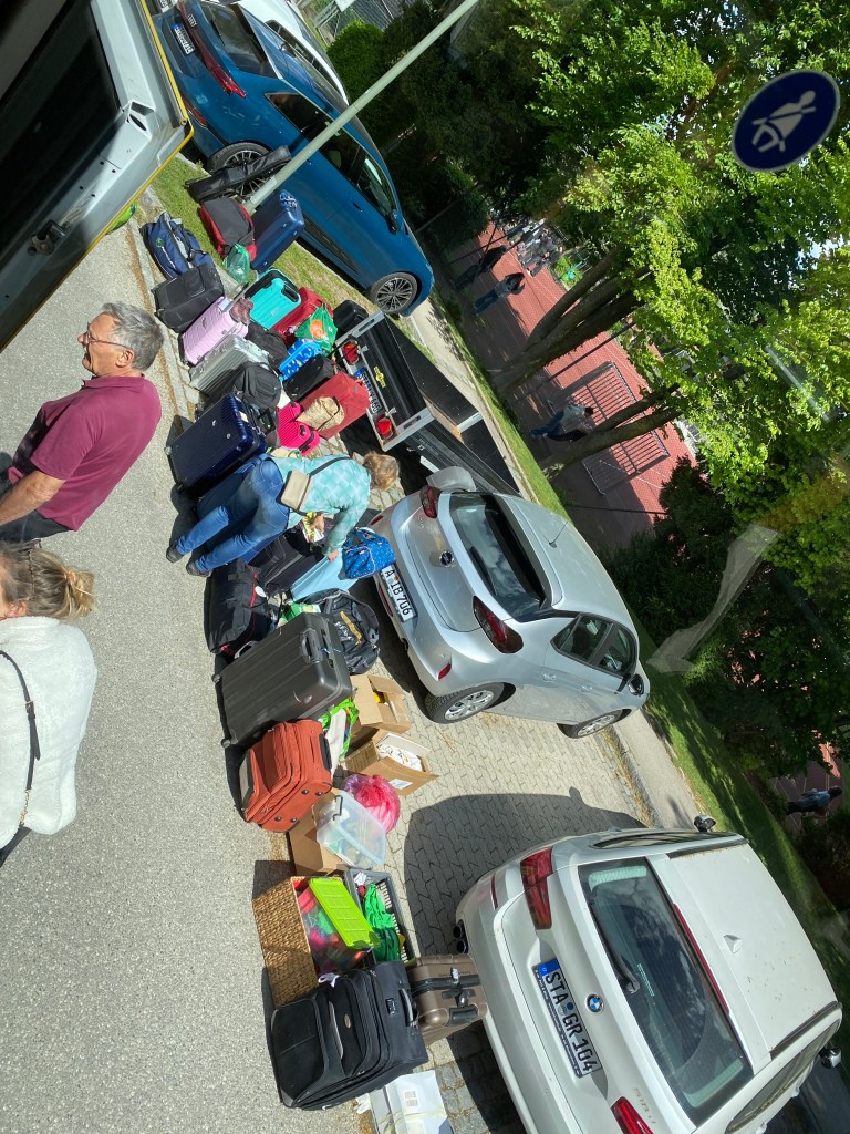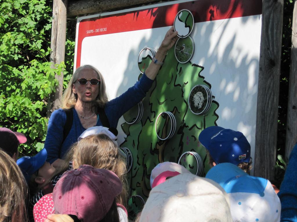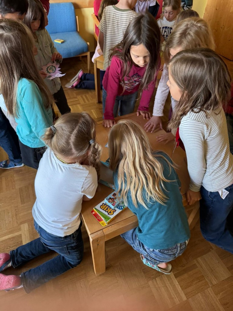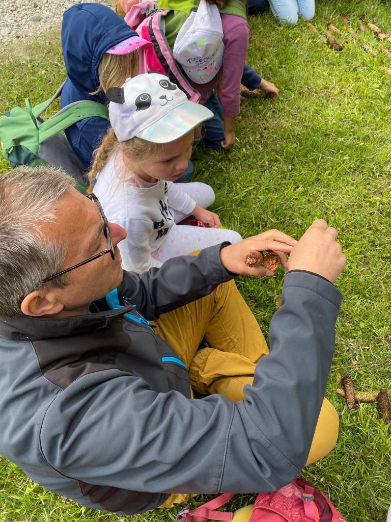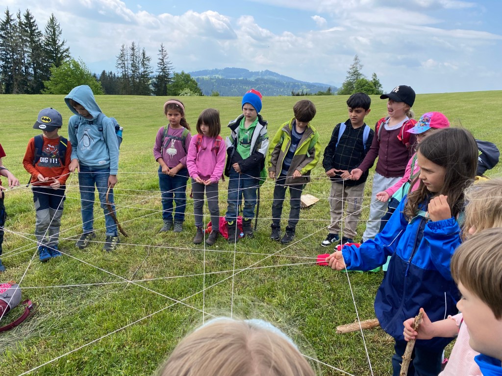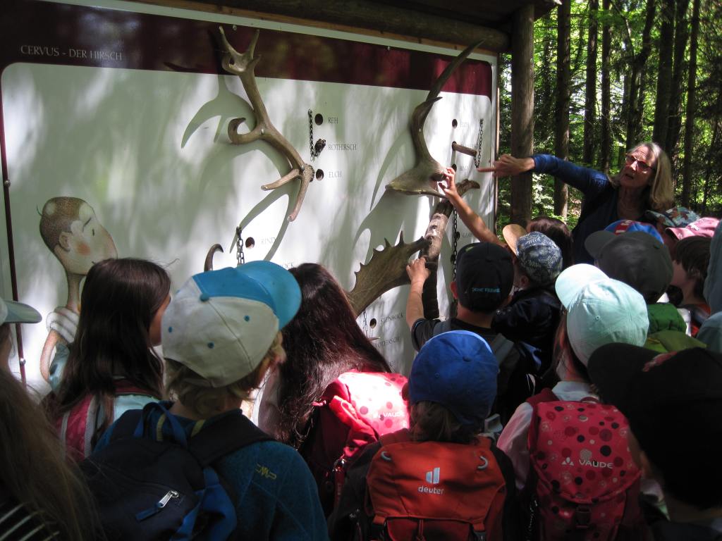 Wir sind mit dem Bus zu einem Parkplatz am Waldrand gefahren. Dort sind wir losgelaufen. Wir haben eine Straße überquert. Nach ungefähr 30 Minuten durften wir kurze Pause machen. Anschließend sind wir weitergelaufen erst einen kleinen Weg dann ging es rechts bergauf und man musste richtig über Wurzeln steigen. Als wir dann endlich oben angekommen waren, hat Frau Händel Müsli Riegel verteilt. Wir haben eine Geschichte nachgespielt, dann sind wir auf den Kirchturm geklettert. Dort gab es eine Terrasse und wir haben ein Foto gemacht.