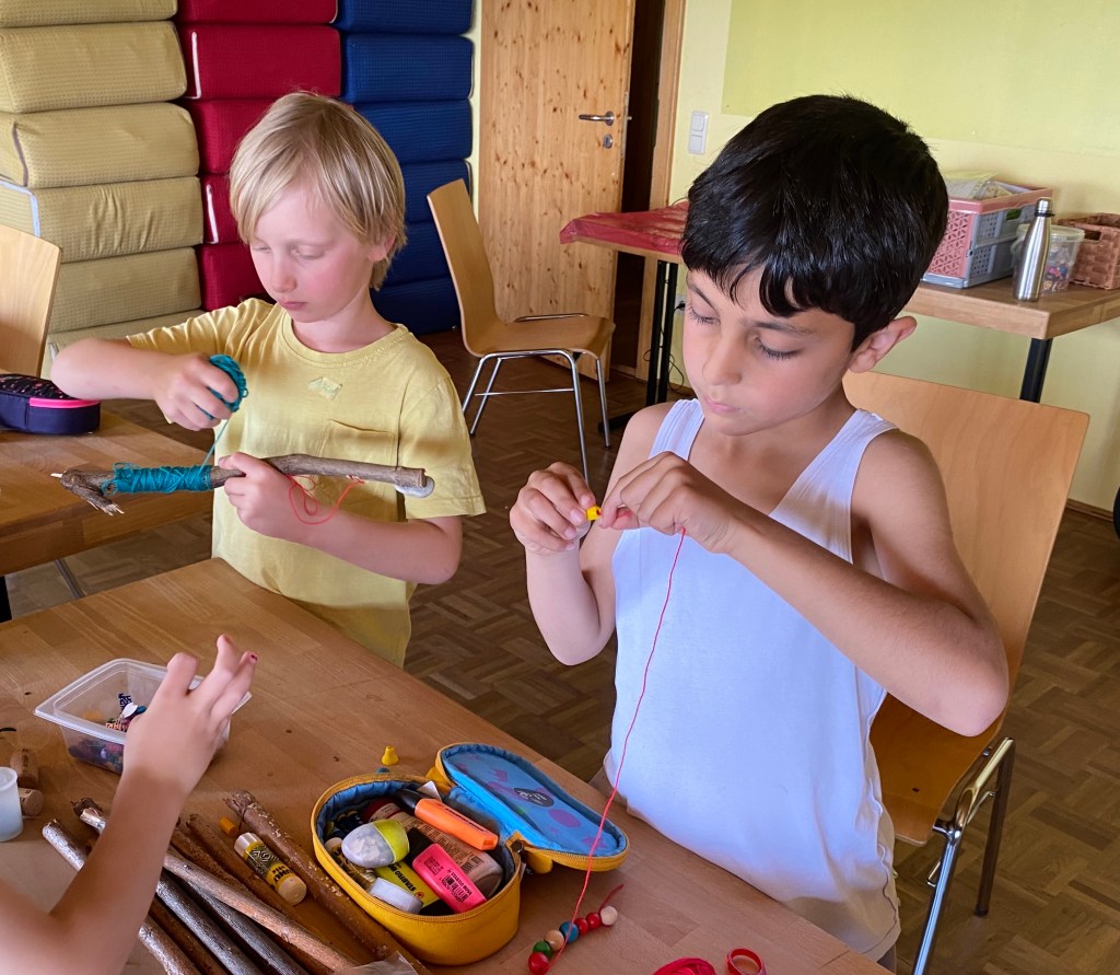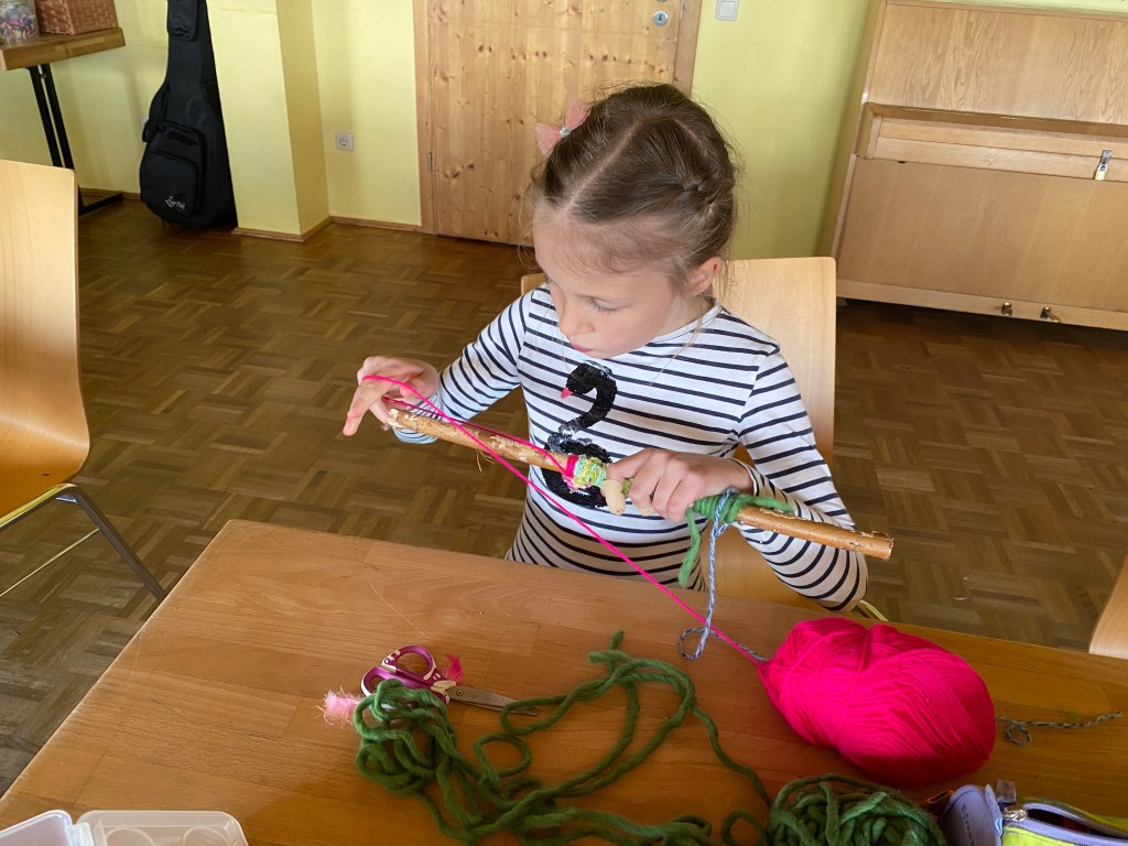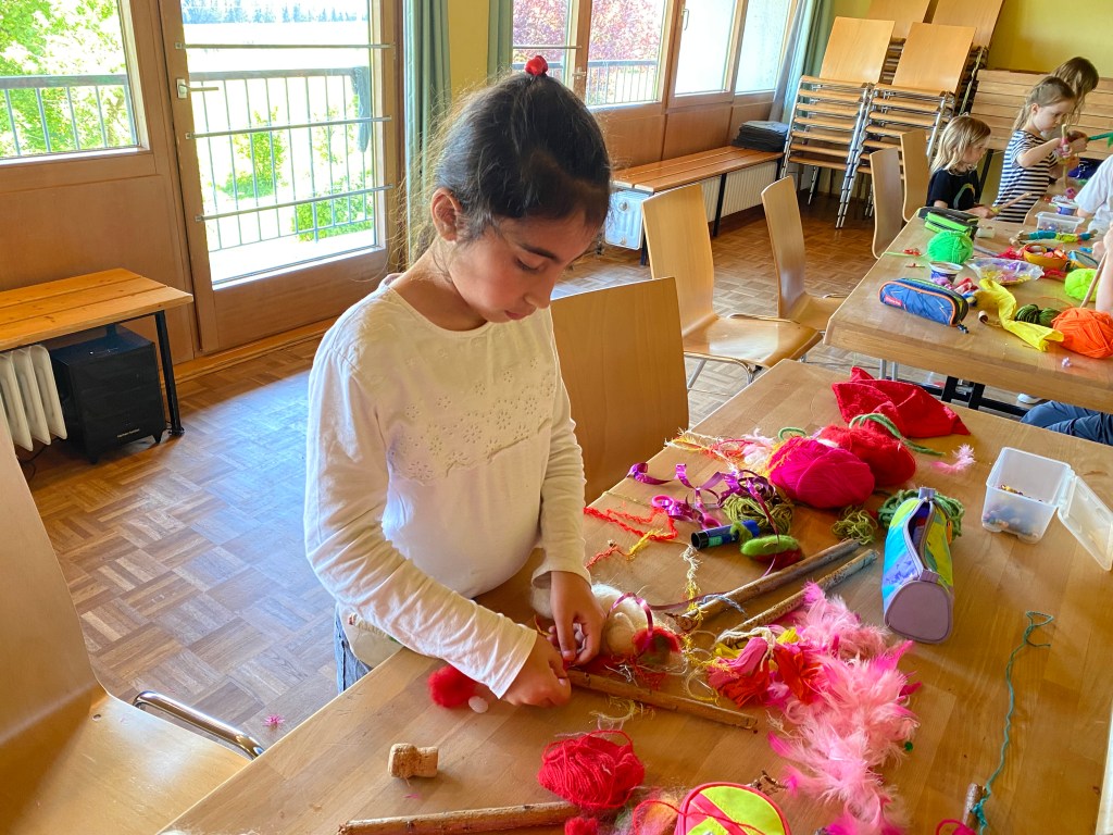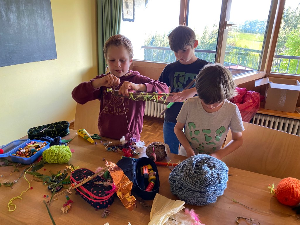 Nach dem Mittagessen durften wir Traumfänger basteln. Dazu gab es eine Geschichte: Es war einmal ein Indianerkind mit ihrer Oma. Sie konnte nie schlafen und hat immer geweint. Eines Tages ging die Oma mit ihrem Kind zur Spinnenfrau. Sie sagte, dass die Federn gute Träume fangen und die Steine schlechte. Die Spinnenfrau gab der Oma einen Stock mit Federn und Perlen und Bändern. Seit diesem Tag schlief das Kind sehr, sehr gut und die Oma auch.