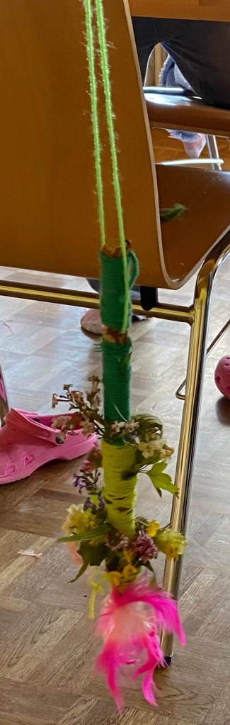 Anleitung: Man sucht einen Stock und bohrt zwei Löcher hinein. Jetzt nimmt man einen Faden und wickelt ihn herum. Wir verziehren, anschließend den Traumfänger noch mit Perlen und Federn und Steinen.