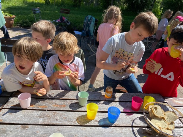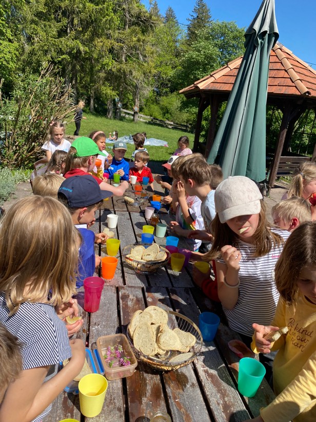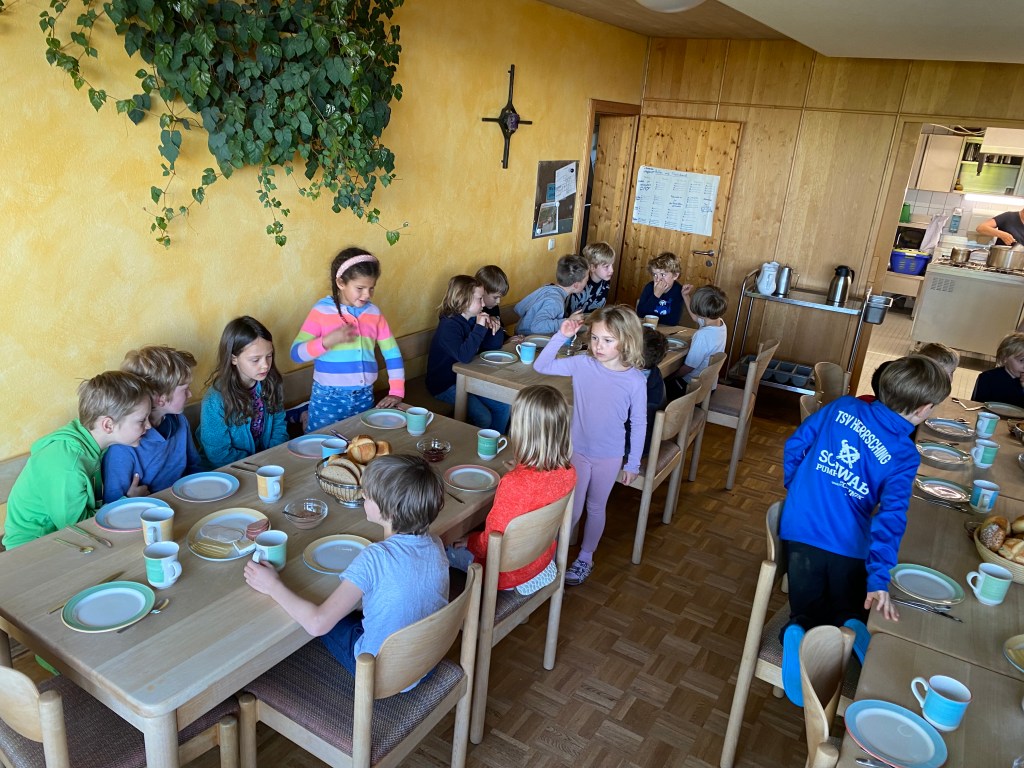 Von Dienstag bis Freitag gab es zum Frühstück leckeren Kakao und Brötchen. Zum Mittagessen gab es am Montag Karottensuppe und an den anderen Tagen gab es auch sehr leckeres Essen. Beim Abendessen gab es Brot mit Wurst und Käse. Am Mittwoch Früh mussten wir uns eine Brotzeit packen. In der Feuerstein Schlucht haben wir ein Picknick gemacht. Wir durften uns Schokoladenriegel einpacken. Die Bratwürste haben mir am besten geschmeckt.