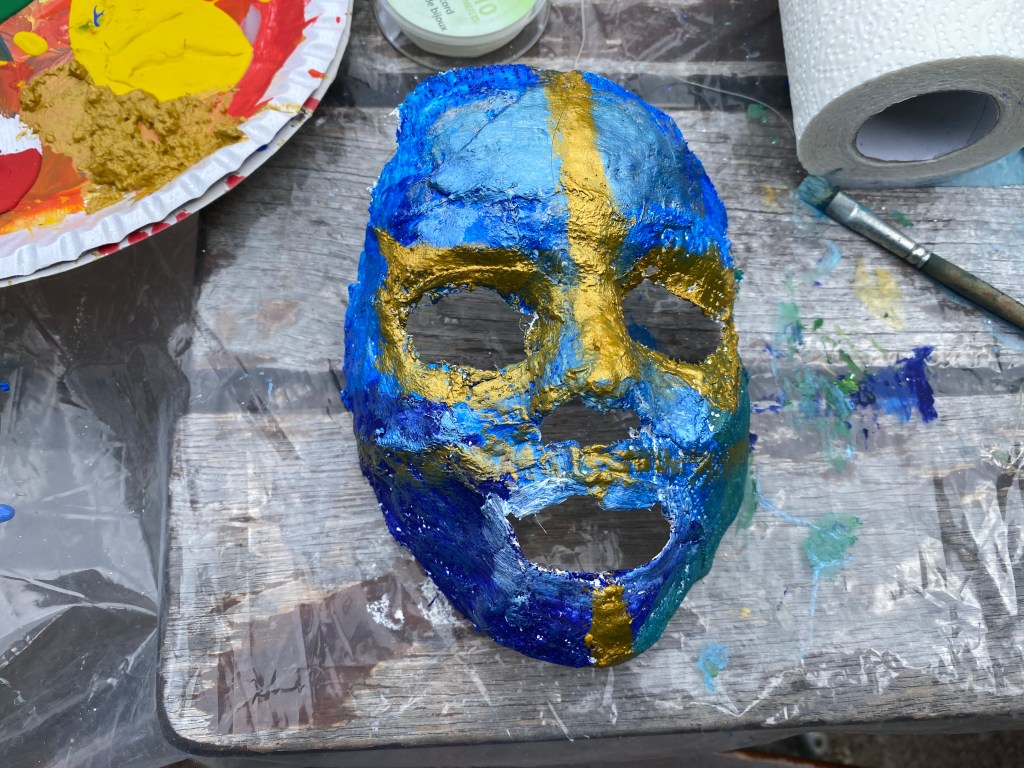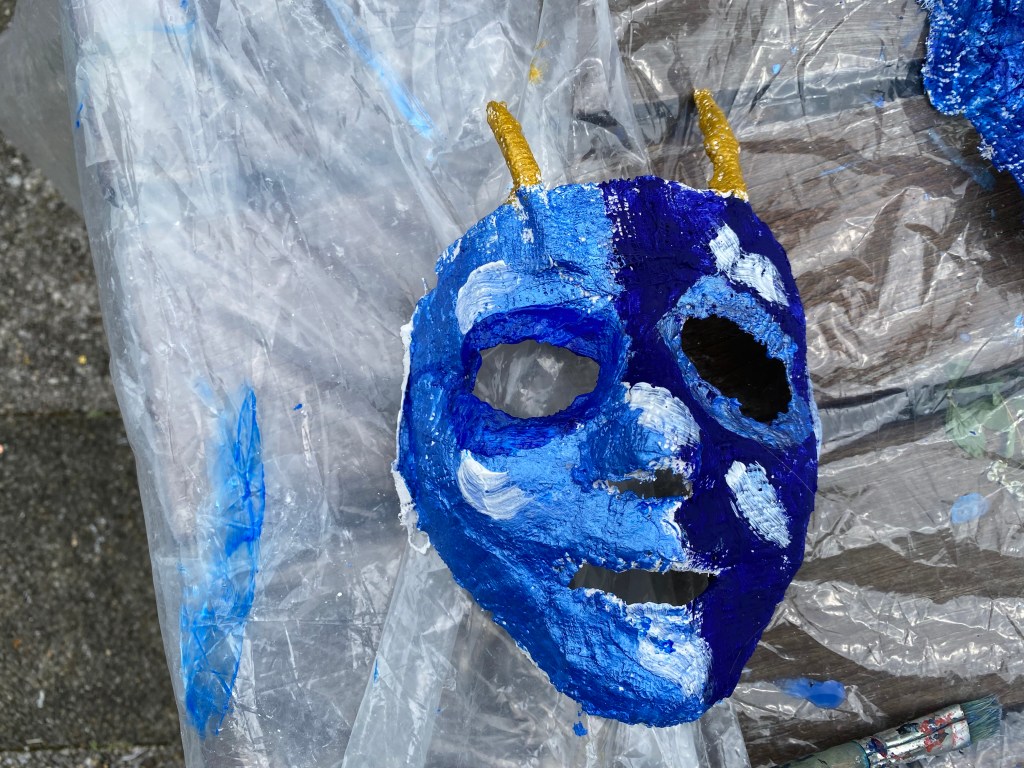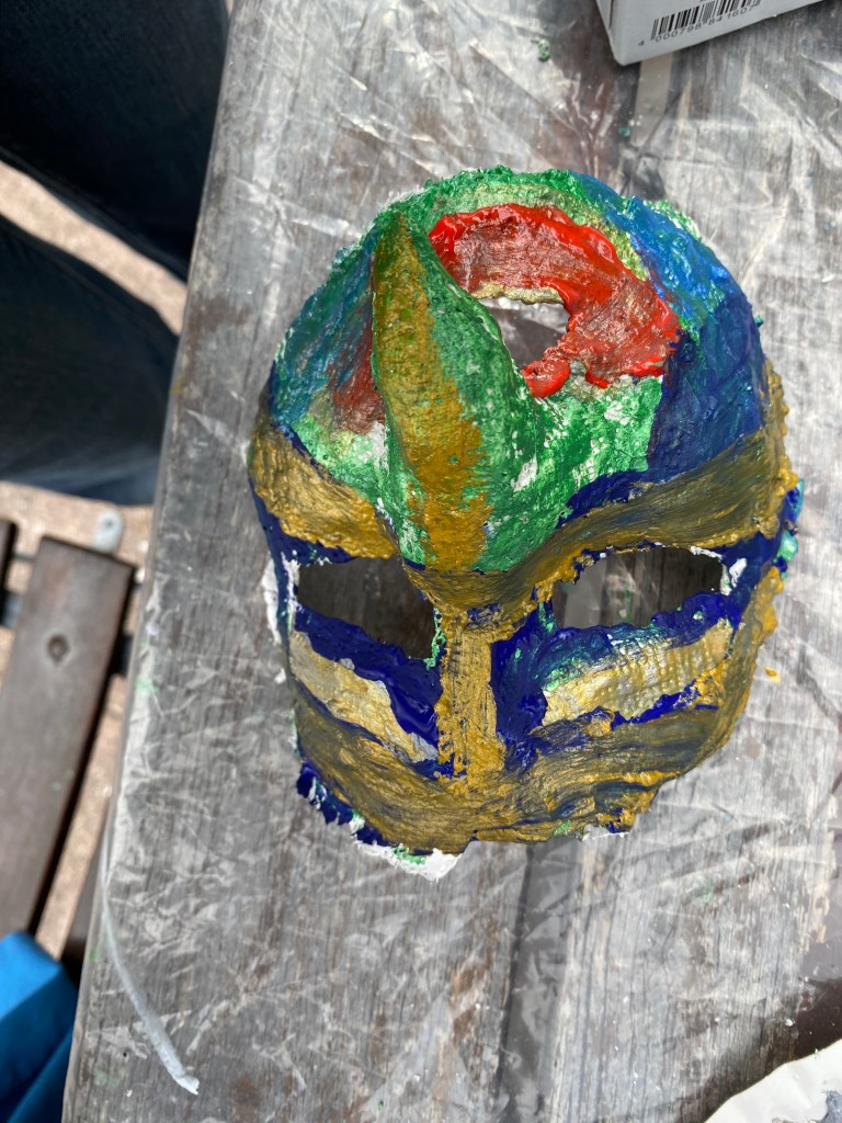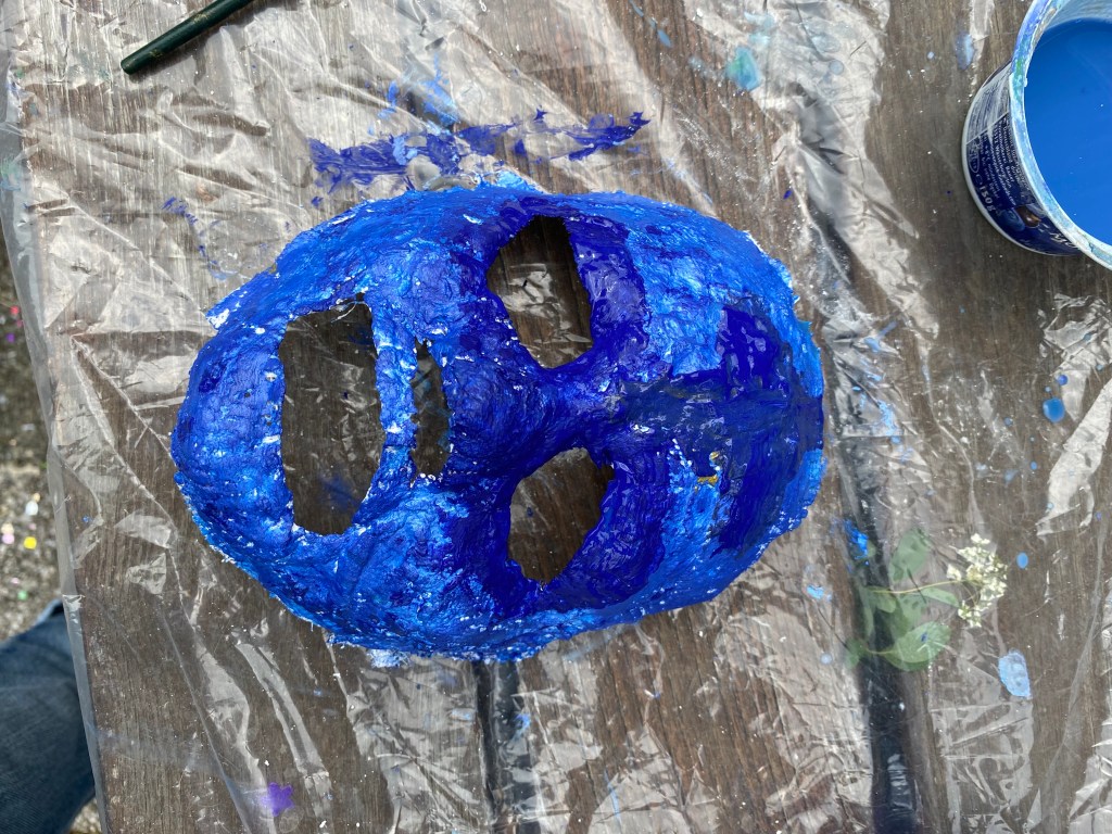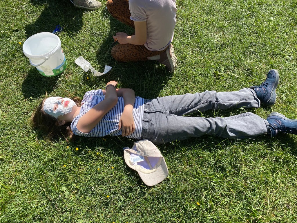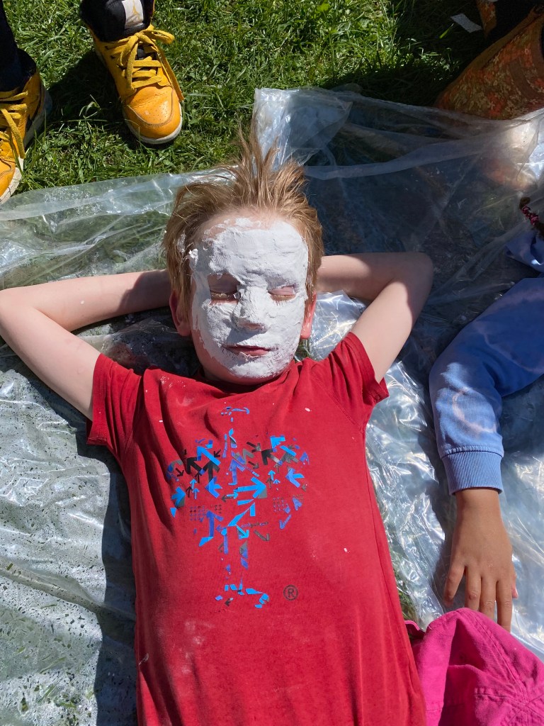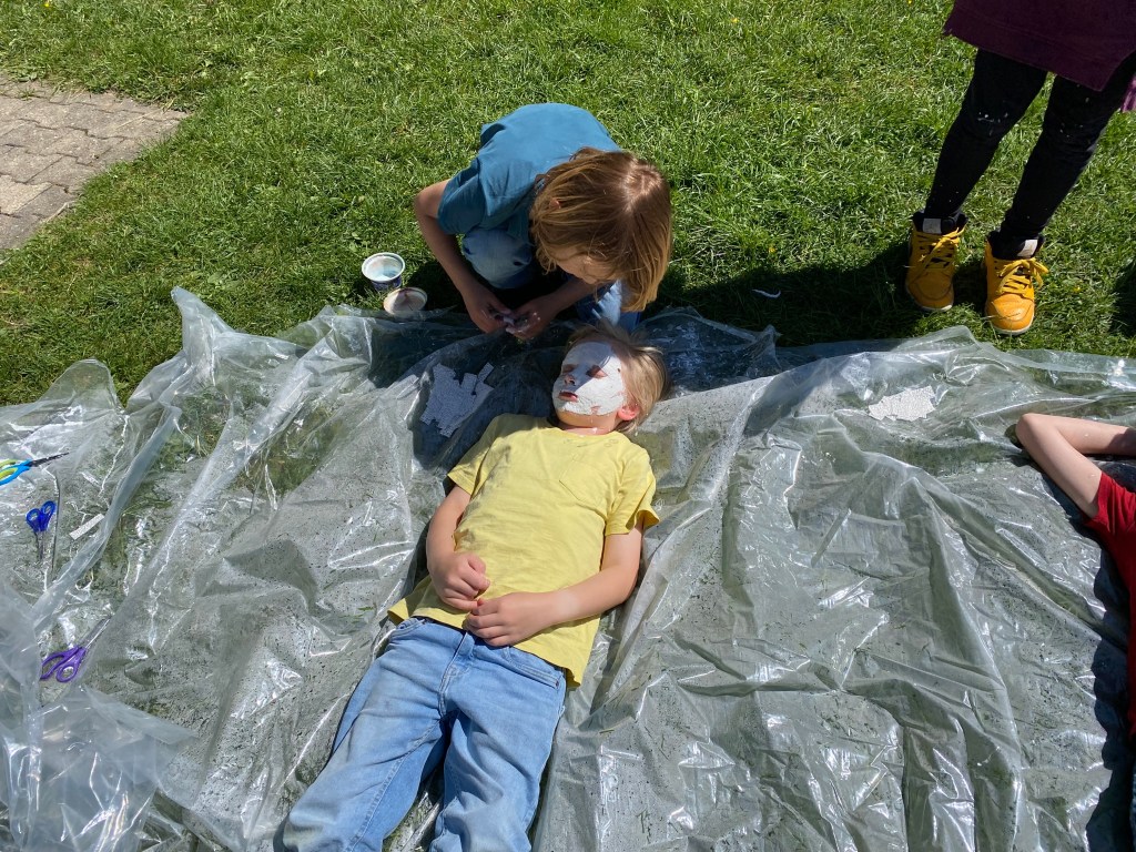 Wir haben Masken aus Gips gemacht. Als erstes mussten wir Vaseline auf das Gesicht streichen vor allen Dingen auf die Augenbrauen . Den Gips haben wir in Wasser eingetaucht und dann haben wir ihn auf die Gesichter gelegt. Mit dem nassen Gips auf dem Gesicht musste man sehr lange warten, bis es getrocknet war. Wenn man die Masken abgezogen hat, sah man alles ganz blau.