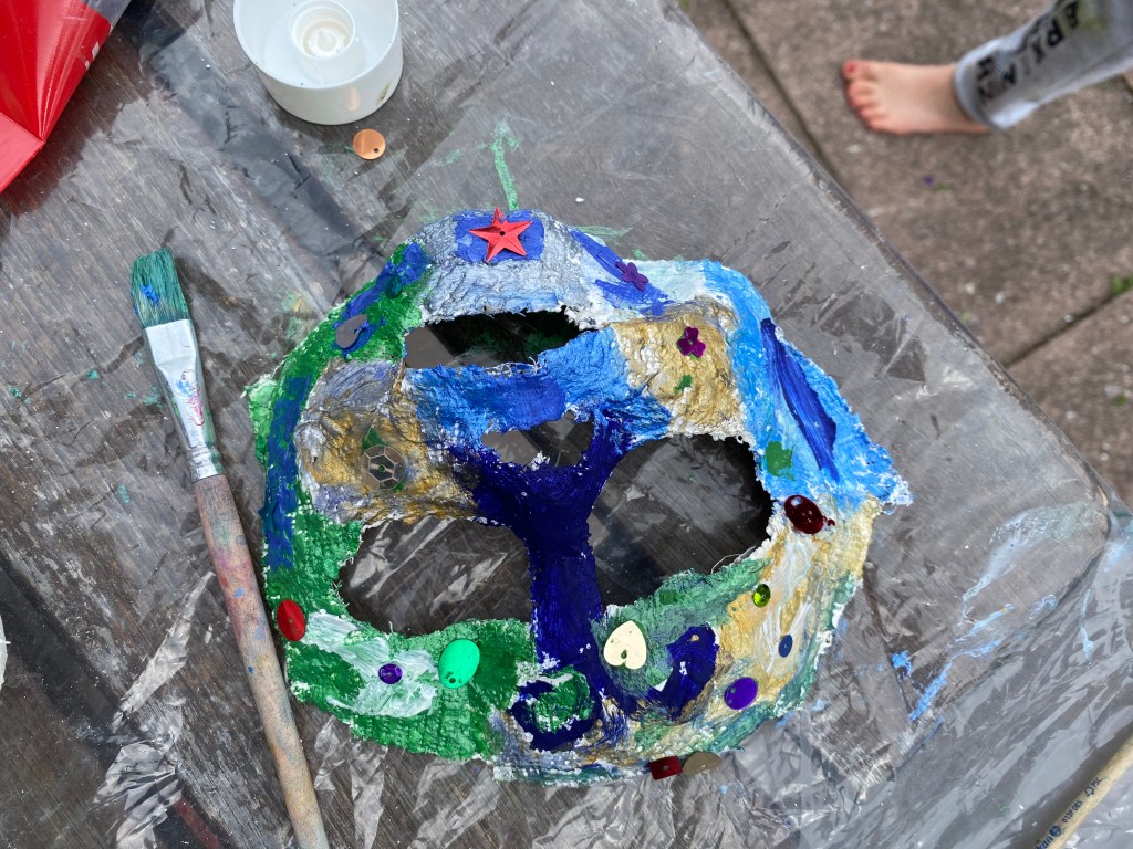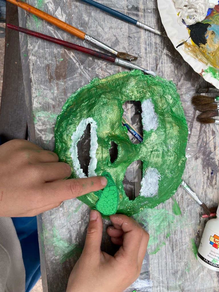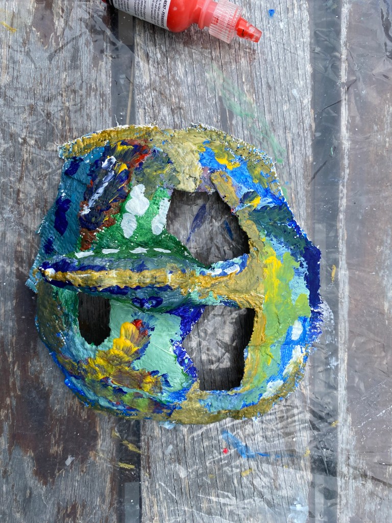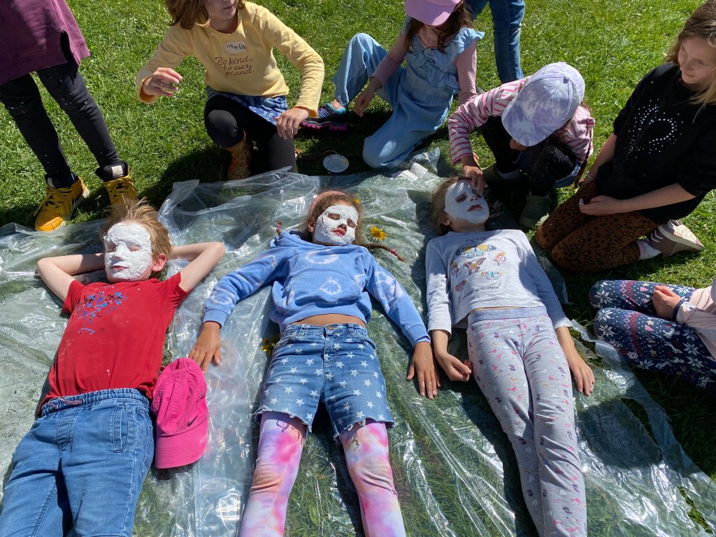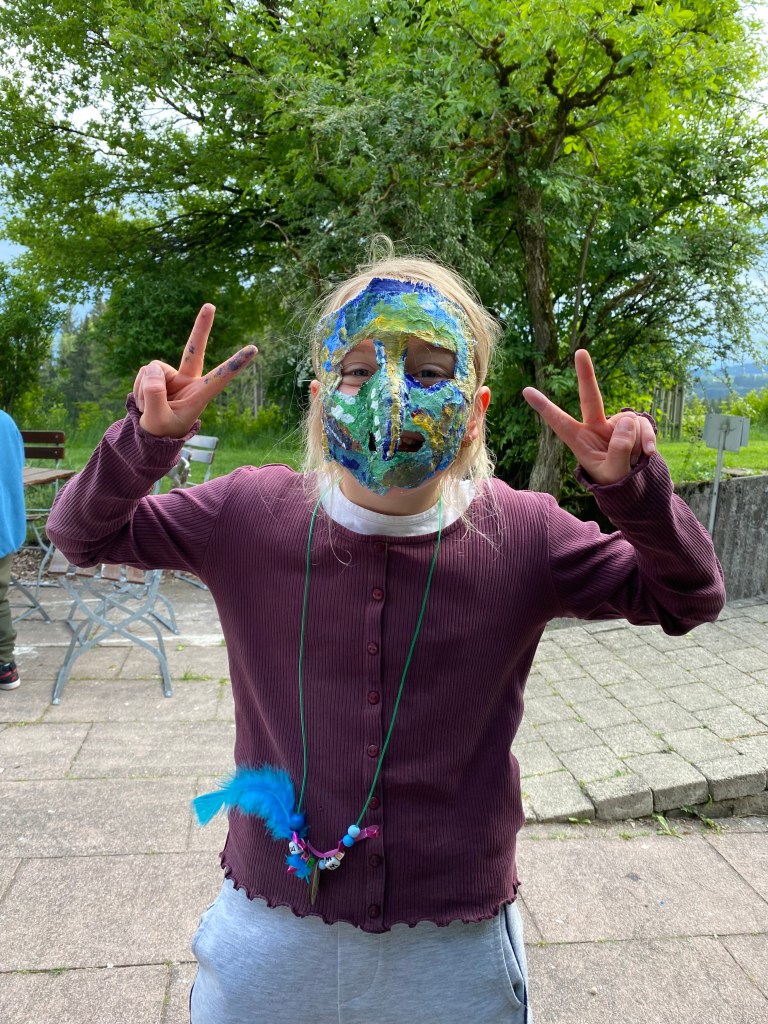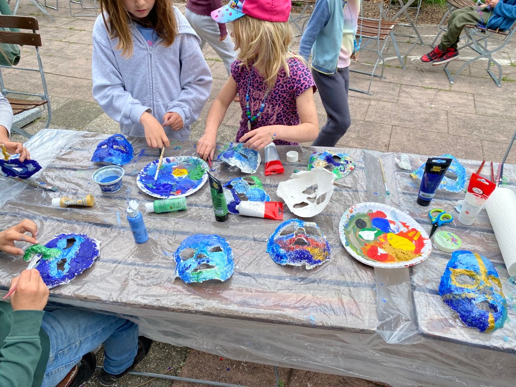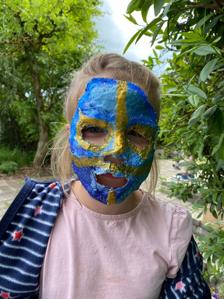 Wir haben Masken aus Gips gemacht. Als erstes mussten wir Vaseline auf das Gesicht streichen vor allen Dingen auf die Augenbrauen . Den Gips haben wir in Wasser eingetaucht und dann haben wir ihn auf die Gesichter gelegt. Mit dem nassen Gips auf dem Gesicht musste man sehr lange warten, bis es getrocknet war. Wenn man die Masken abgezogen hat, sah man alles ganz blau.