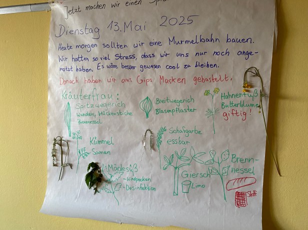 Nach der Murmelbahn Aktion ging die Kräuterwanderung los. Wir haben viele Kräuter kennengelernt zum Beispiel Spitzwegerich, Giersch, Breitwegerich und Kümmel. Anschließend sind wir wieder ins Schullandheim gelaufen. Wir haben auf dem Weg ins Schullandheim noch ein paar Kräuter gefunden. Ich sage euch jetzt noch ein paar Heilmittel auf: