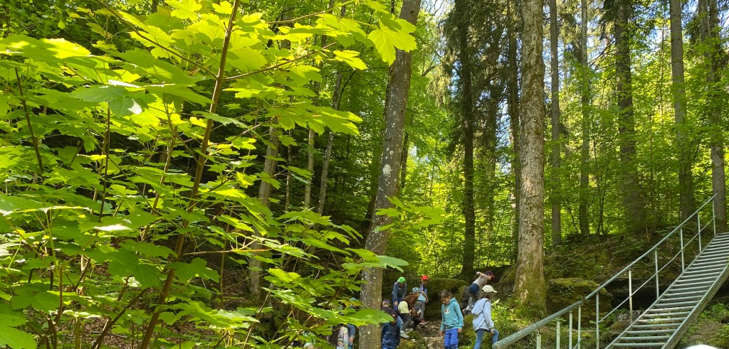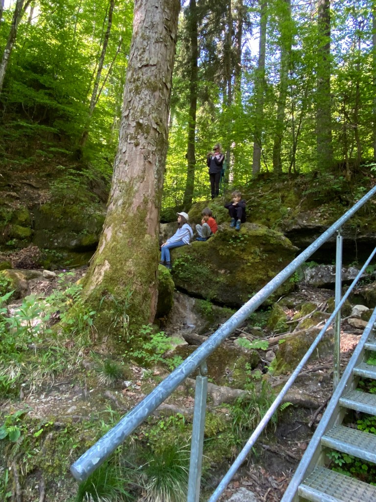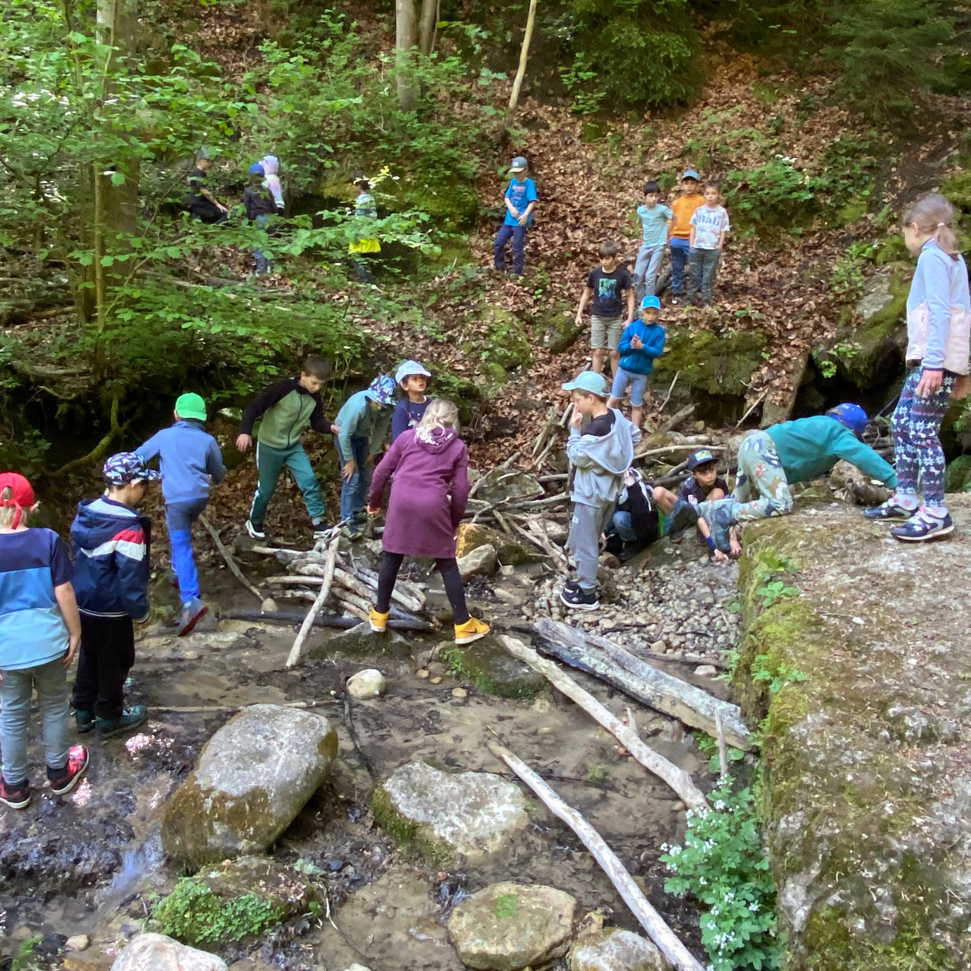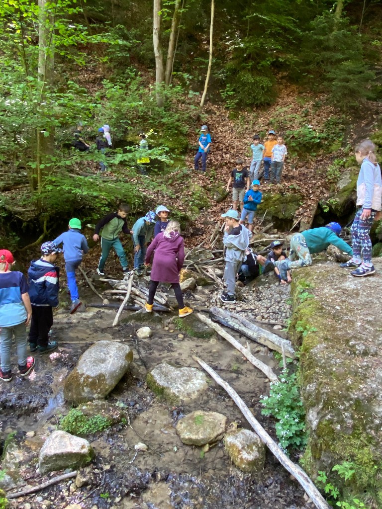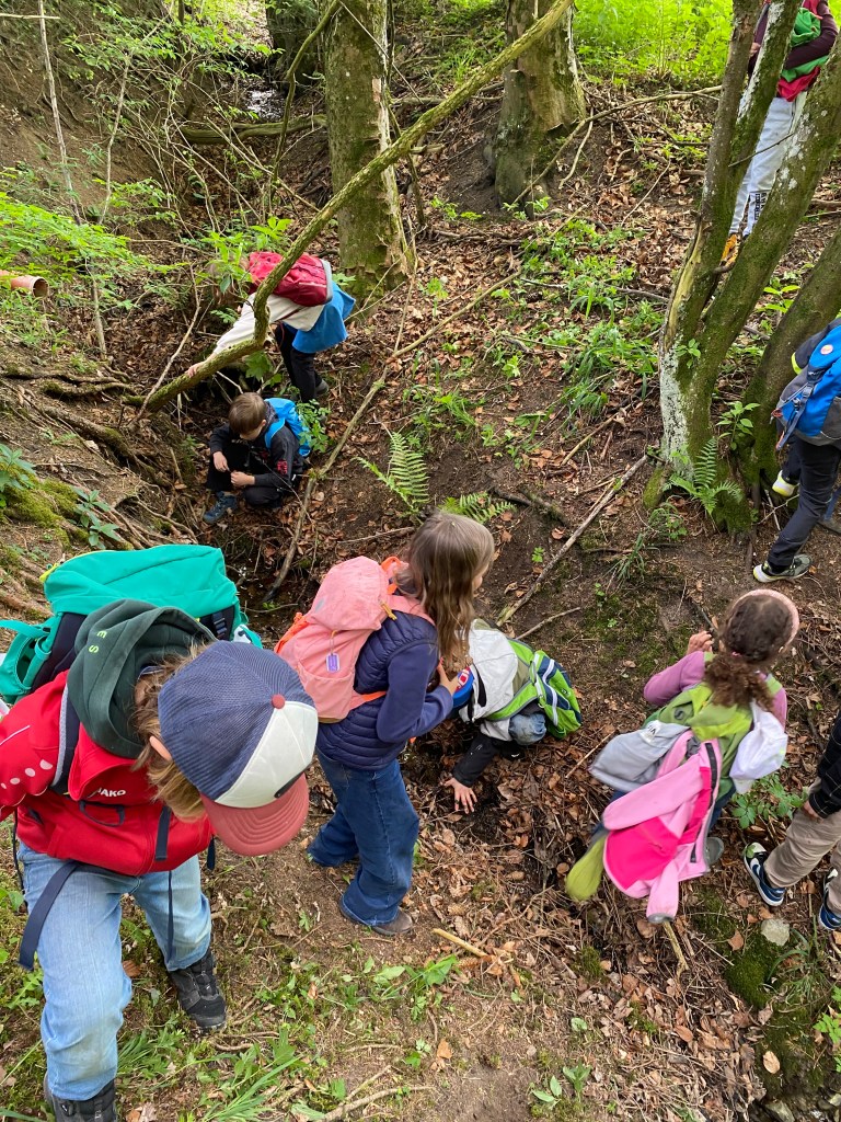 Wir sind vom Schullandheim mit dem Bus zur Feuerstein Schlucht gefahren und durch diese gewandert. Dann haben wir eine Pause gemacht und eine Brücke gebaut aus vielen Stöcken. Dann haben wir eine Tafel entdeckt. Auf der waren Tiere und Pflanzen abgebildet. Frau Hänel hat sie uns erklärt. Was hat er gemacht, der Neuntöter gemacht? Es ist ein Vogel. Er fängt Heuschrecken und steckt sie auf die Dornen am Busch dran und immer wenn er vorbei am Dornbusch kommt, holt er sich was zu essen. Wie eine Speisekammer. Auf dem Weg nach oben waren viele Wurzeln. Wir sind auch über viele Treppen gegangen. Wir haben viele Brücken gezählt und dort im Bach haben wir Frösche gefunden. In der Schlucht sind wir auf Steinen rumgeklettert und haben auch Kröten gesehen. Manche haben sie angefasst.