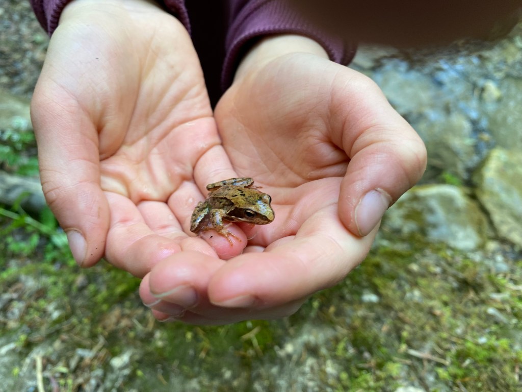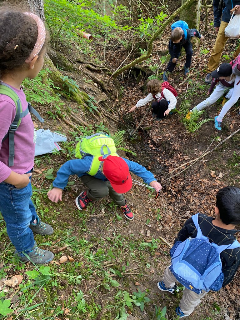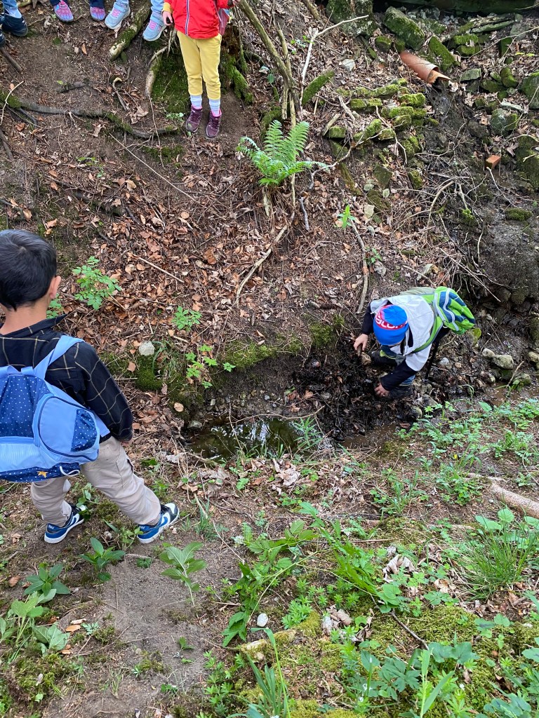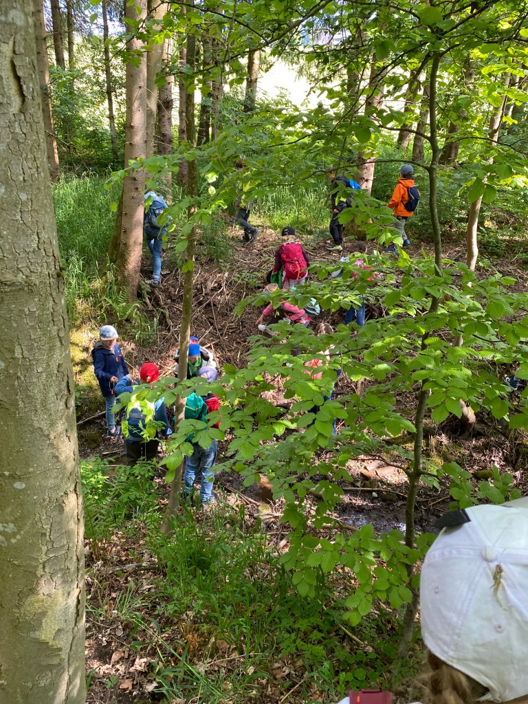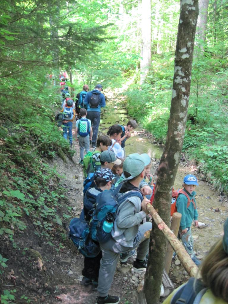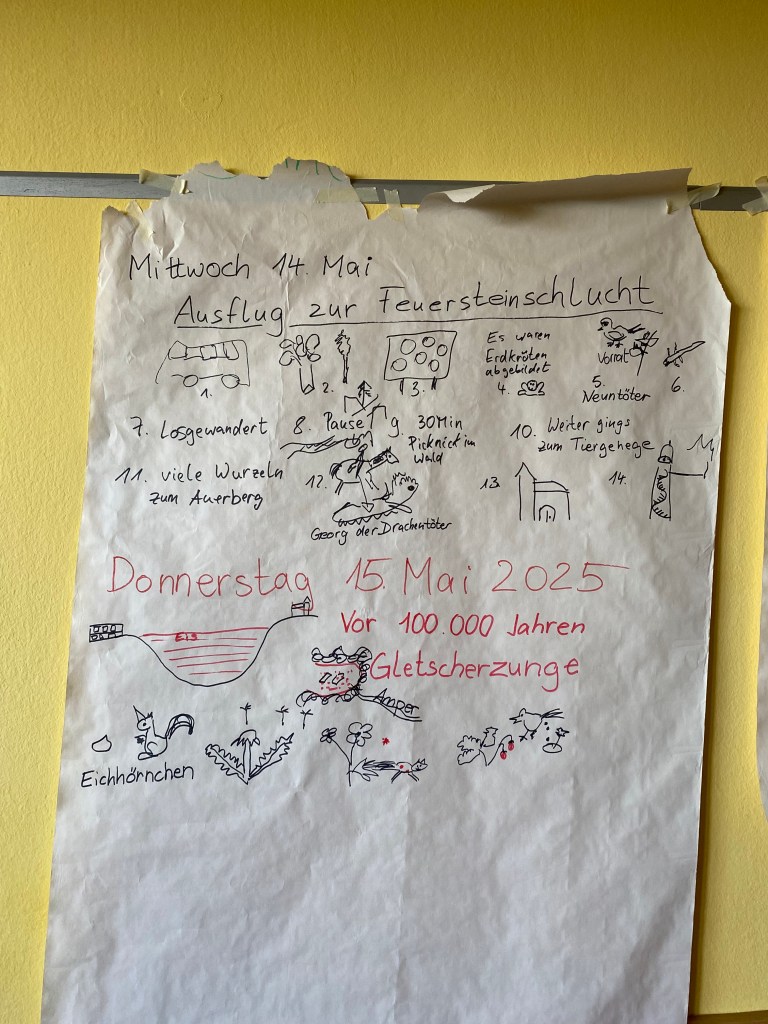 Wir sind vom Schullandheim mit dem Bus zur Feuerstein Schlucht gefahren und durch diese gewandert. Dann haben wir eine Pause gemacht und eine Brücke gebaut aus vielen Stöcken. Dann haben wir eine Tafel entdeckt. Auf der waren Tiere und Pflanzen abgebildet. Frau Hänel hat sie uns erklärt. Was hat er gemacht, der Neuntöter gemacht? Es ist ein Vogel. Er fängt Heuschrecken und steckt sie auf die Dornen am Busch dran und immer wenn er vorbei am Dornbusch kommt, holt er sich was zu essen. Wie eine Speisekammer. Auf dem Weg nach oben waren viele Wurzeln. Wir sind auch über viele Treppen gegangen. Wir haben viele Brücken gezählt und dort im Bach haben wir Frösche gefunden. In der Schlucht sind wir auf Steinen rumgeklettert und haben auch Kröten gesehen. Manche haben sie angefasst.