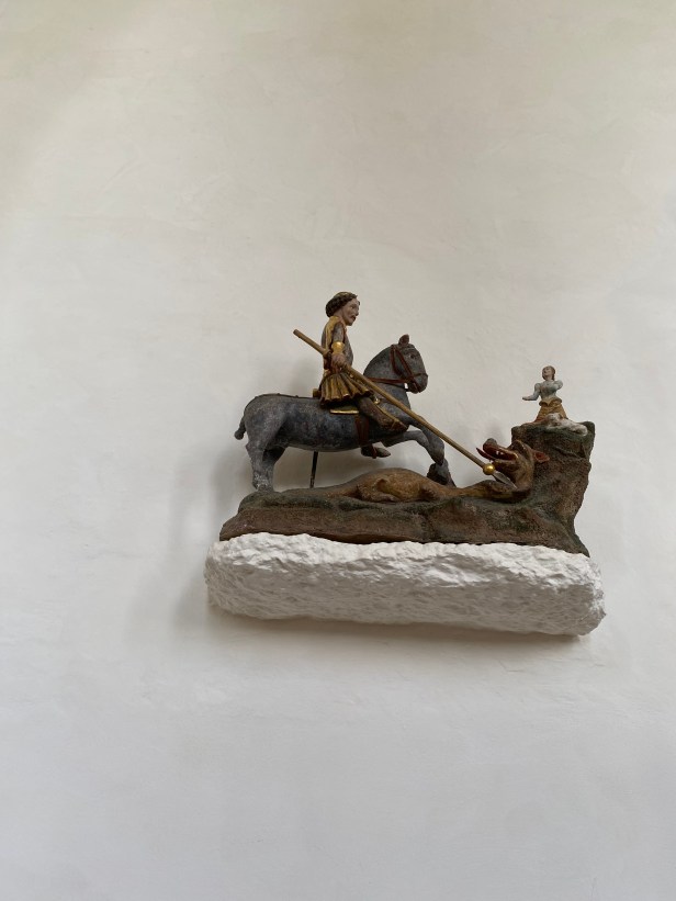 Es war einmal ein Kind und ein Mann und eine Frau. Das Kind hatte Durst. Der Vater hat das Wasser geholt. Er ging zum Brunnen. Er holte Wasser. Am nächsten Tag waren sie umzingelt von Soldaten. Alle Dorfbewohner hatten Durst. Die Mutigste des Dorfes, sagte: „Ich gehe rüber zum Brunnen!“ Alle staunen. Sie schlich sich zum Brunnen. Sie war am Brunnen, doch dann kam ein Drache auf sie zu. Der Drache wollte sie töten, doch ein Soldat kam vorbeigeritten und rettete sie. Es war Georg der Drachentöter. Die Dorfbewohner feierten ein Fest.