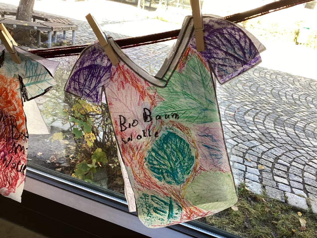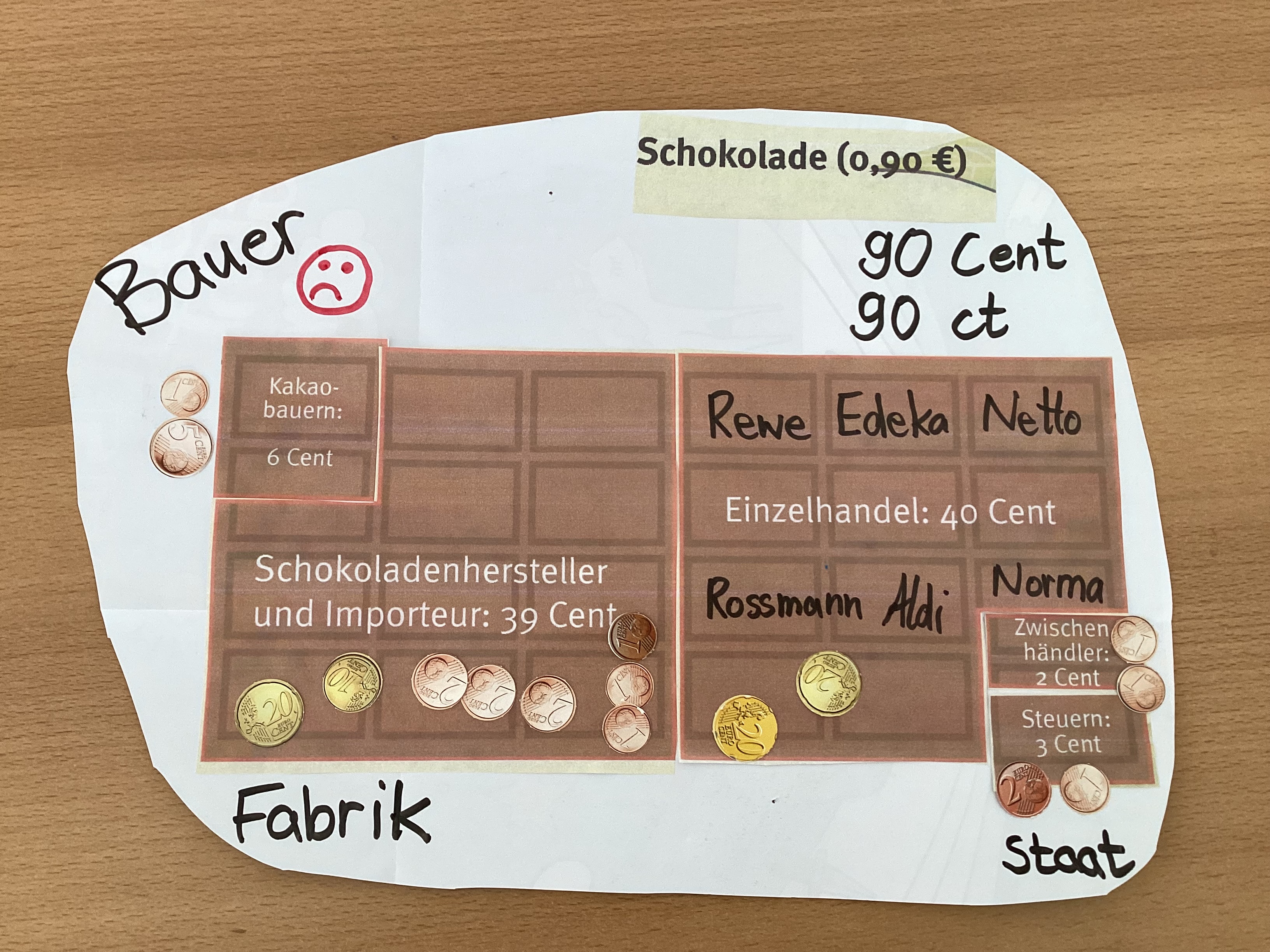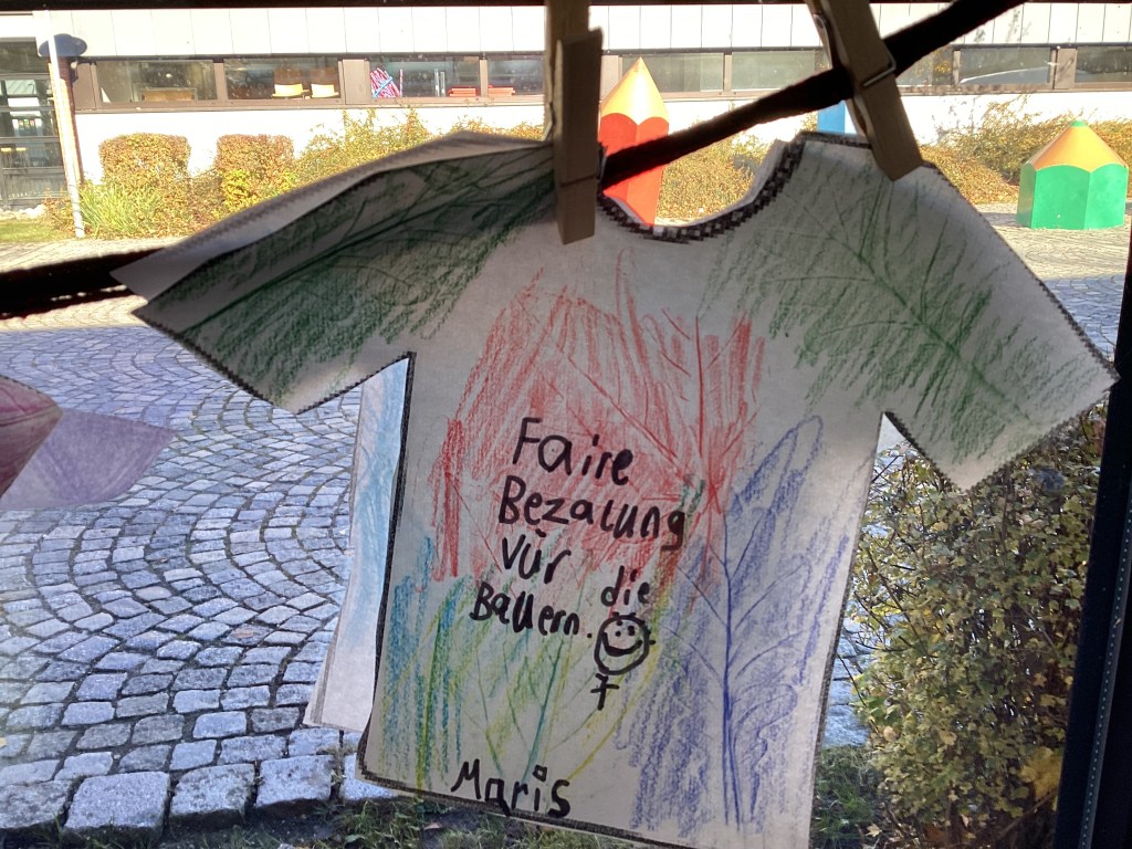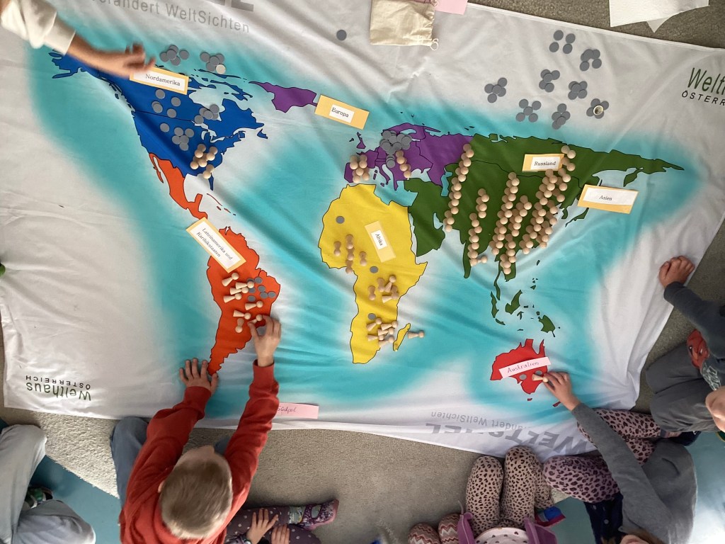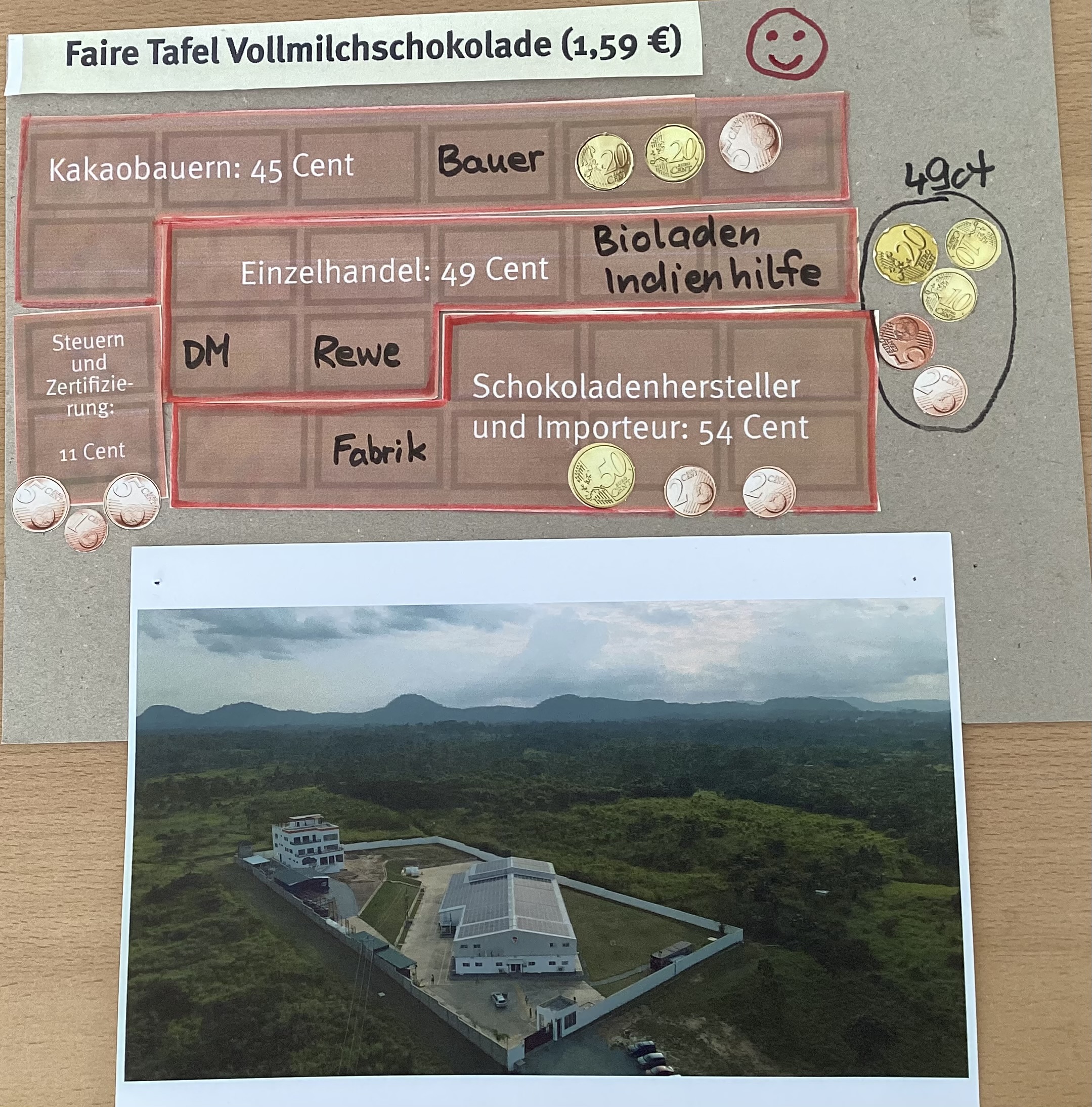 Hier leben wir und am Äquator wachsen Kakaobäume oder Bananen. Die Bauern sollen eine Arbeit haben. Die Kinder, die zur Schule gehen, haben dann eine Arbeit.