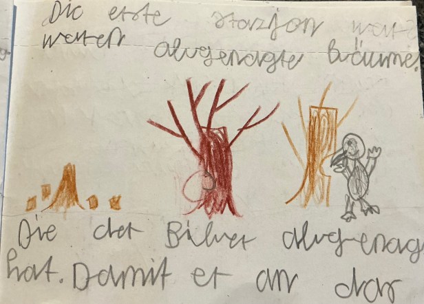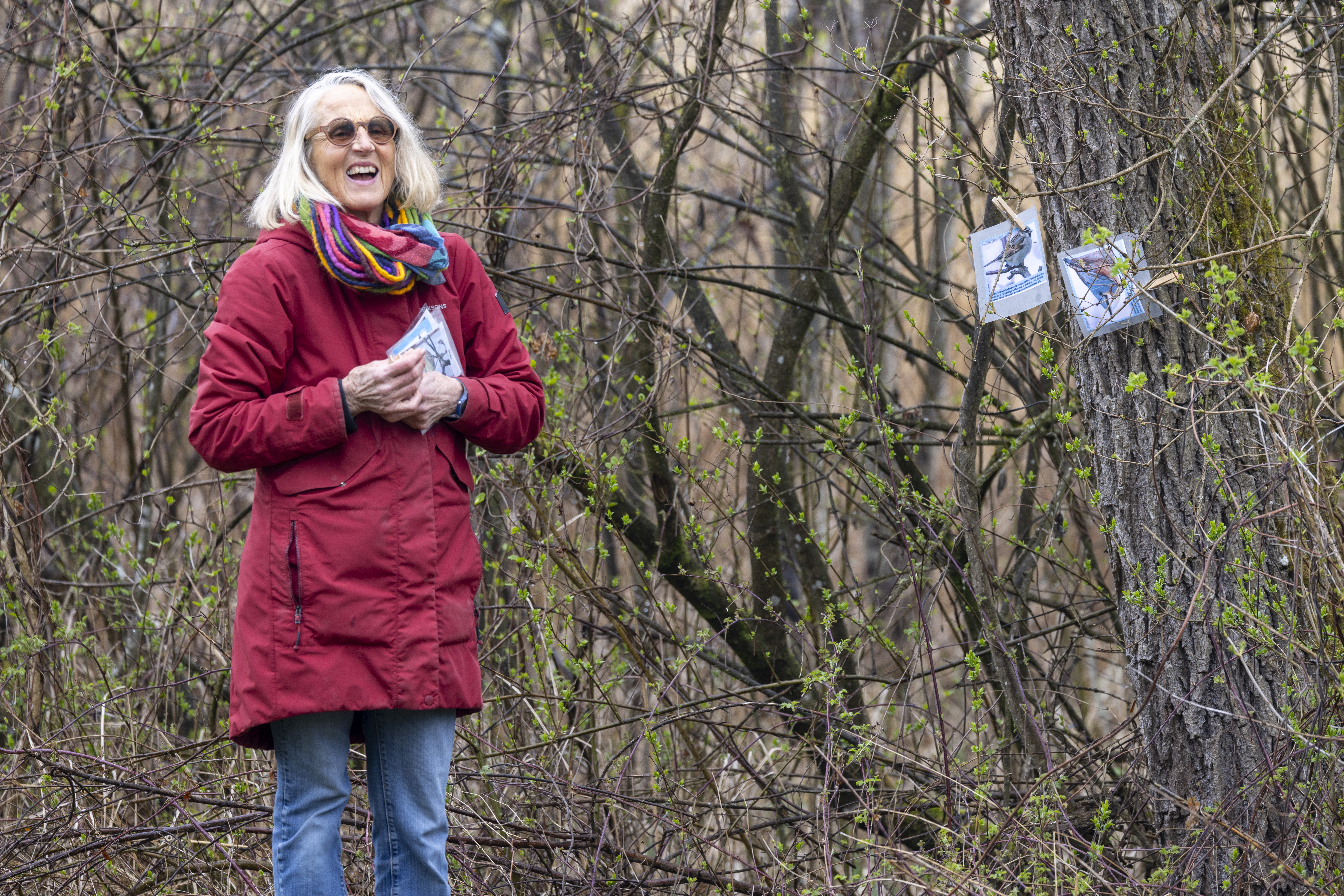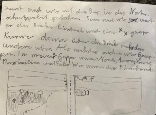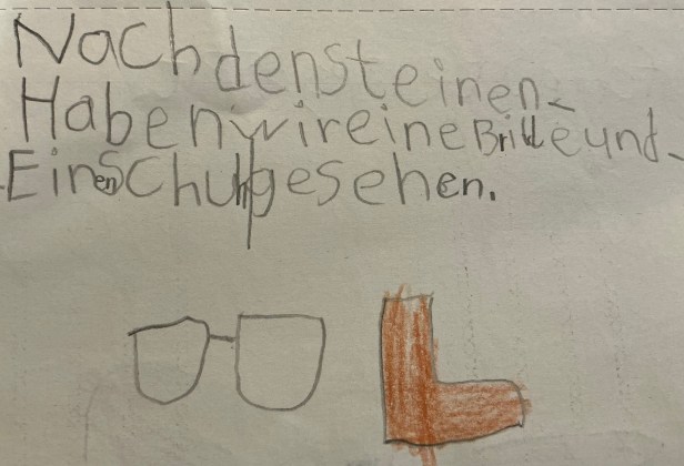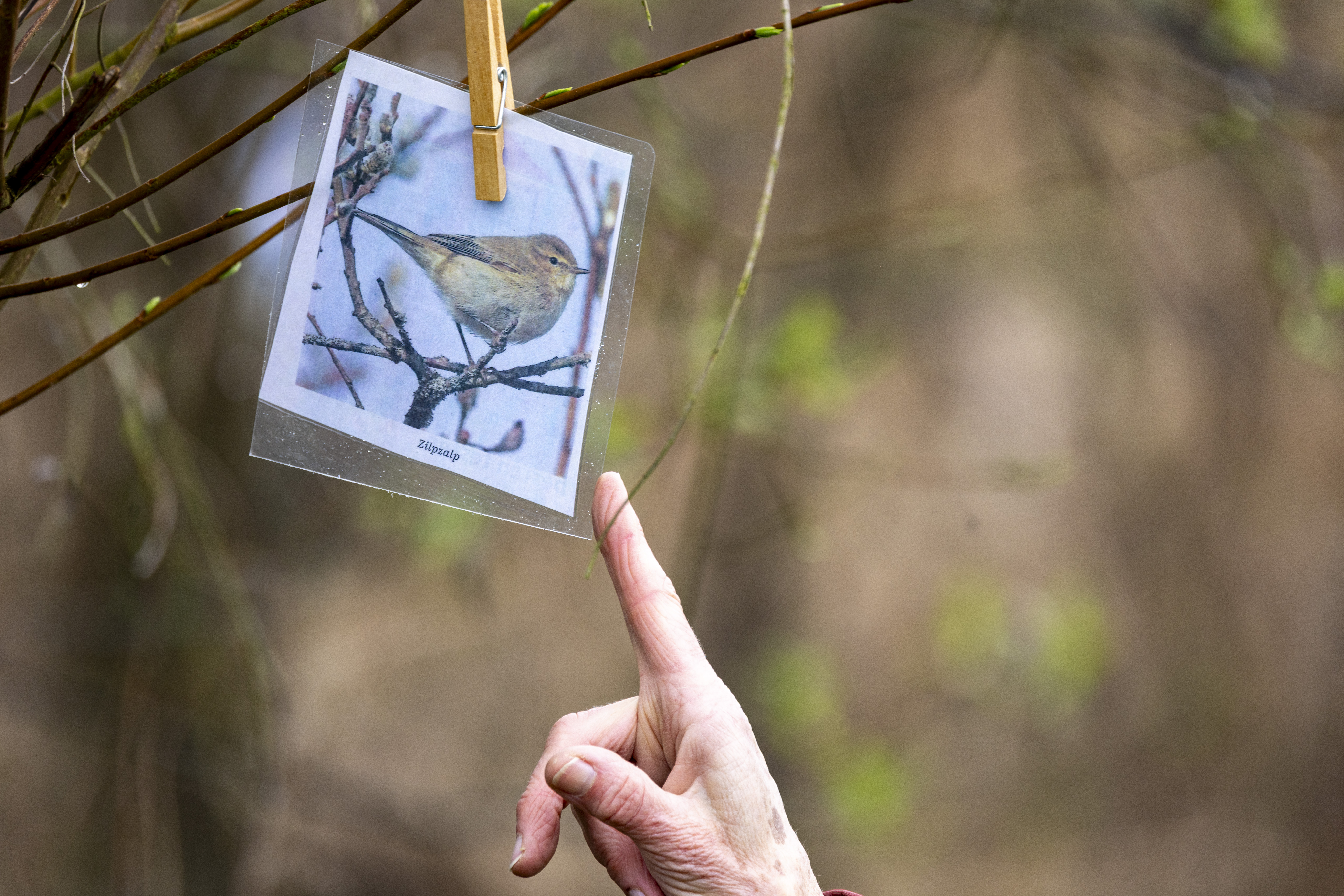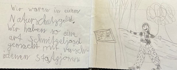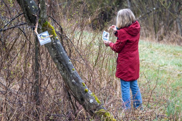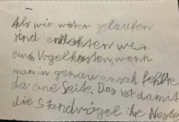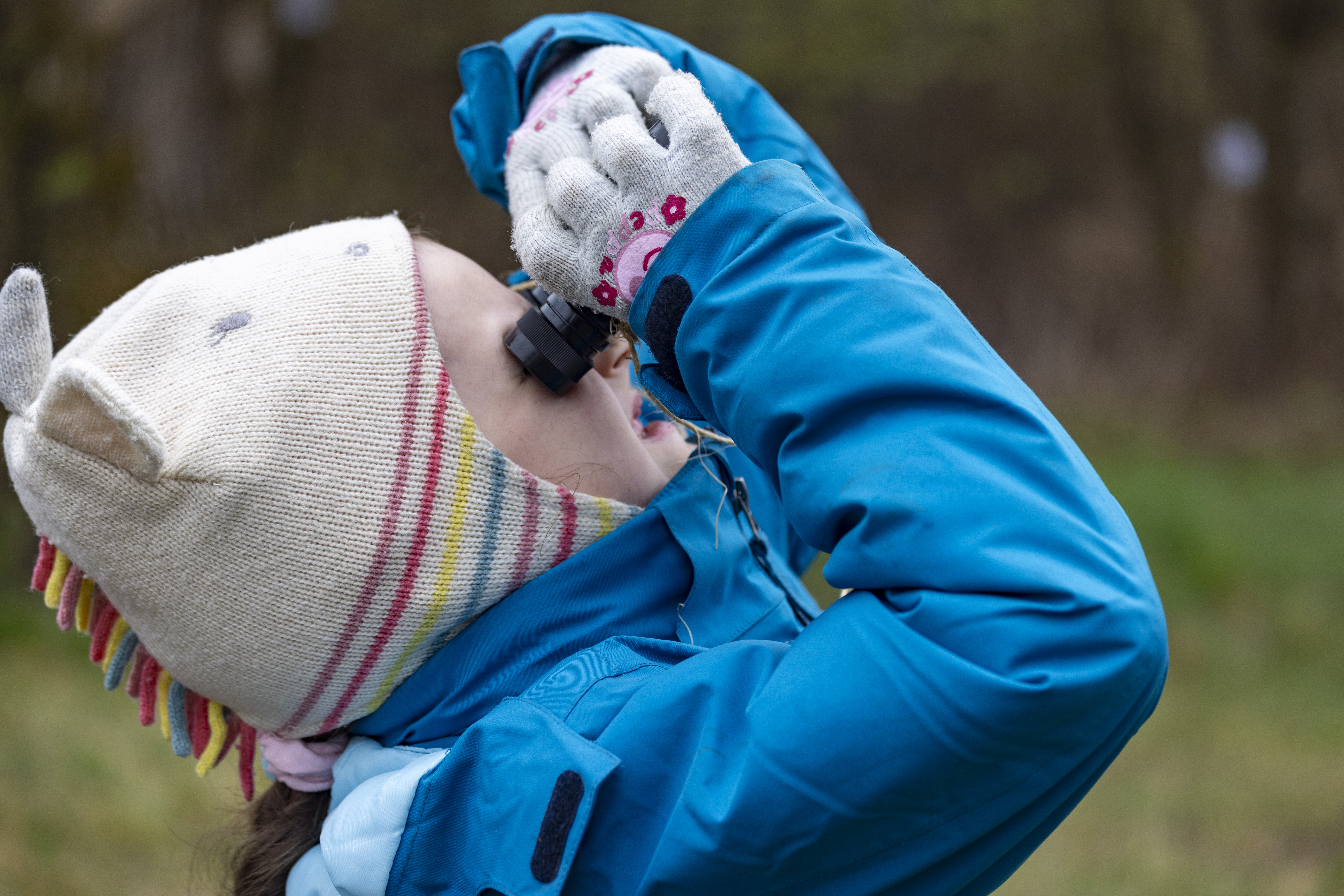 Wir üben mit den Ferngläsern die Vögel zu erkennen. Frau Hänel versteckt Fotos in den Büschen. Das Schauen mit dem Fernglas ist ganz schön schwer.