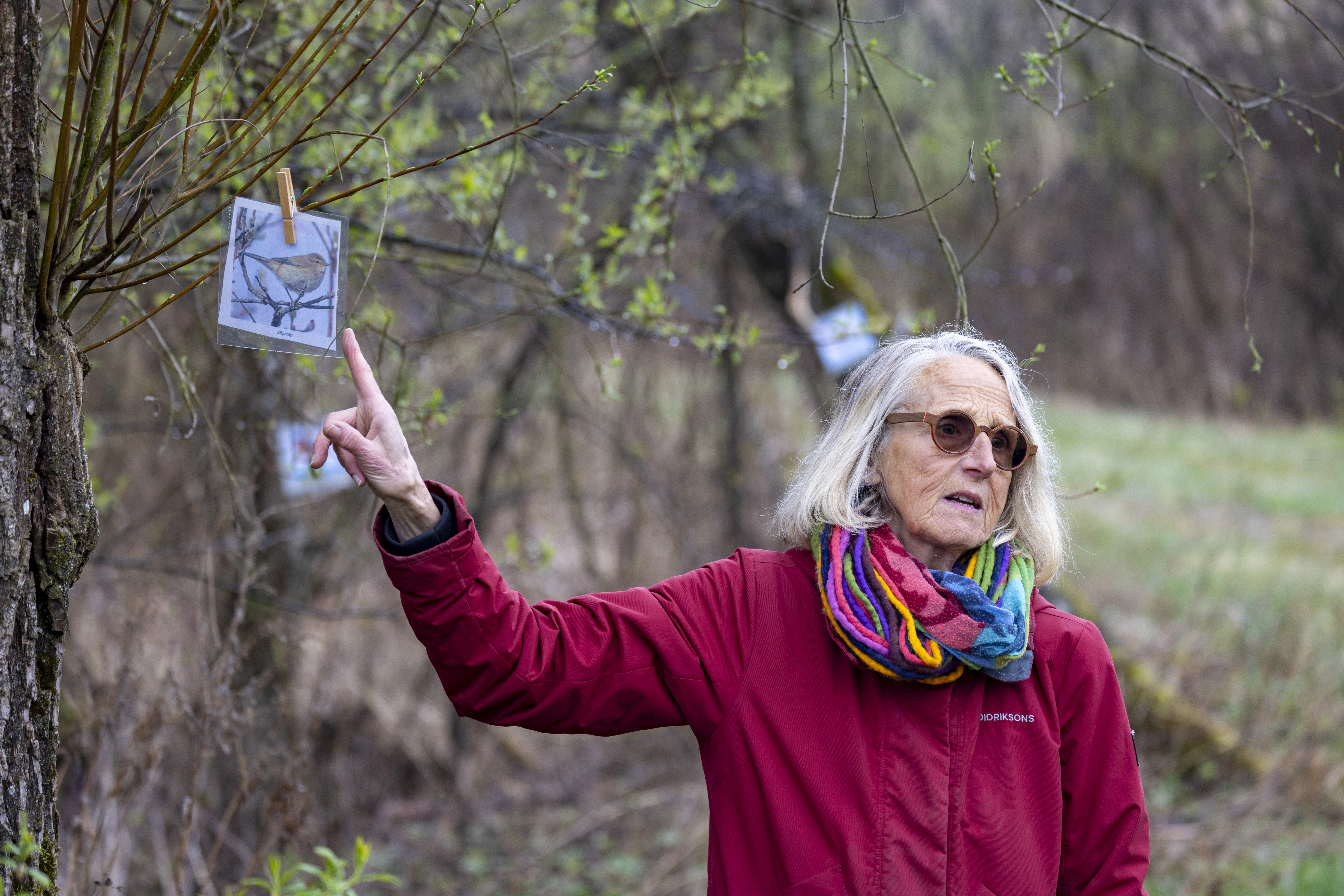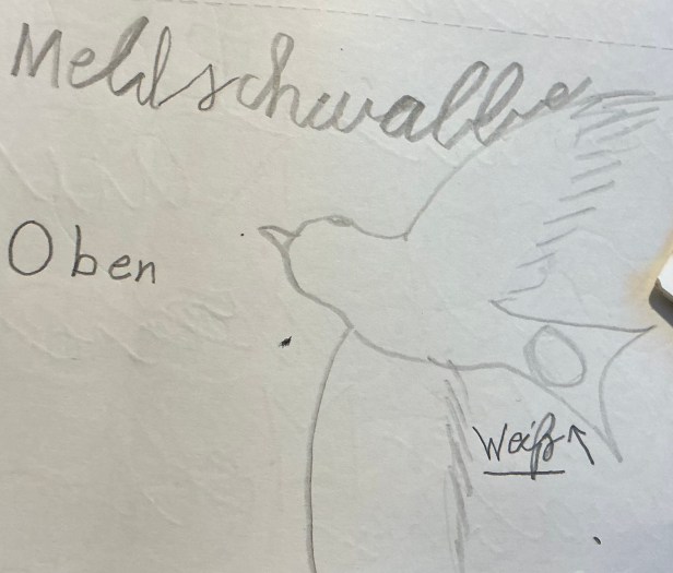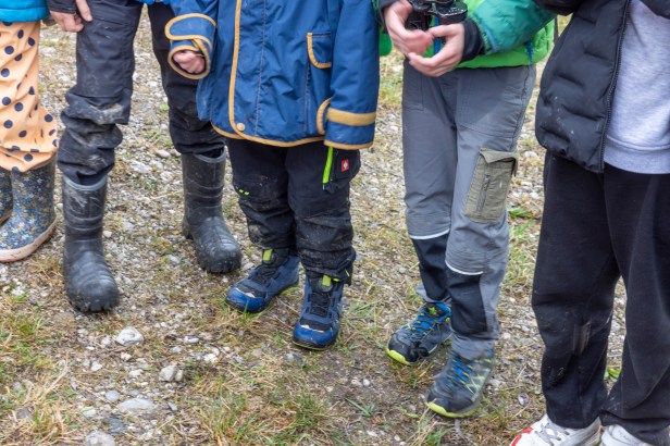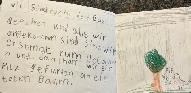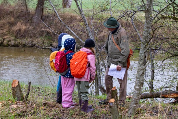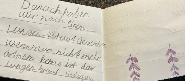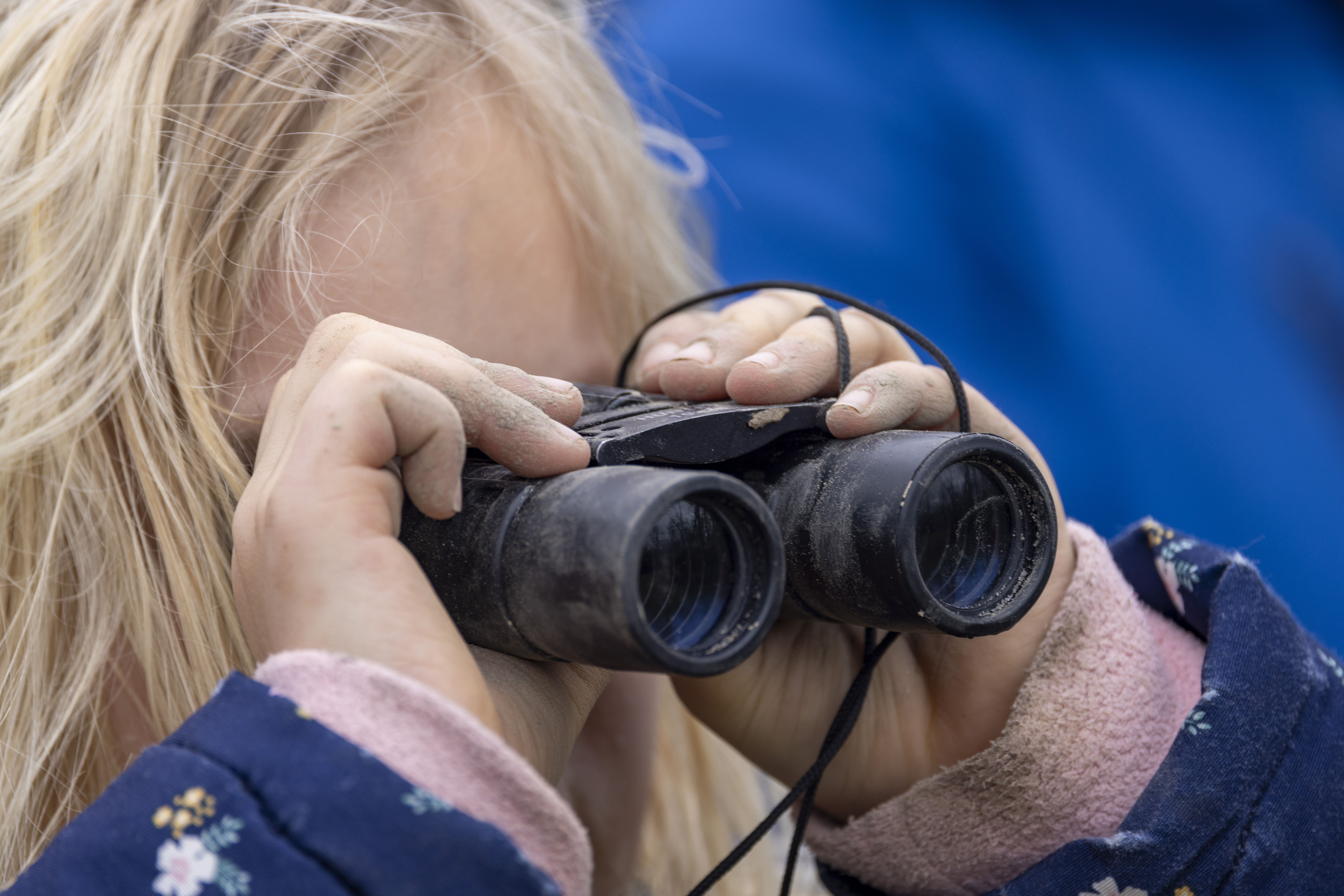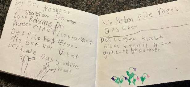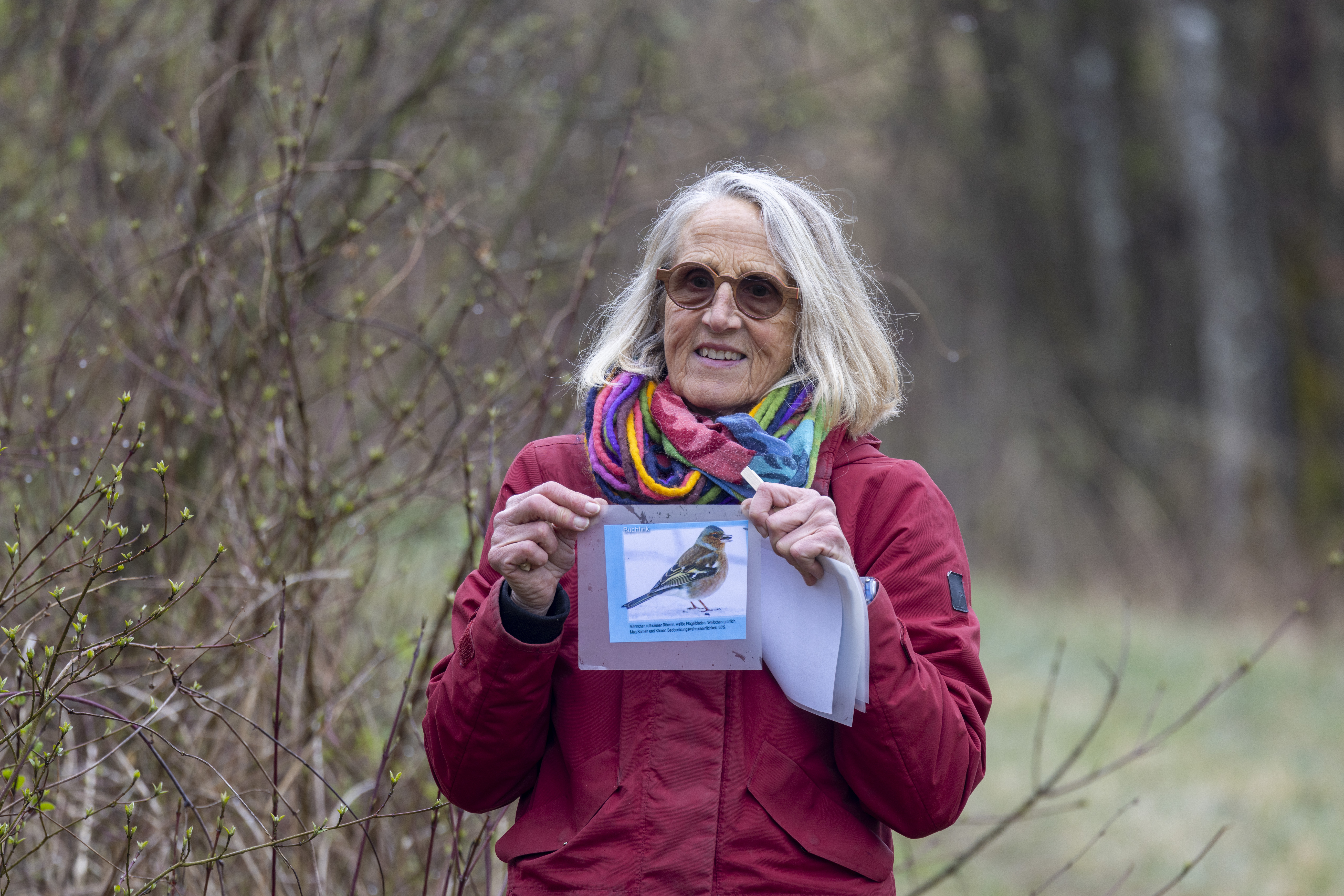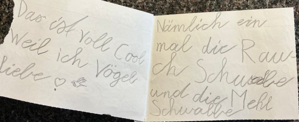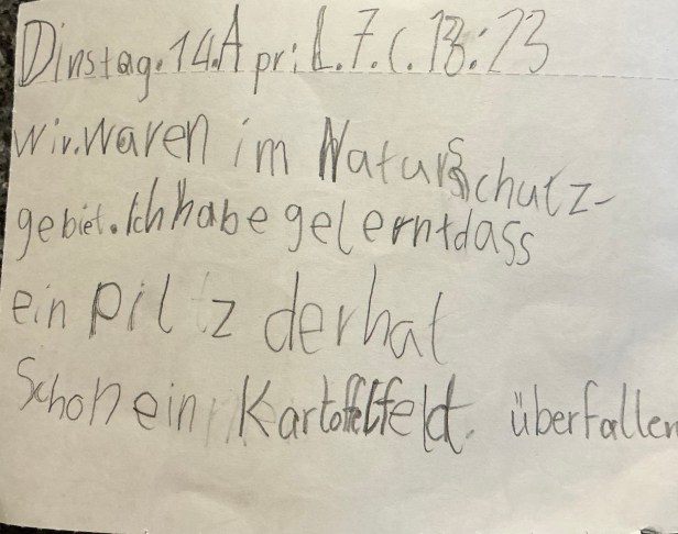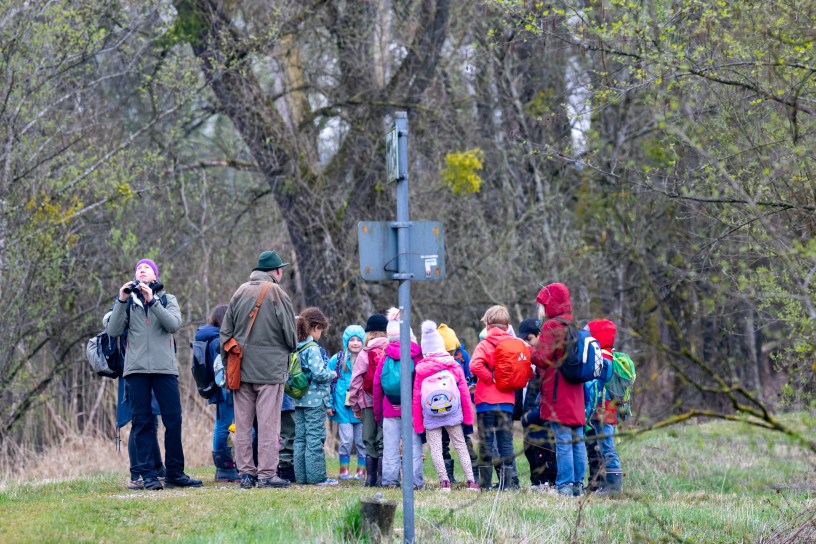 Wir üben mit den Ferngläsern die Vögel zu erkennen. Frau Hänel versteckt Fotos in den Büschen. Das Schauen mit dem Fernglas ist ganz schön schwer.