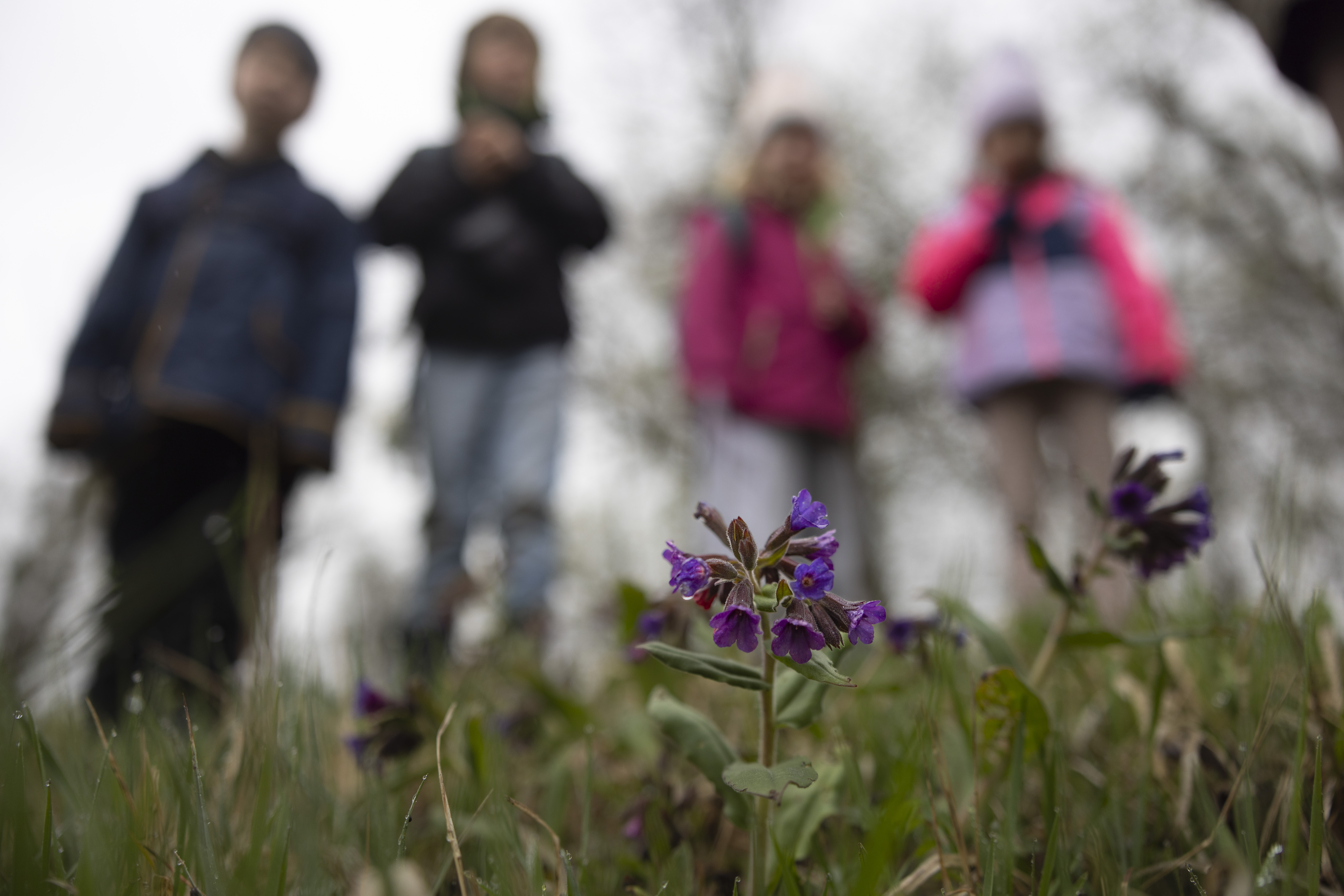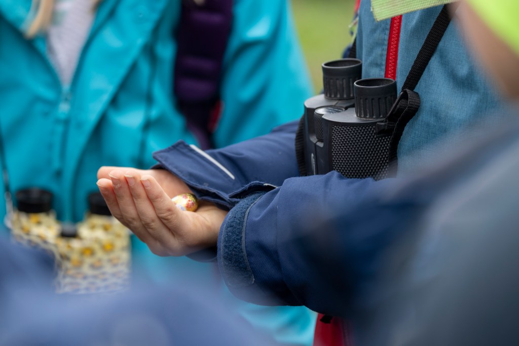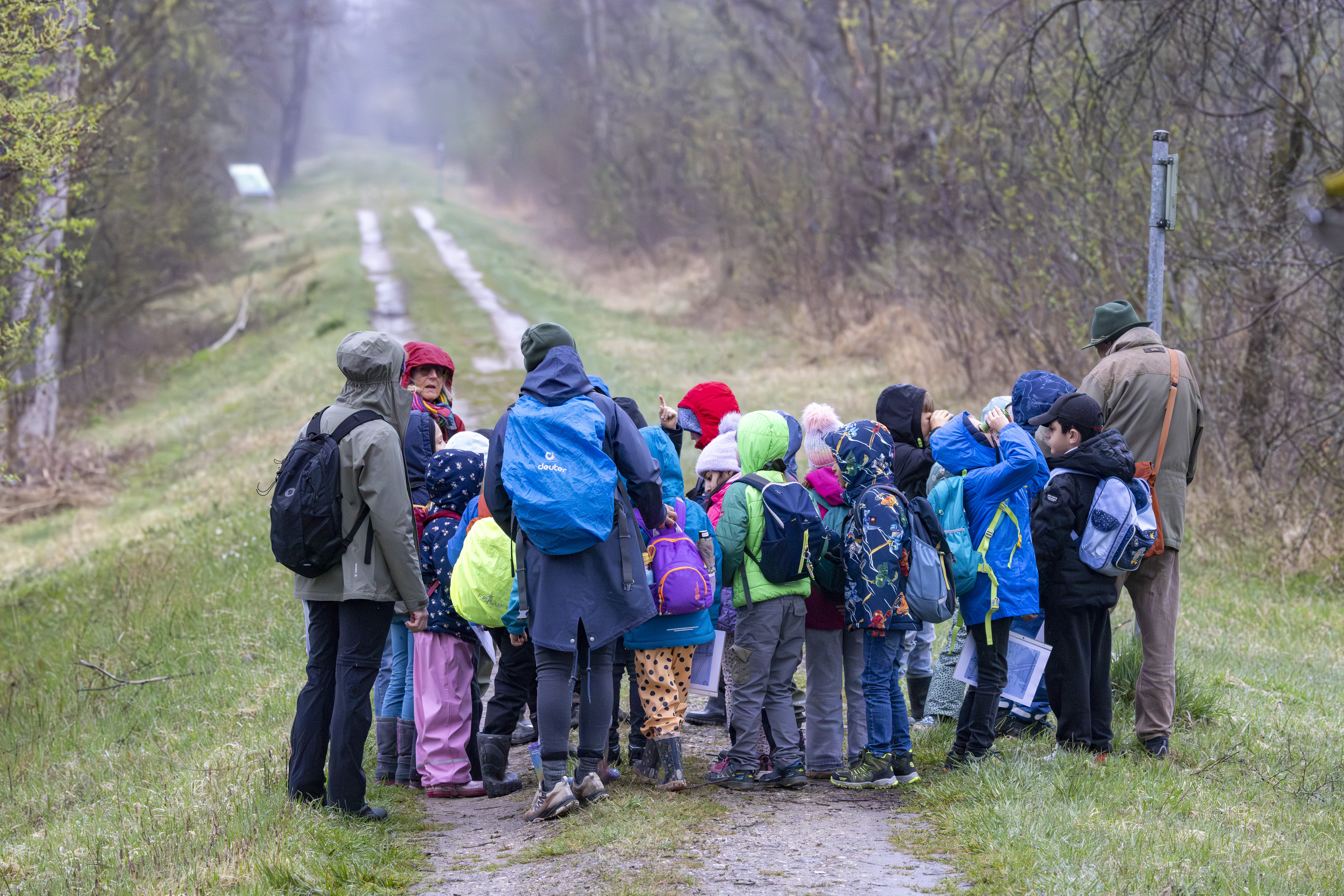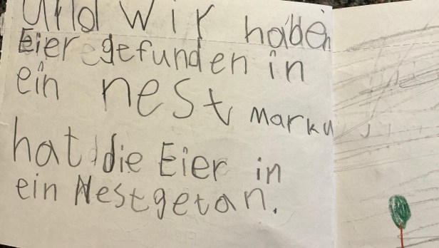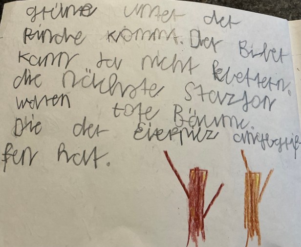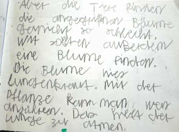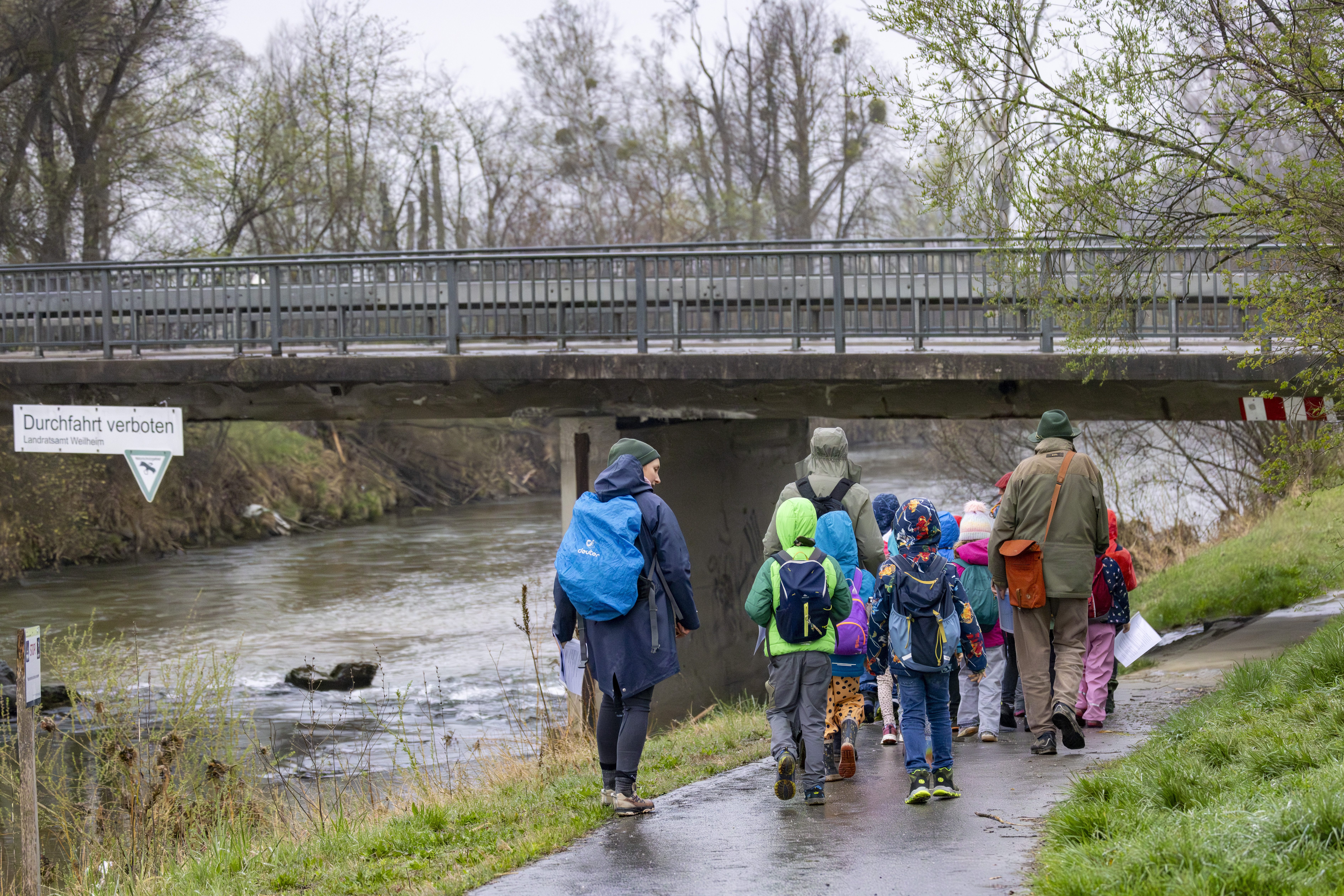 Wir üben mit den Ferngläsern die Vögel zu erkennen. Frau Hänel versteckt Fotos in den Büschen. Das Schauen mit dem Fernglas ist ganz schön schwer.